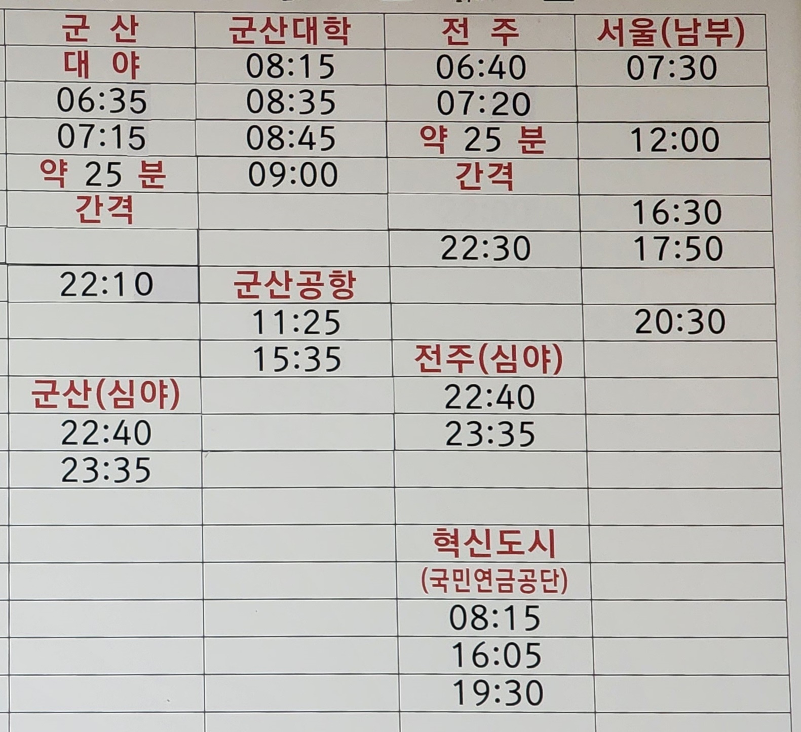 익산 출발 군산, 대야, 군산대학, 전주, 서울 남부 방면.
