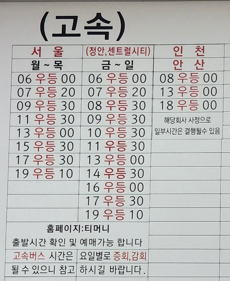 익산 출발 서울, 정안, 센트럴시티 .인천, 안산 방면.