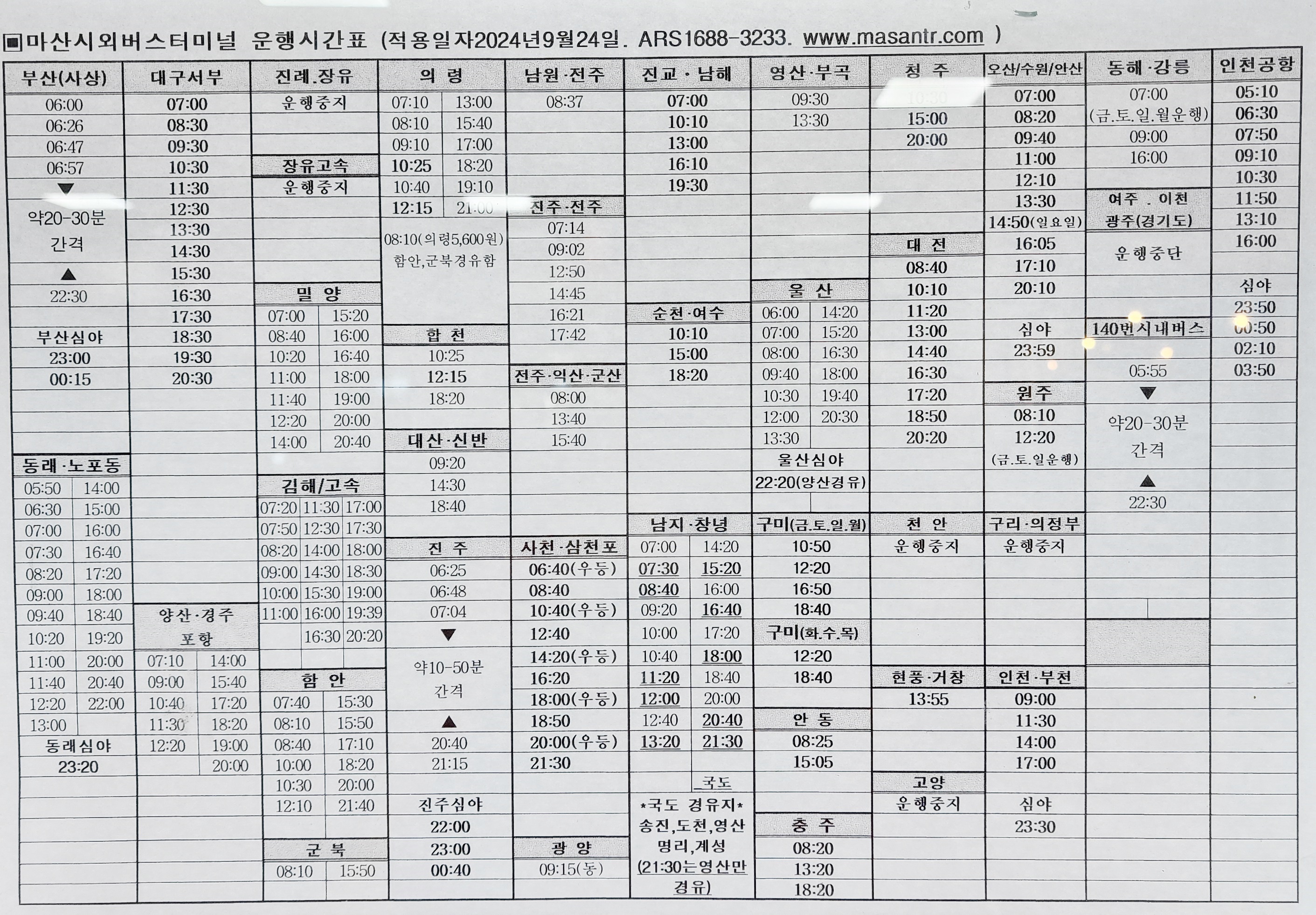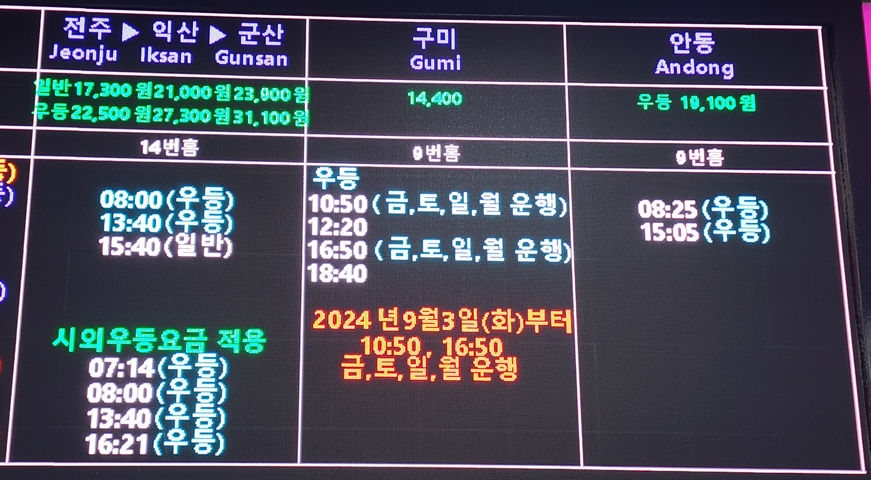 마산 출발 전주, 익산, 군산, 구미, 안동 방면.