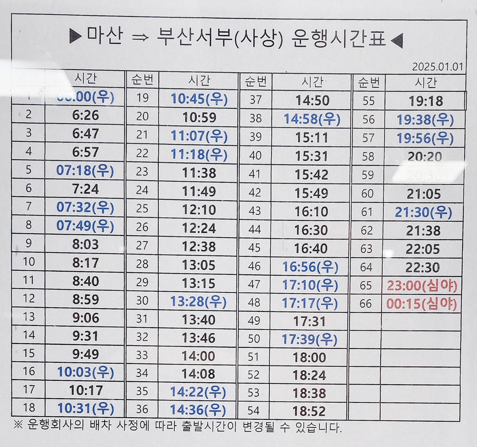 마산 출발 부산 사상, 동래, 노포, 양산, 경주, 포항, 대구 서부, 밀양, 김해, 함안, 군북 방면.