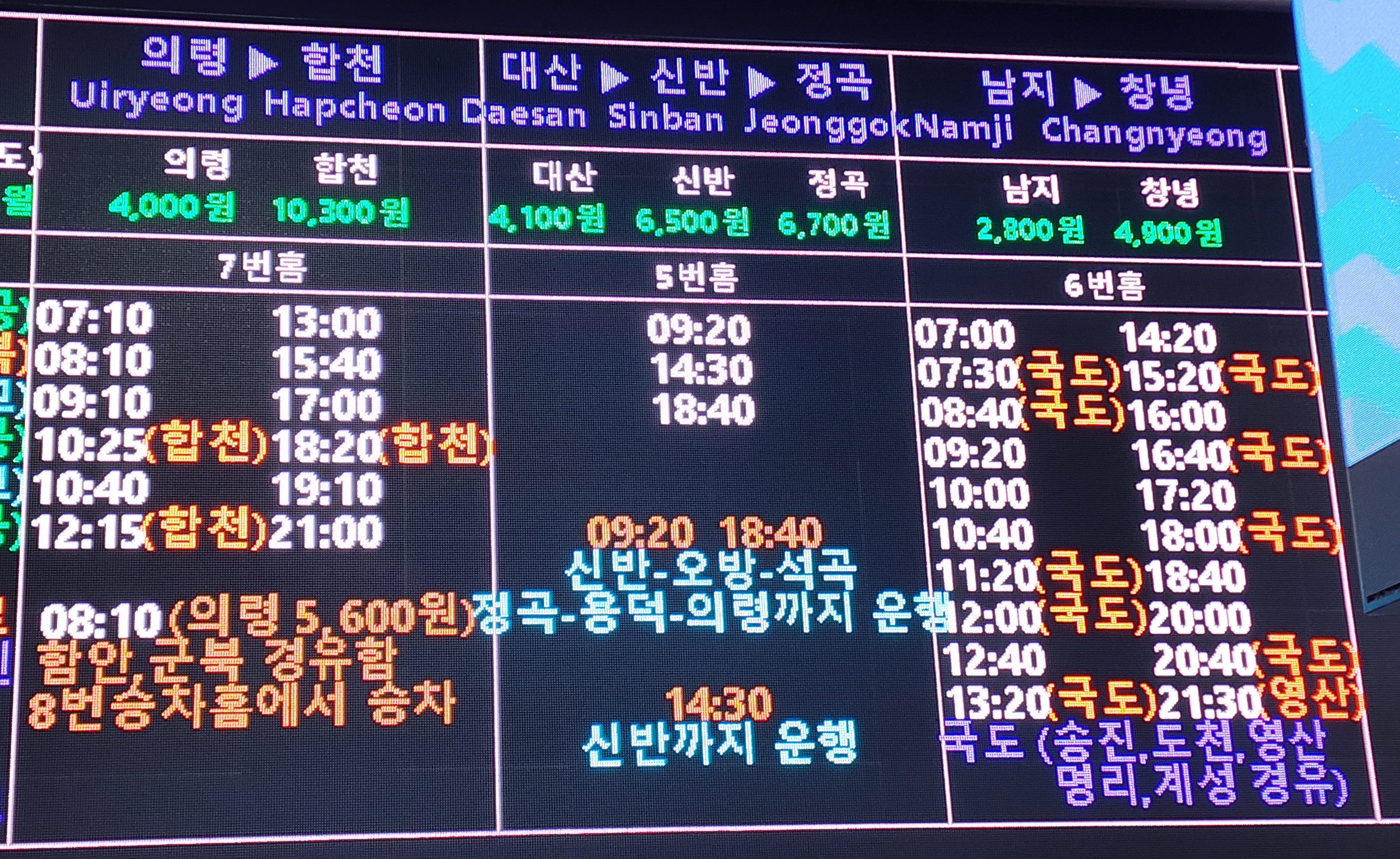 마산 출발 의령, 합천, 대산, 신반, 정곡, 남지, 창녕 방면.