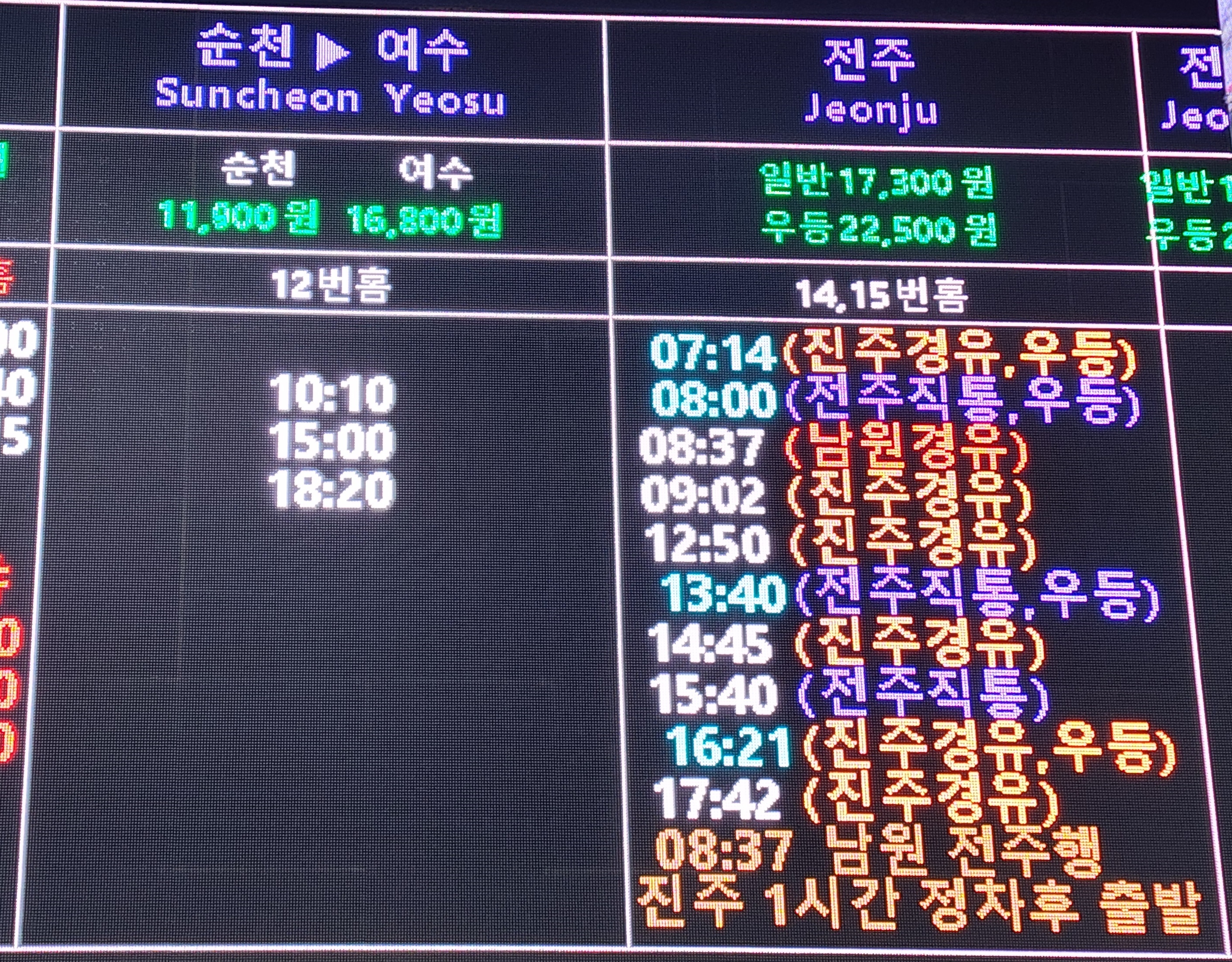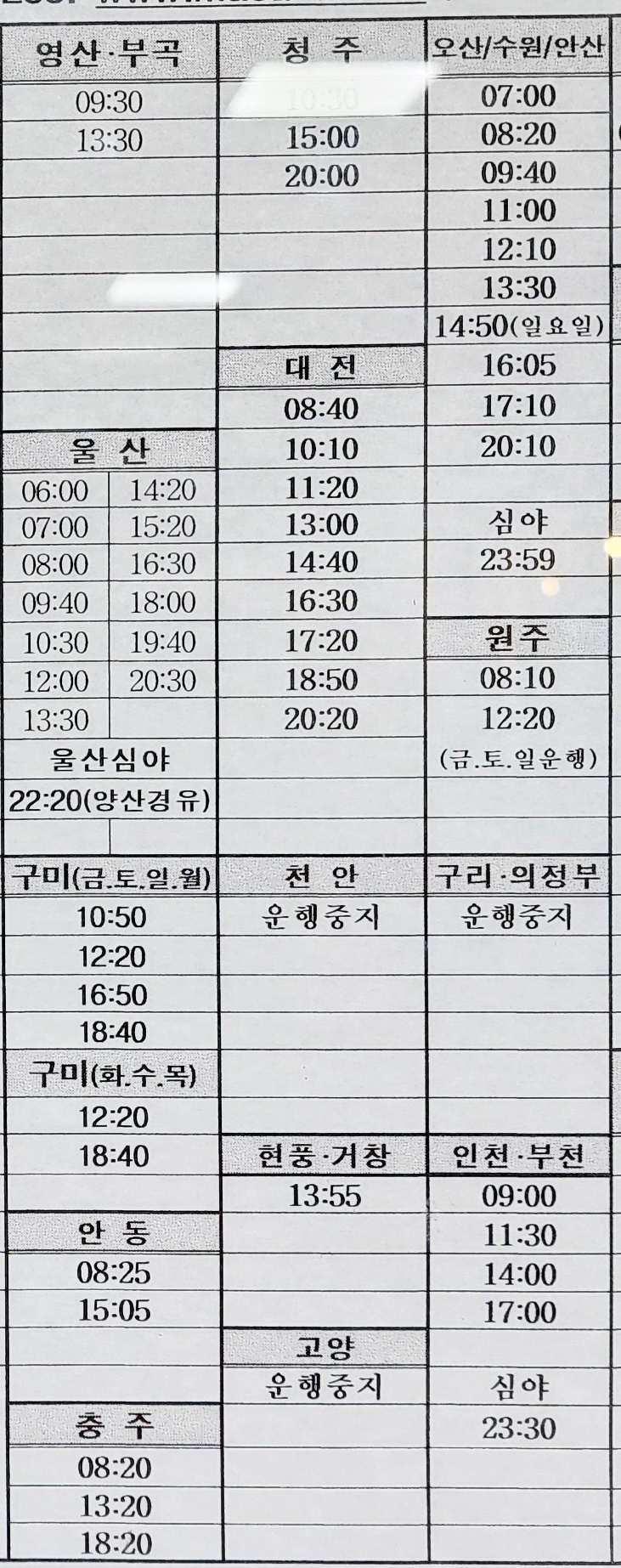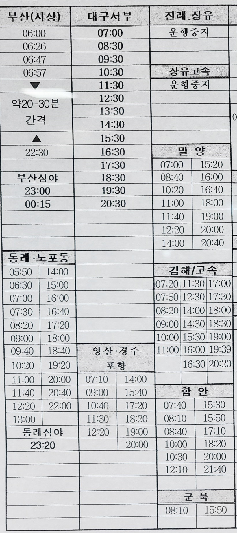 마산 출발 전주, 익산, 군산, 구미, 안동 방면.