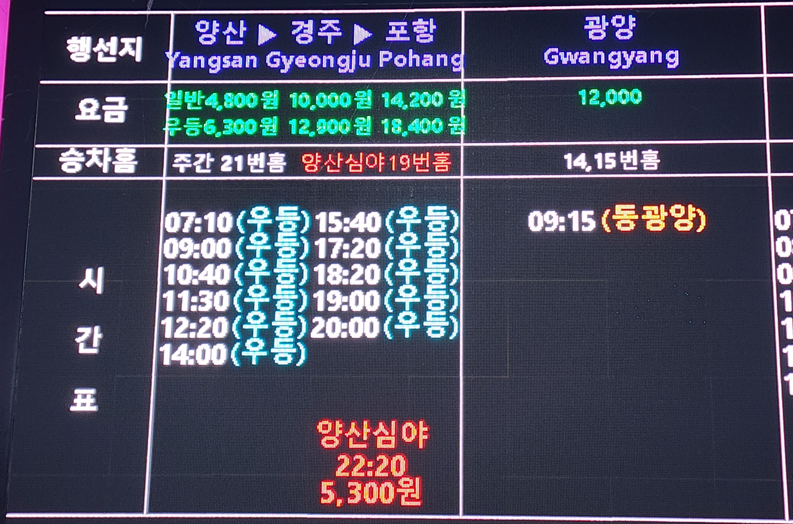 마산 출발 양산, 경주, 포항, 광양 방면.
