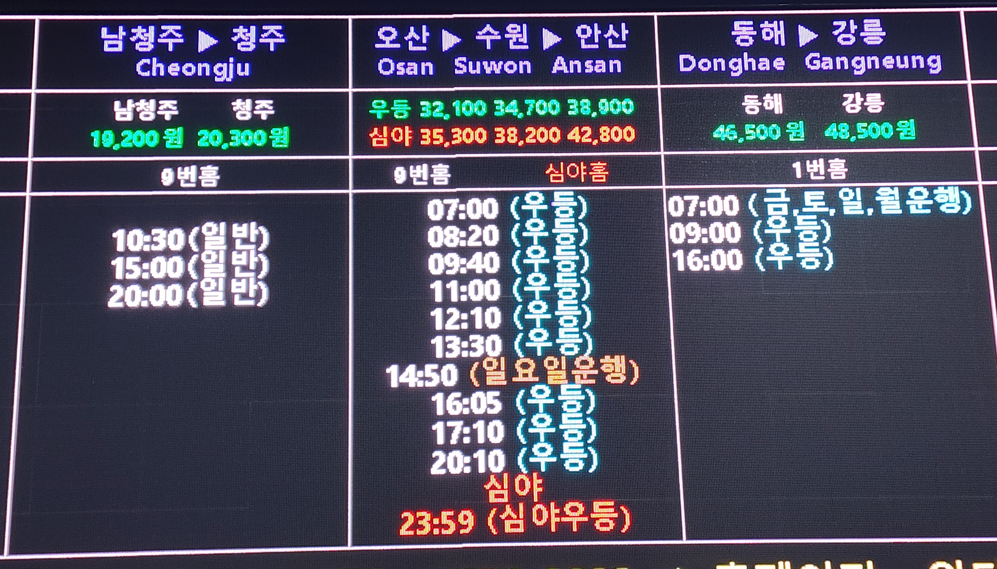 마산 출발 남청주, 청주, 오산, 수원, 안산, 동해, 강릉 방면.