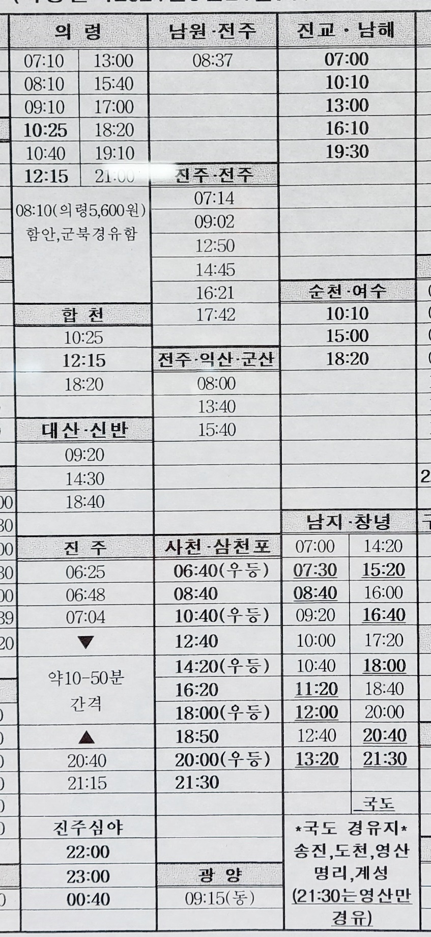 마산 출발 사천, 삼천포, 진교, 남해, 진주 방면.