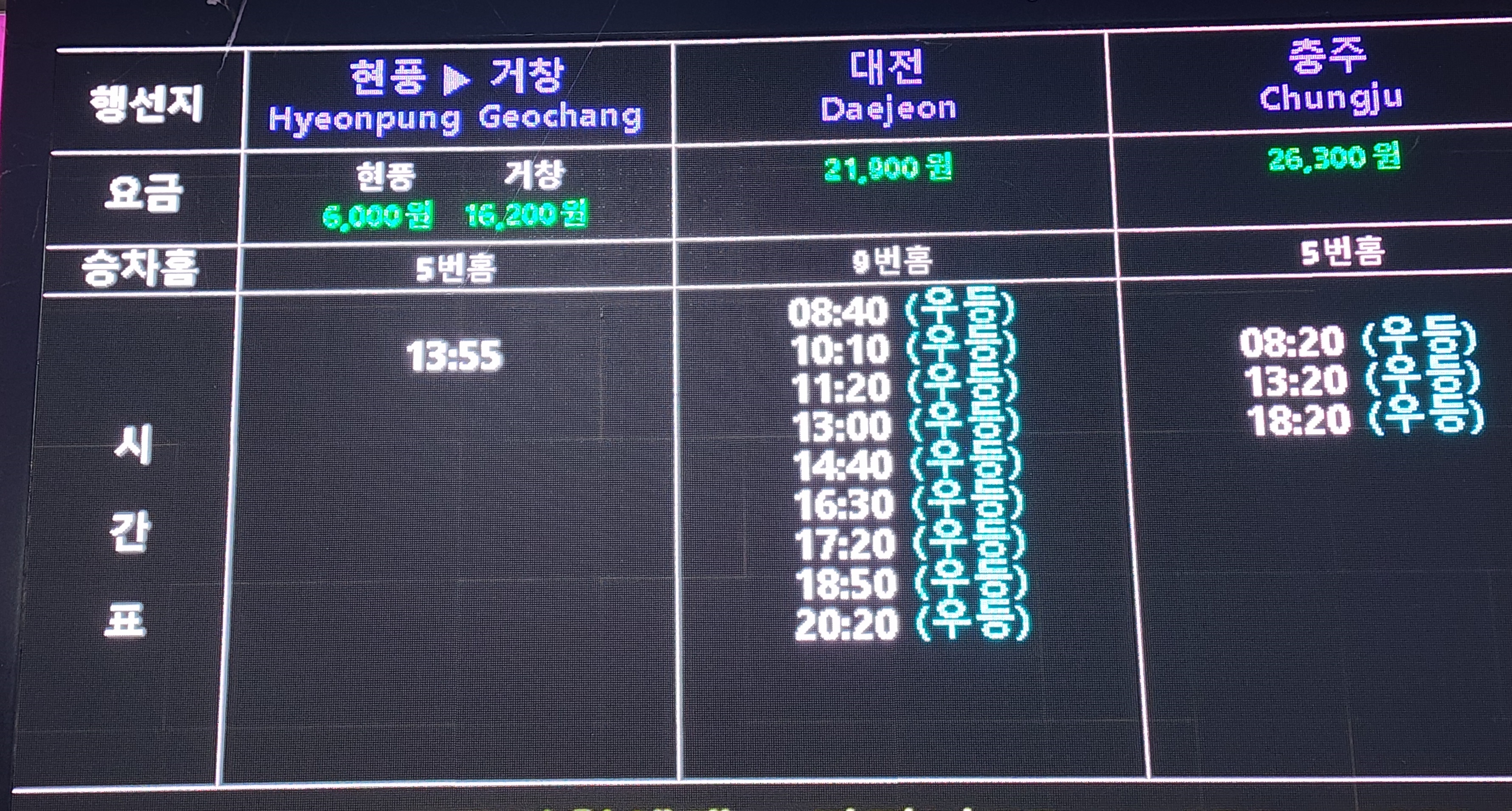 마산 출발 현풍, 거창, 대전, 충주 방면.