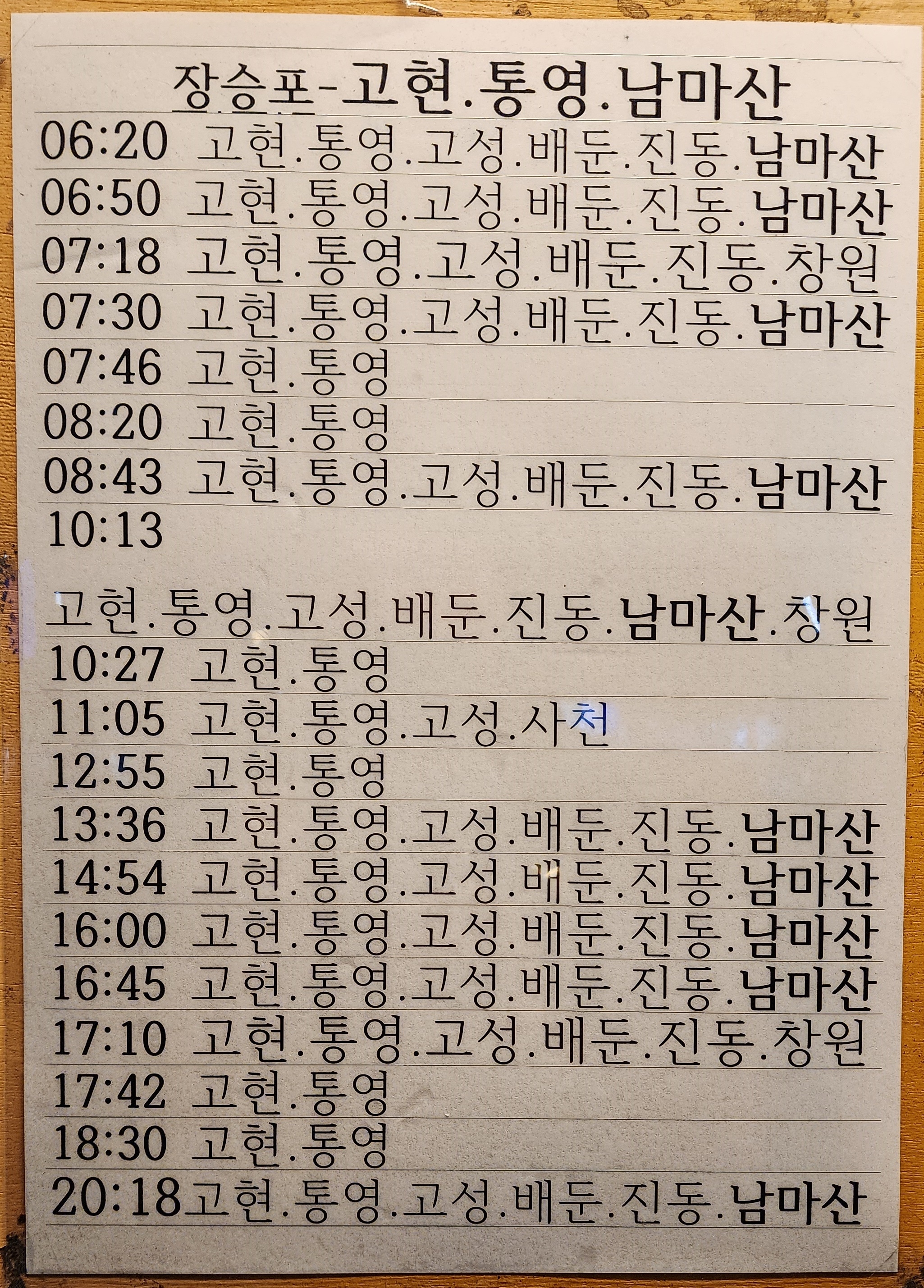 장승포 출발 고현, 통영, 고성, 배둔, 진동, 사천, 창원, 남마산 방면.