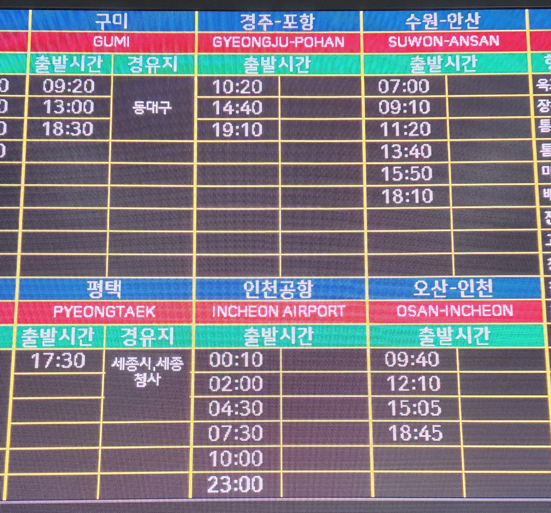 고현 출발 구미, 경주, 포항, 수원, 안산, 평택, 잋넡공항, 오산, 인천 방면.