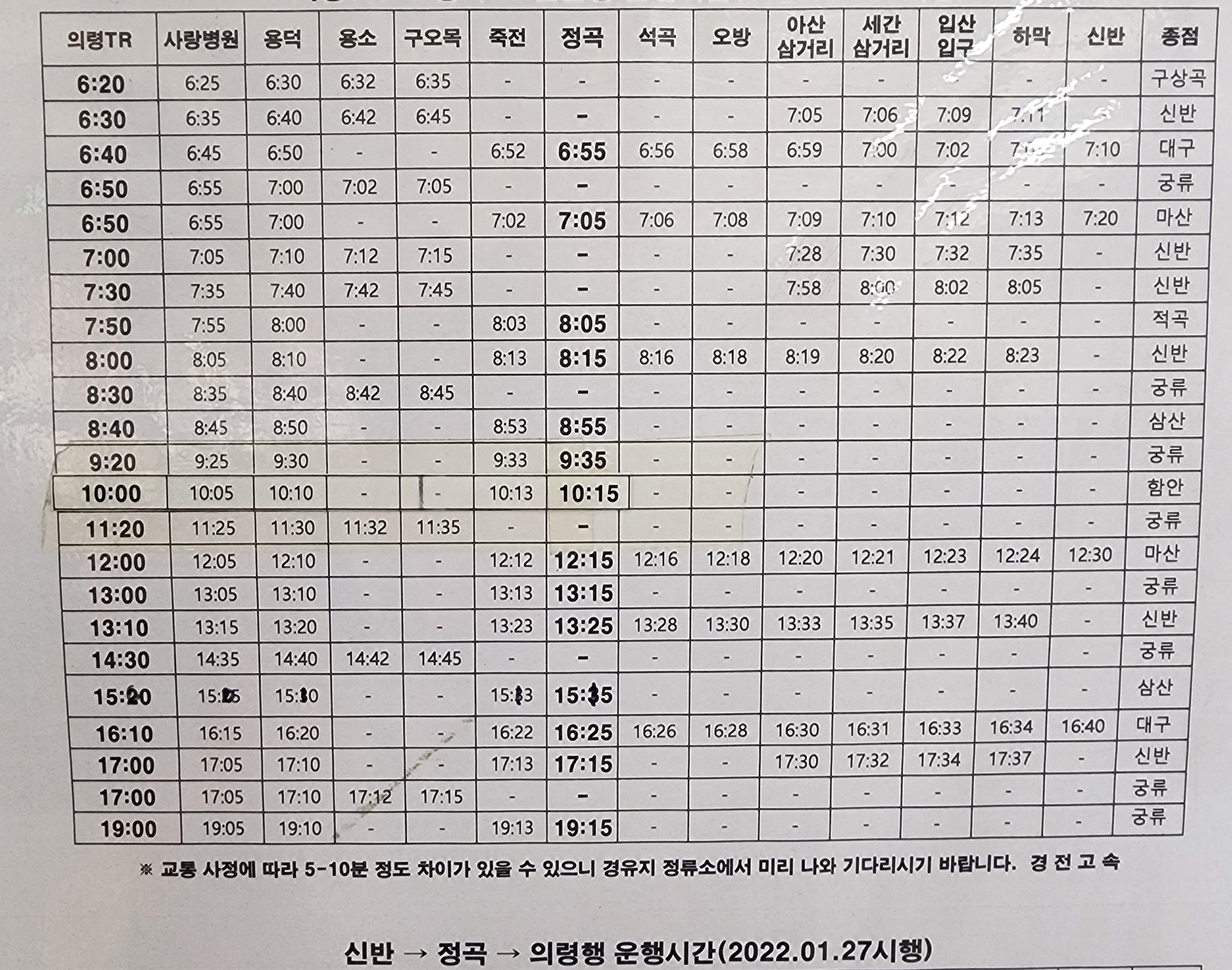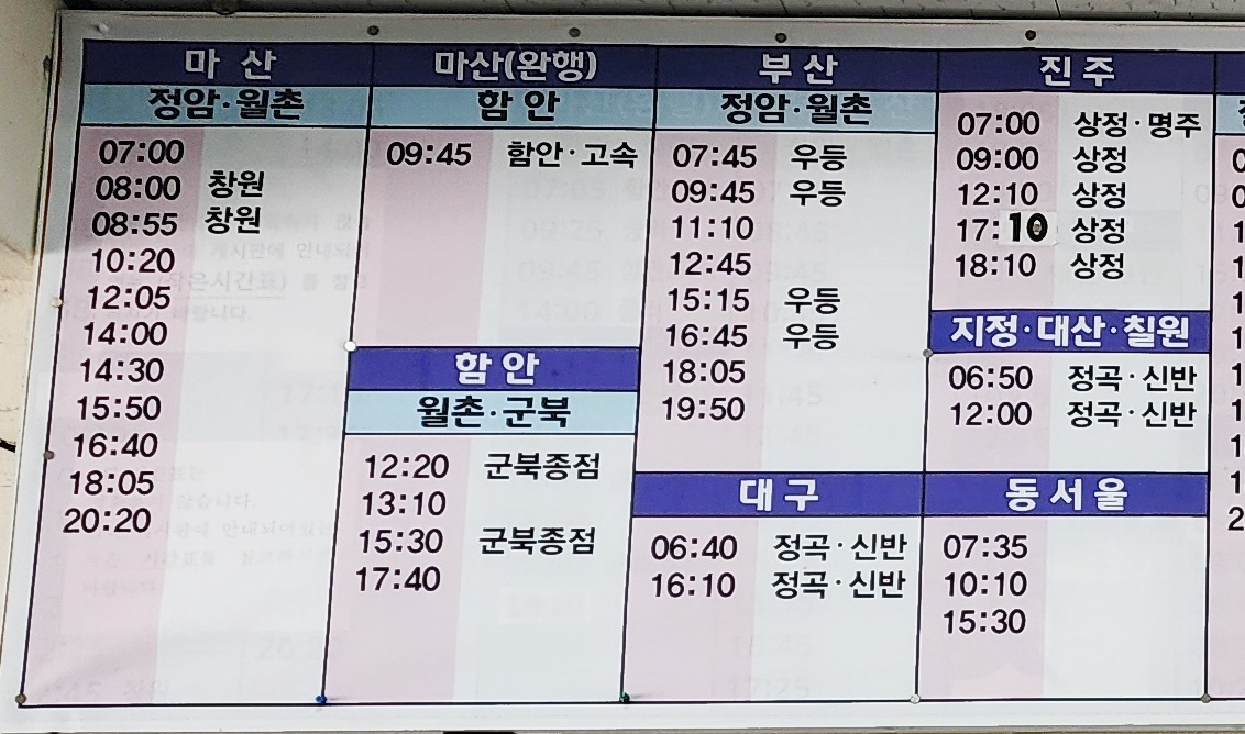 의령 출발 마산, 정암, 월촌, 함안, 창원, 마산, 부산, 진주 방면.