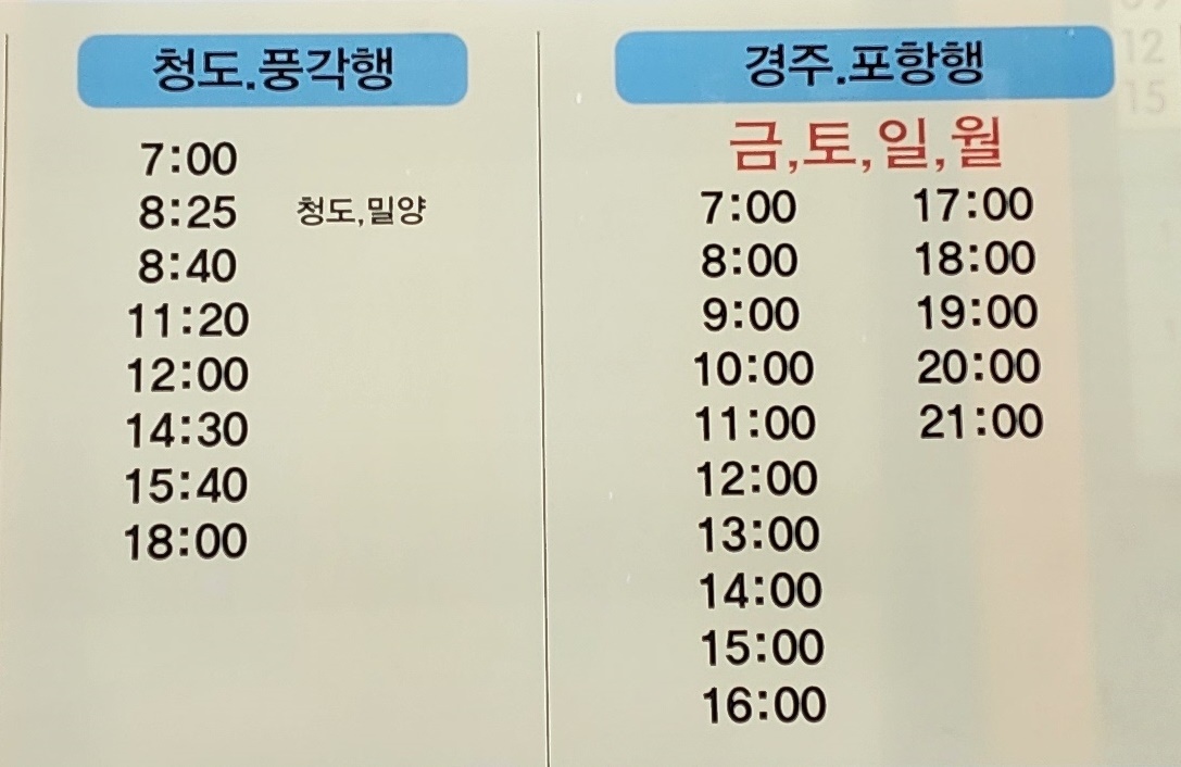 경산 출발 청도, 풍각, 경주, 포항 방면.
