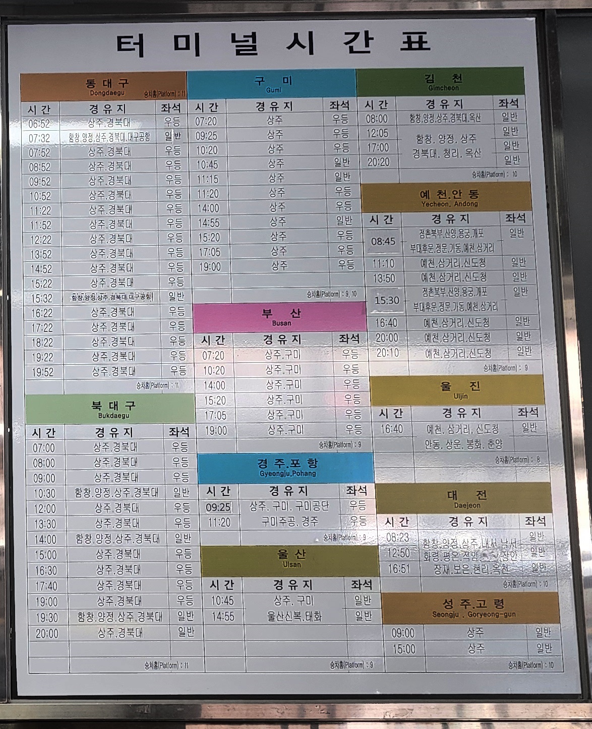 점촌 출발 동대구, 북대구, 구미, 부산, 경주, 포항, 울산, 김천, 예천, 안동, 울진, 대전, 성주, 고령 방면.