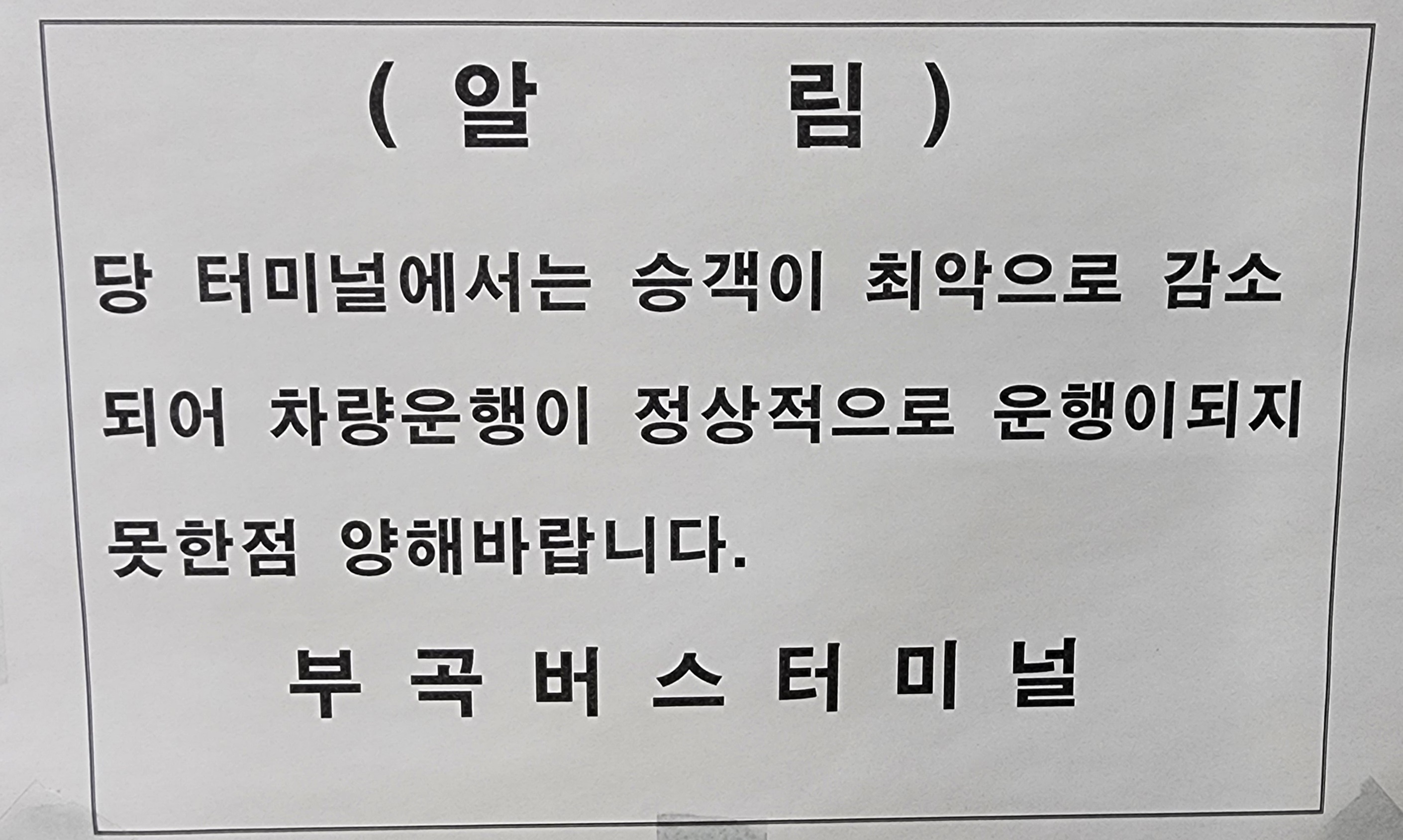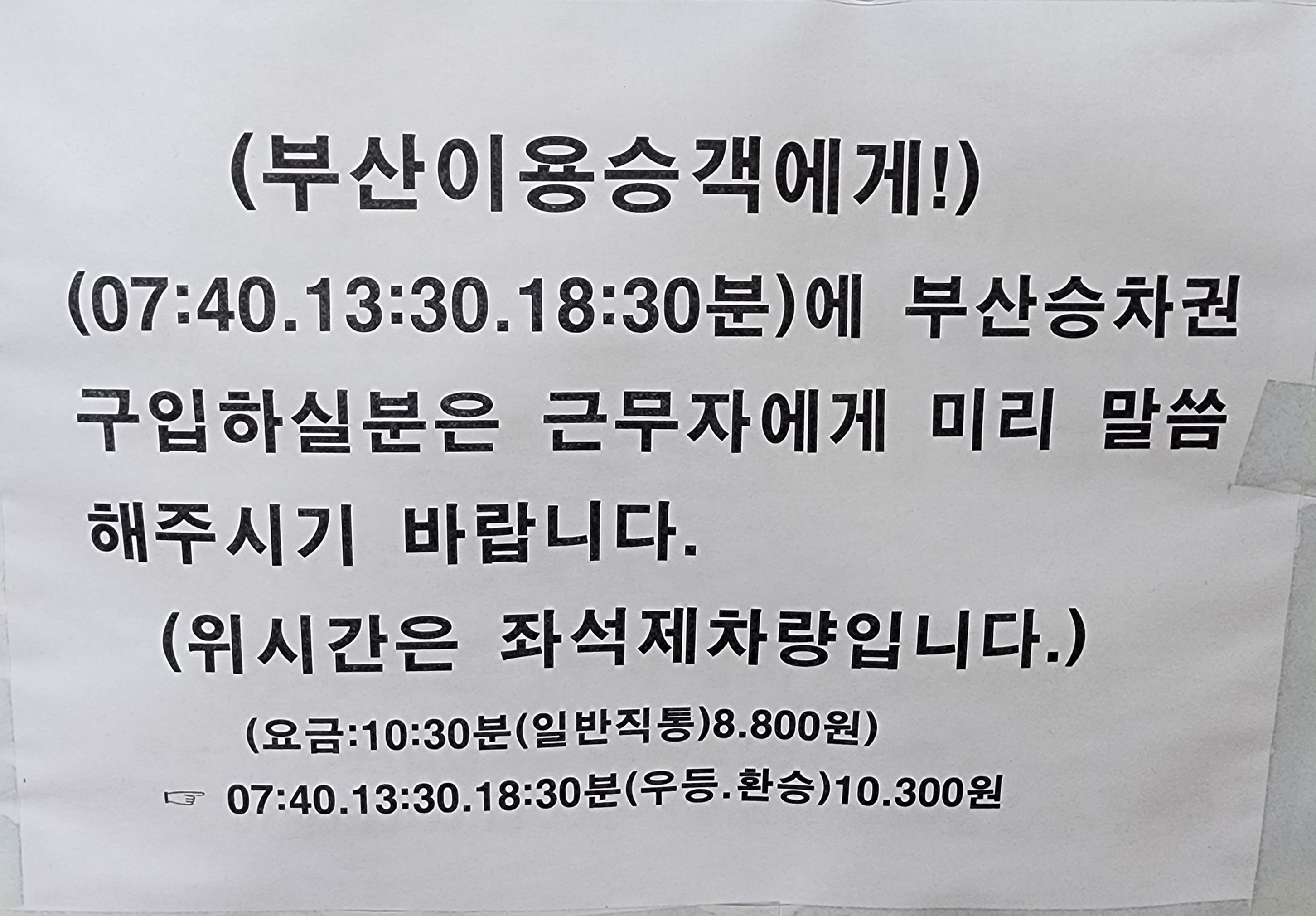 부곡 출발 부산 이용승객은 근무자에게 미리 말씀해주세요