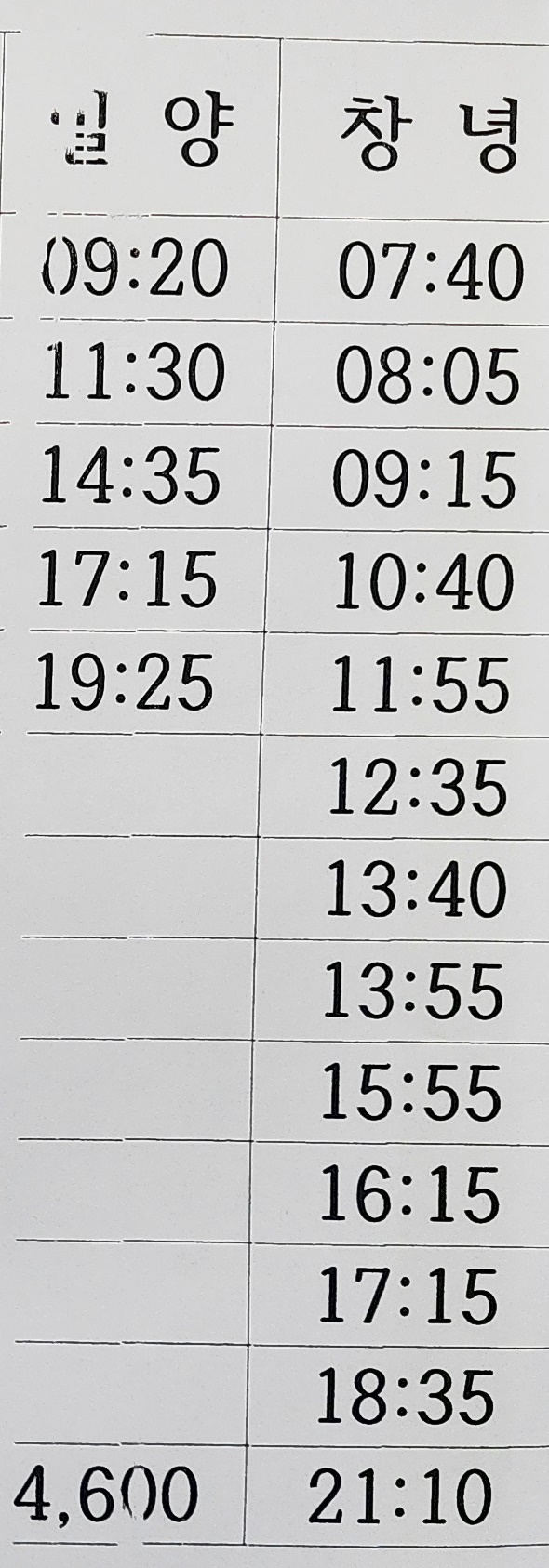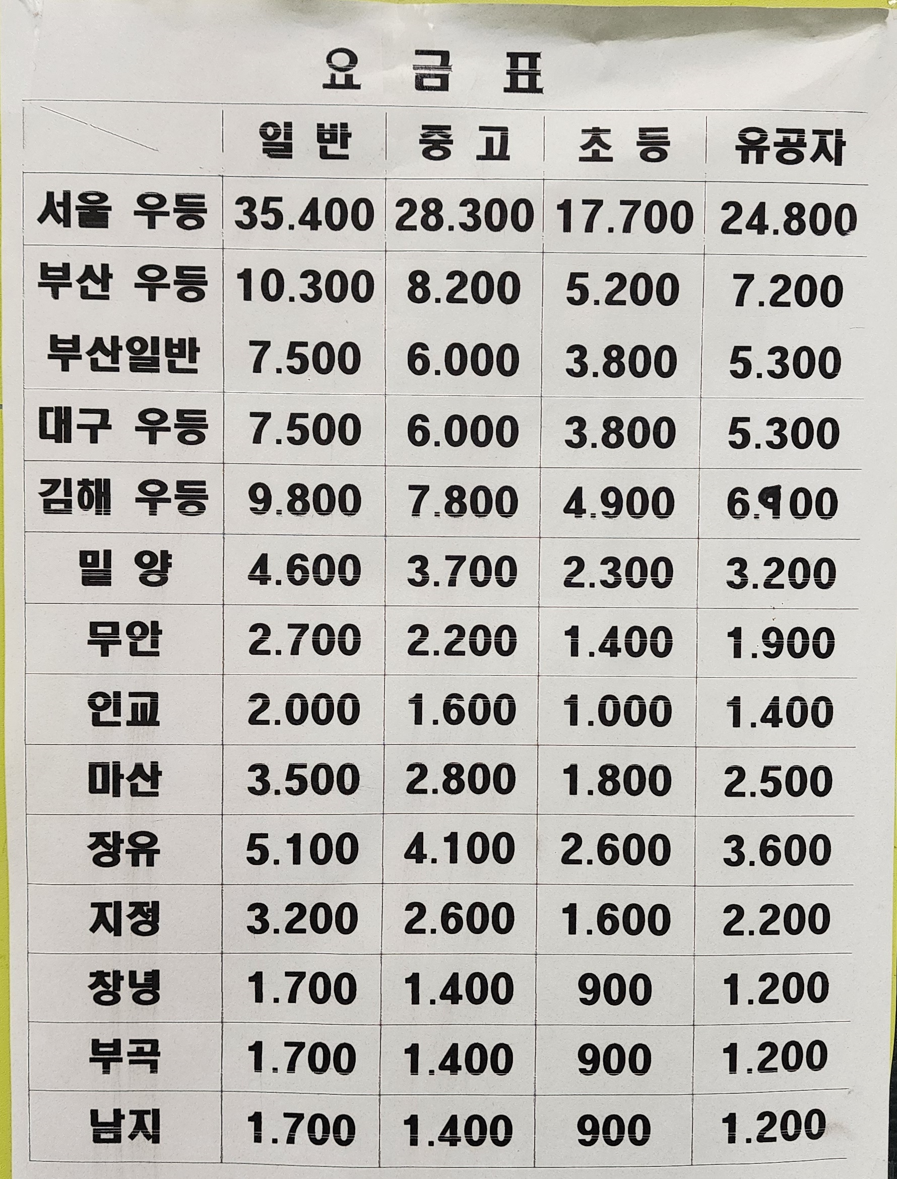영산시외버스터미널 요금교