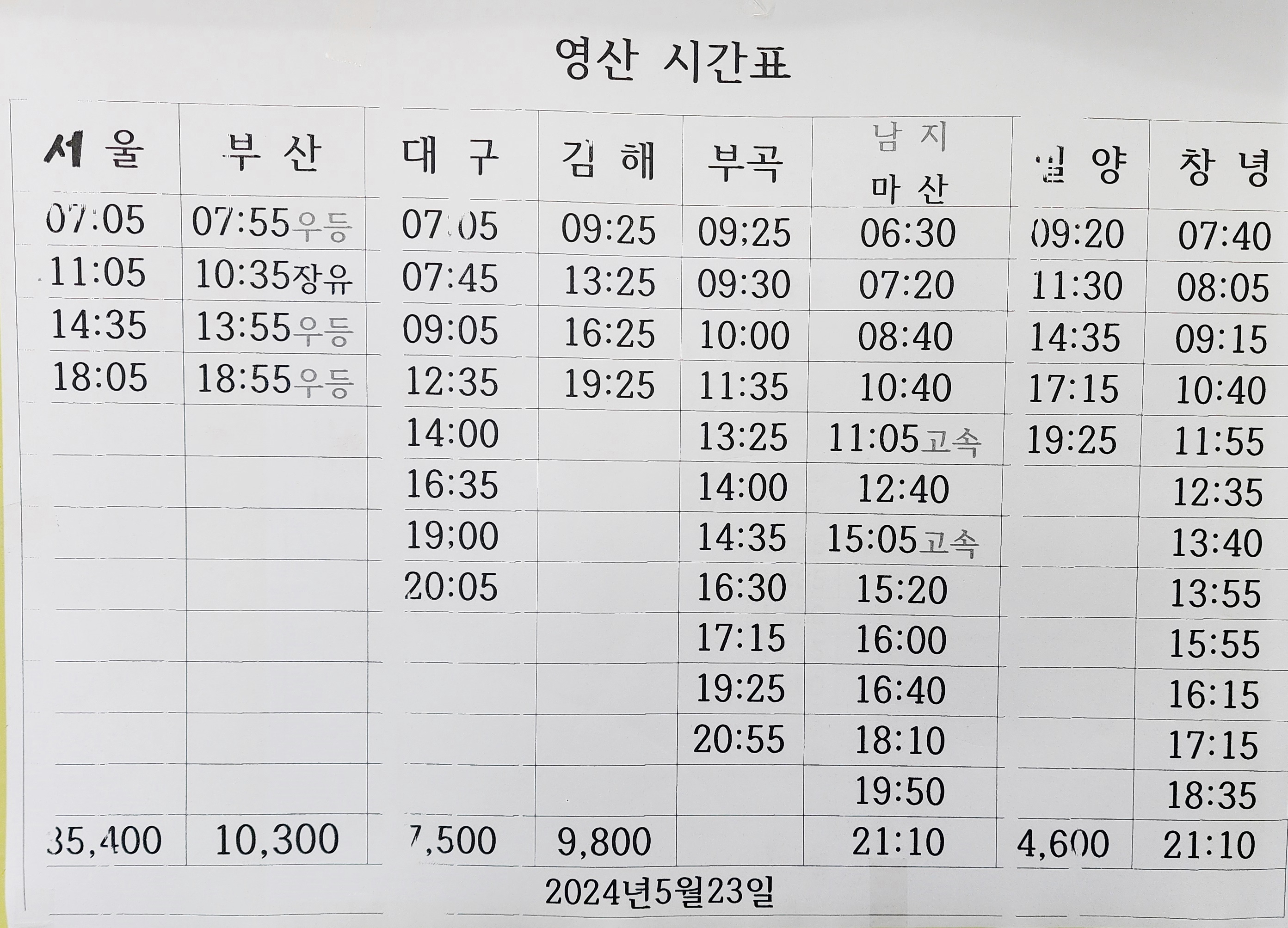 영산 출발 서울, 부산 방면.