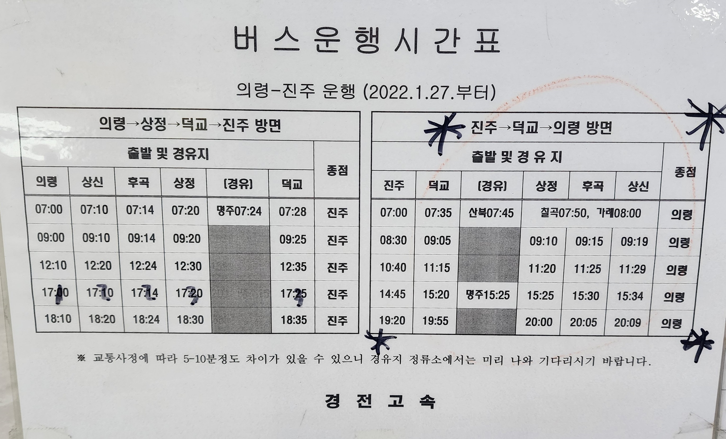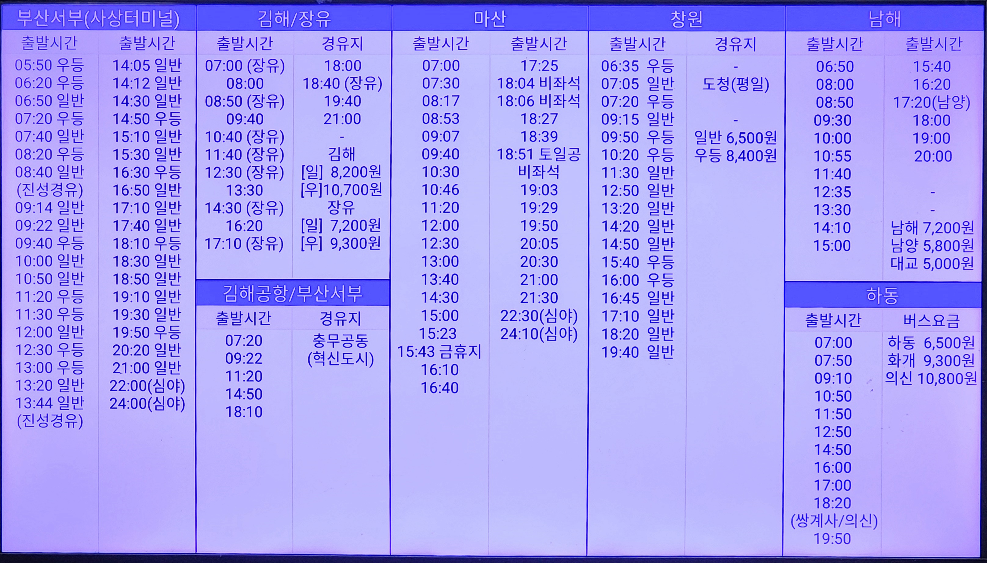 진주 출발 순천, 의령, 대구 서부, 대전 복합터미널, 삼천포, 광양, 함안, 군북, 삼가, 대의, 경주, 포항, 합천, 삼천포 방면.
