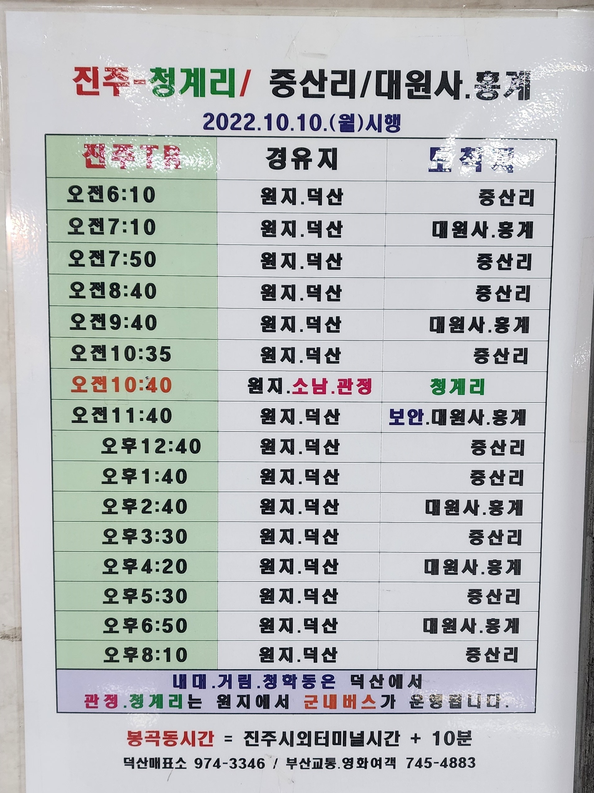 진주 출발 청계리, 중산리, 대원사, 홍계 방면.