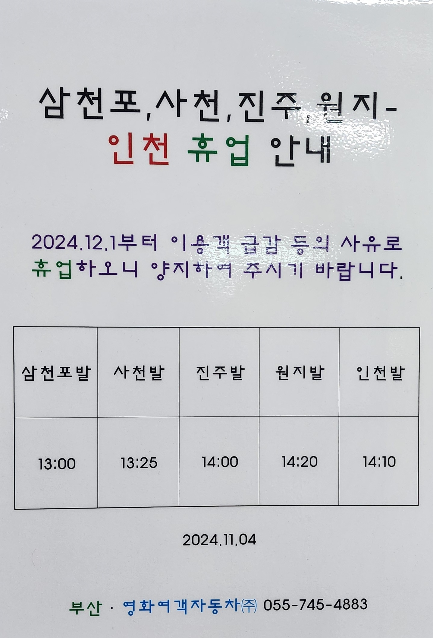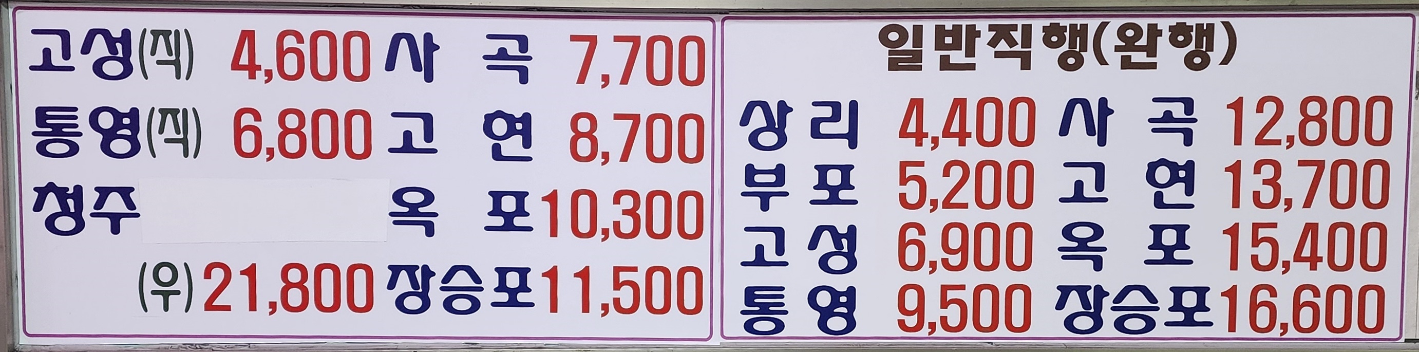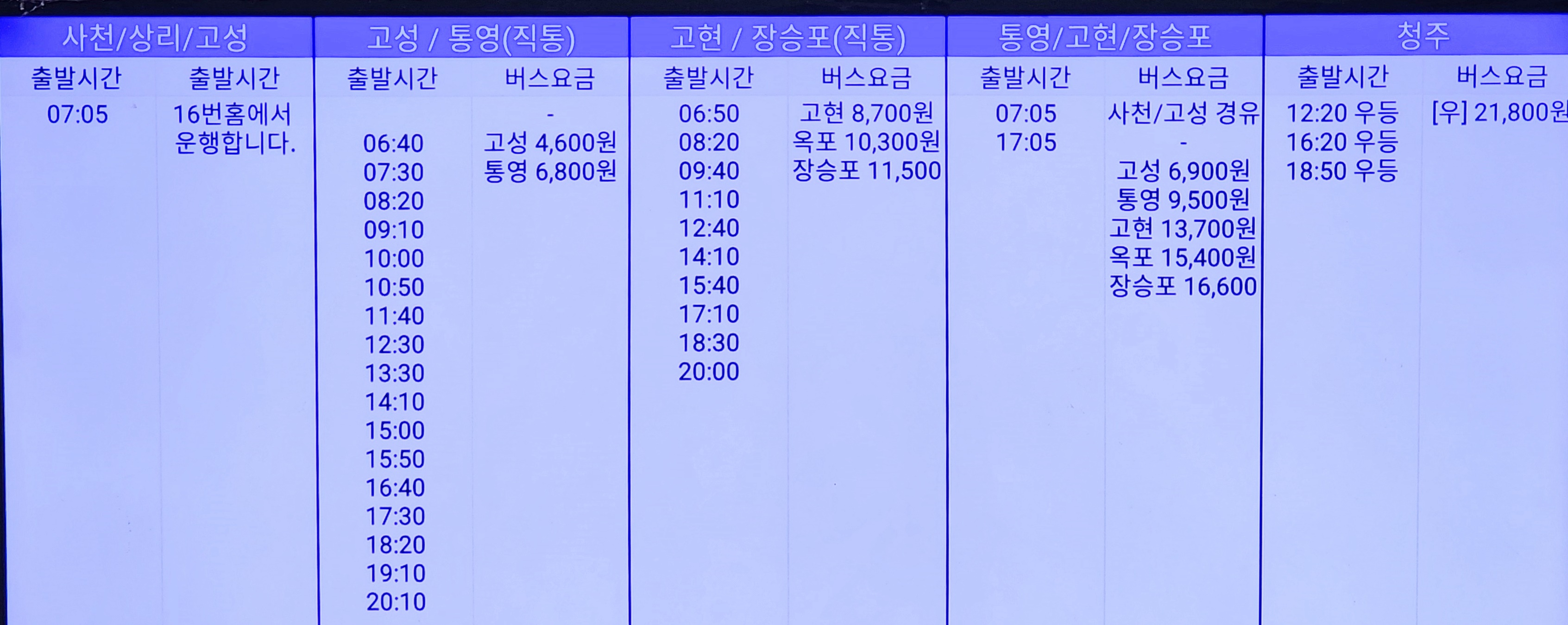 진주 출발 사천, 상리, 고성, 통영, 고현, 장승포,청주 방면.