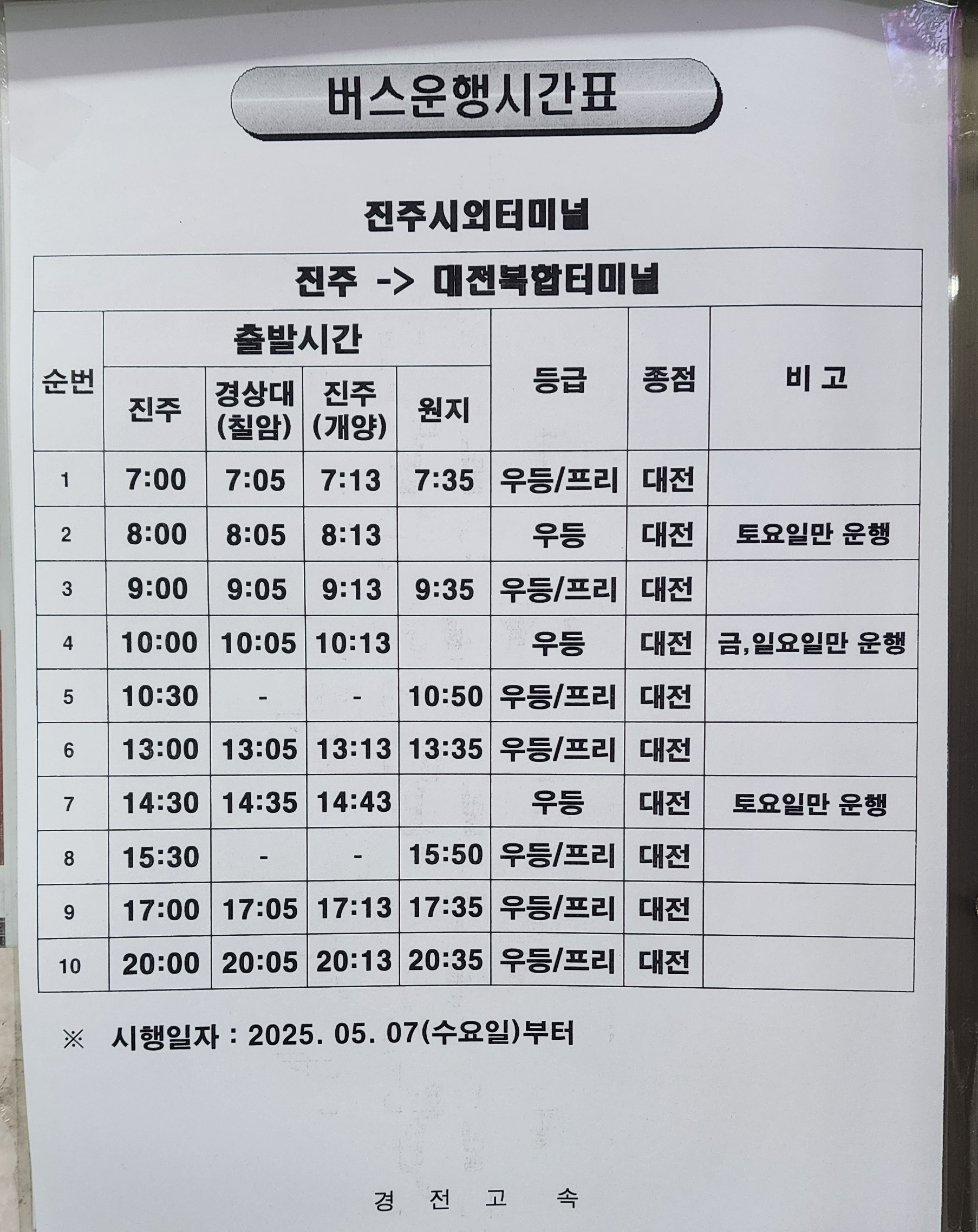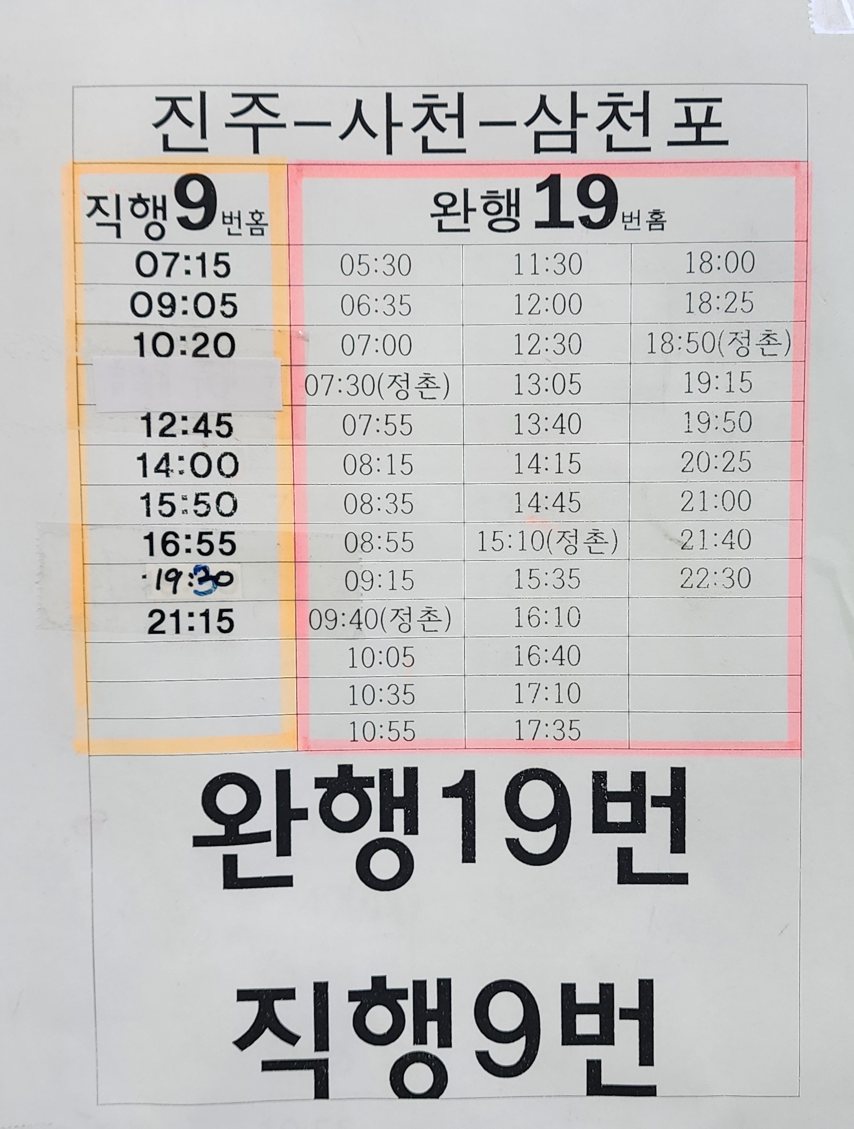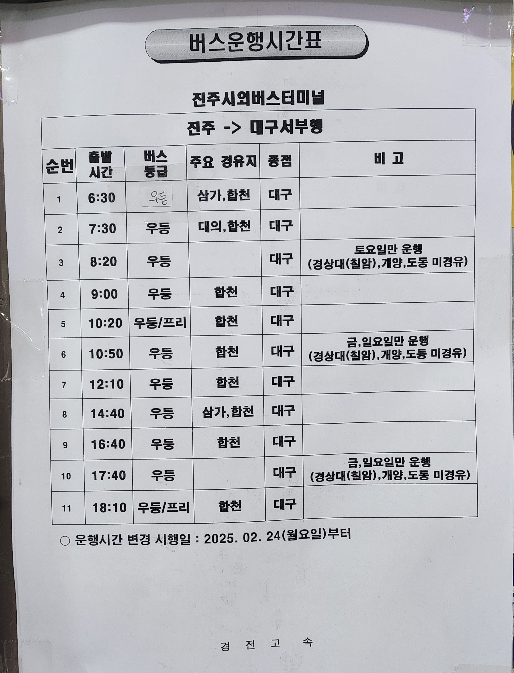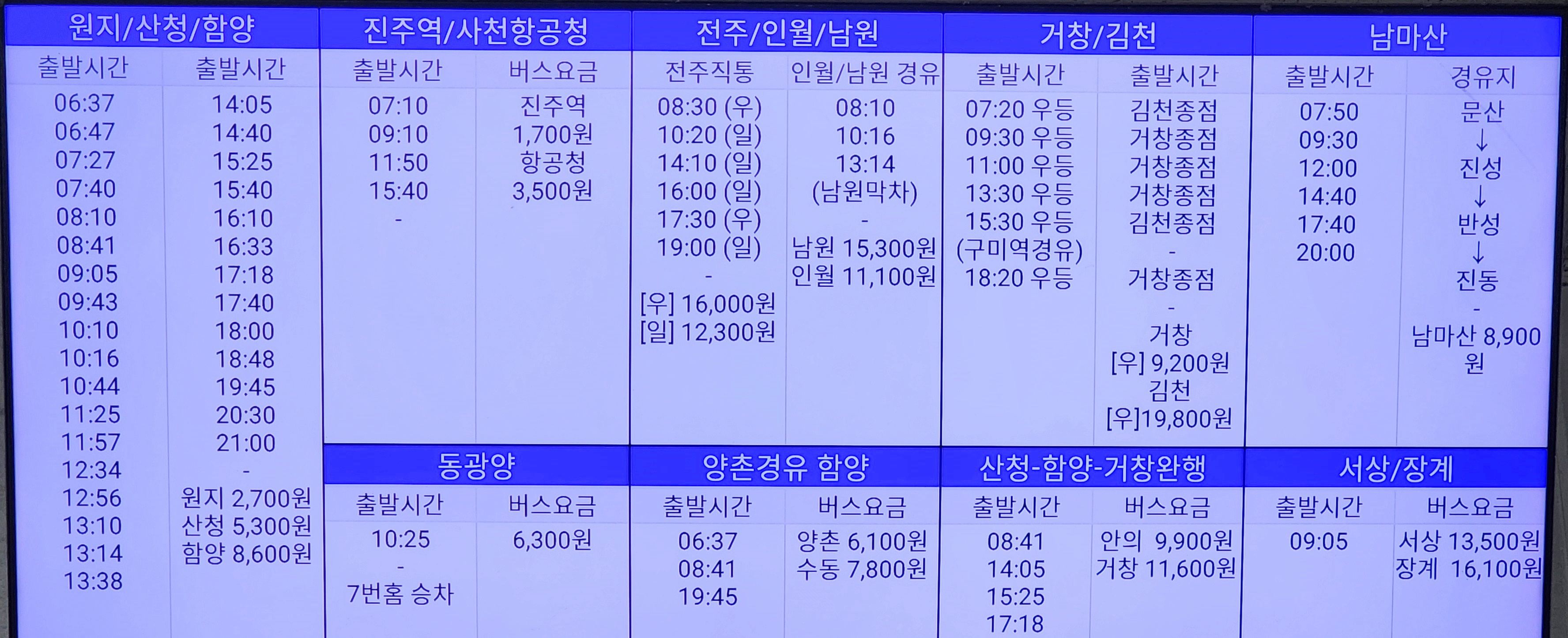 진주 출발 순천, 의령, 대구 서부, 대전 복합터미널, 삼천포, 광양, 함안, 군북, 삼가, 대의, 경주, 포항, 합천, 삼천포 방면.