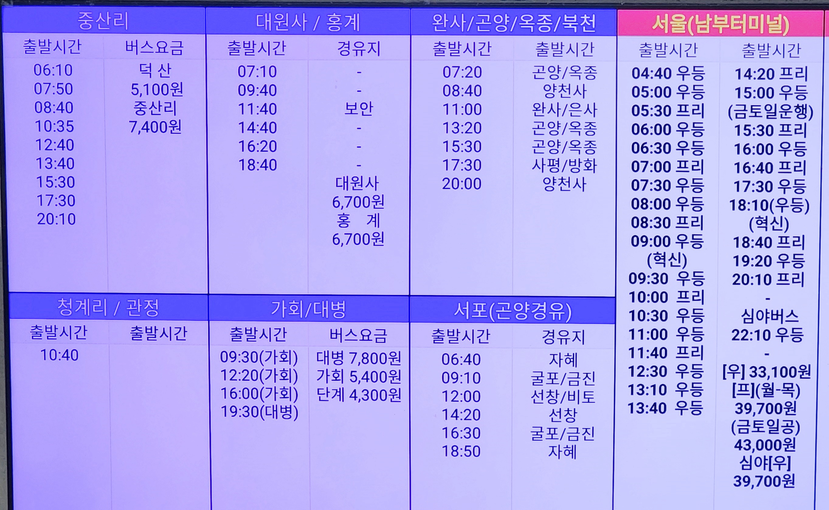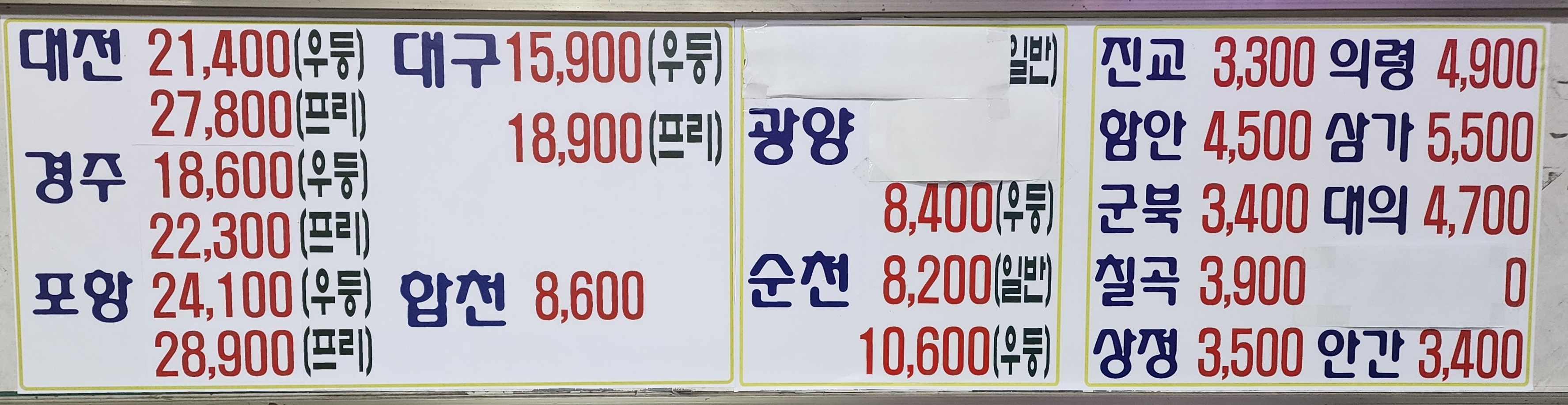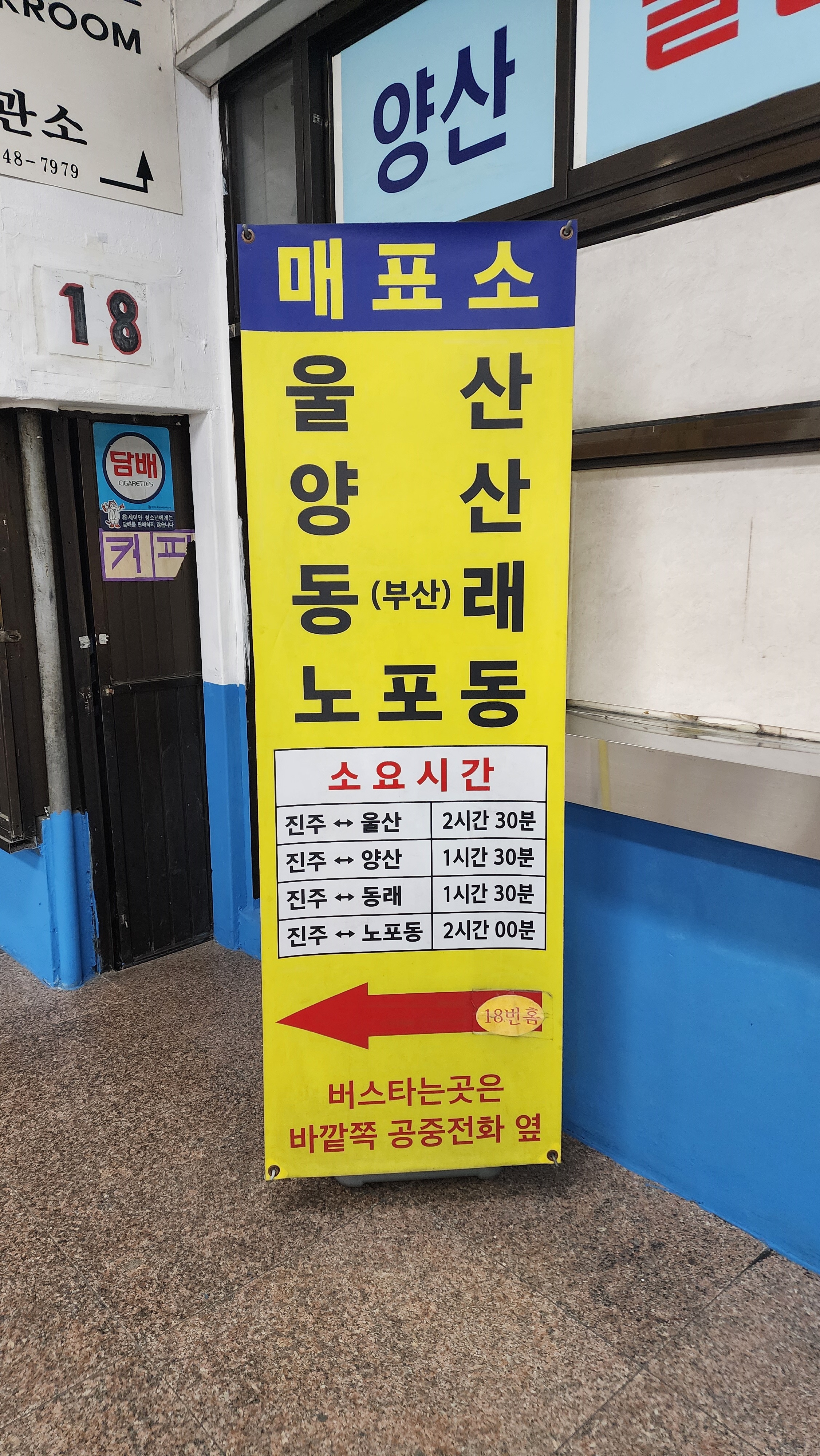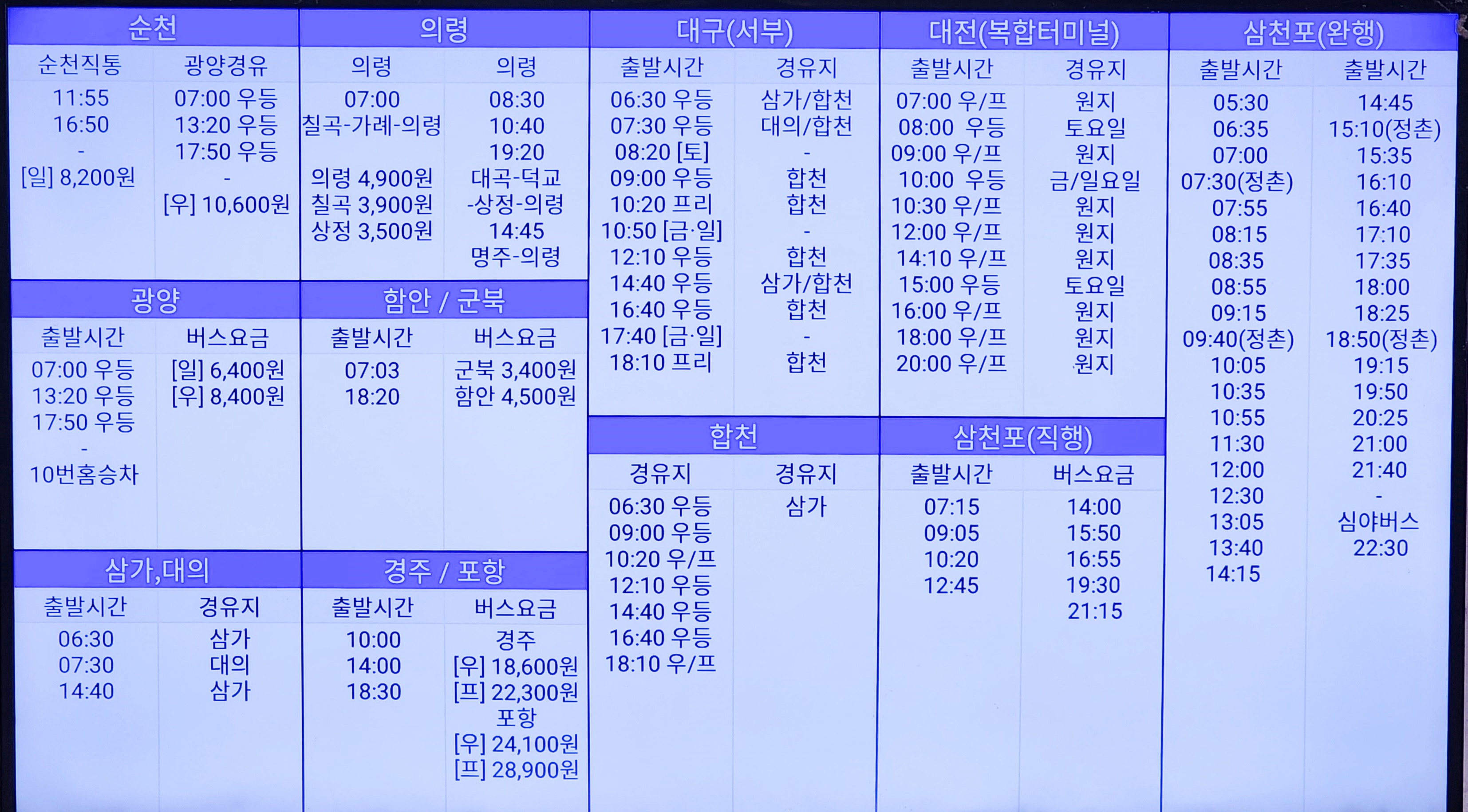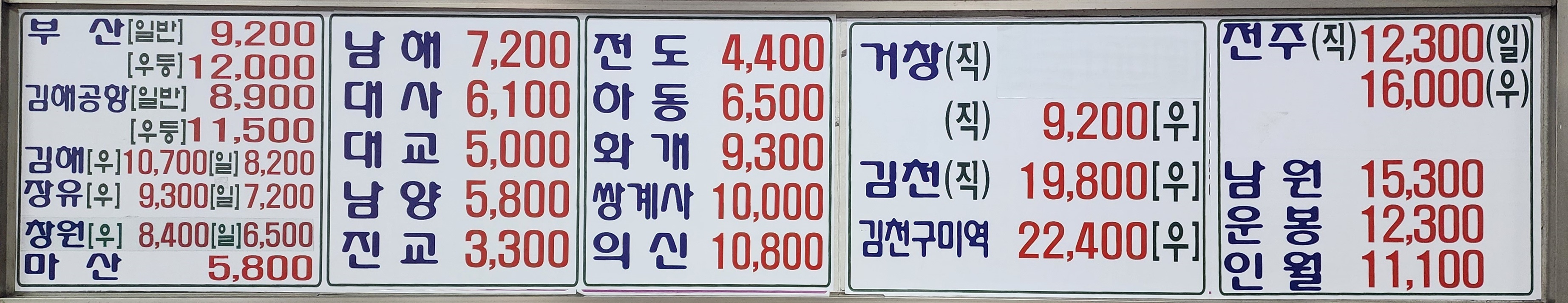 진주 출발 순천, 의령, 대구 서부, 대전 복합터미널, 삼천포, 광양, 함안, 군북, 삼가, 대의, 경주, 포항, 합천, 삼천포 방면.