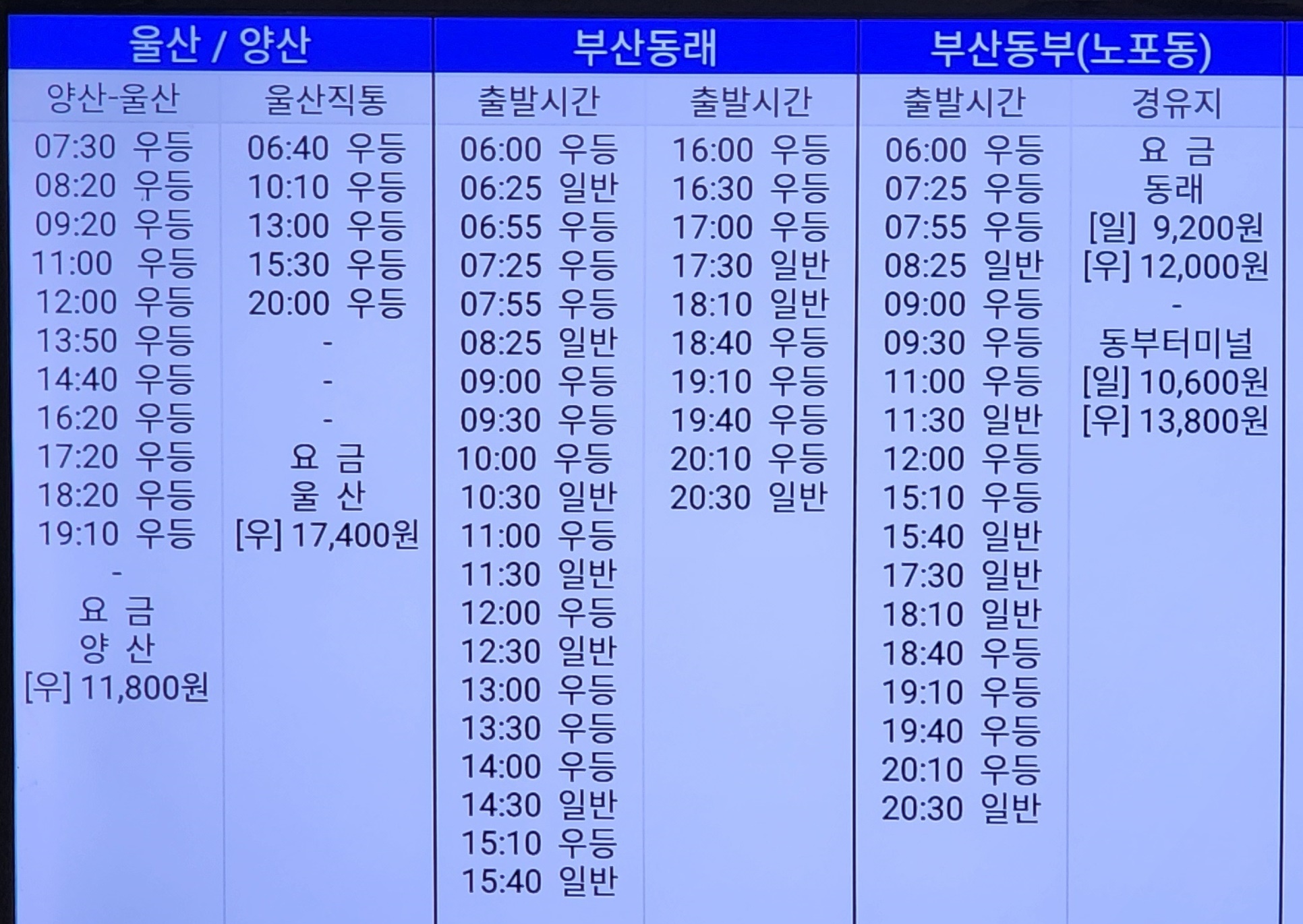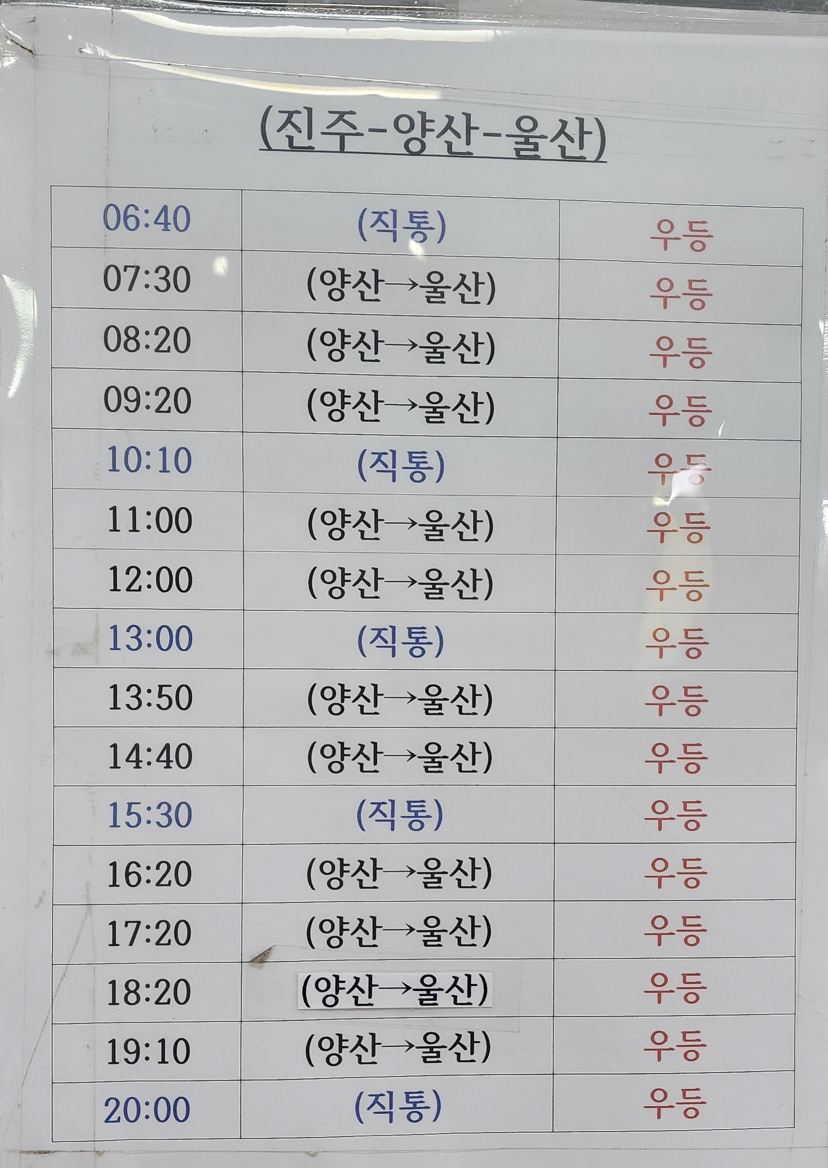 진주 출발 울산, 양산, 부산 동래, 부산 동부 노포동 방면.