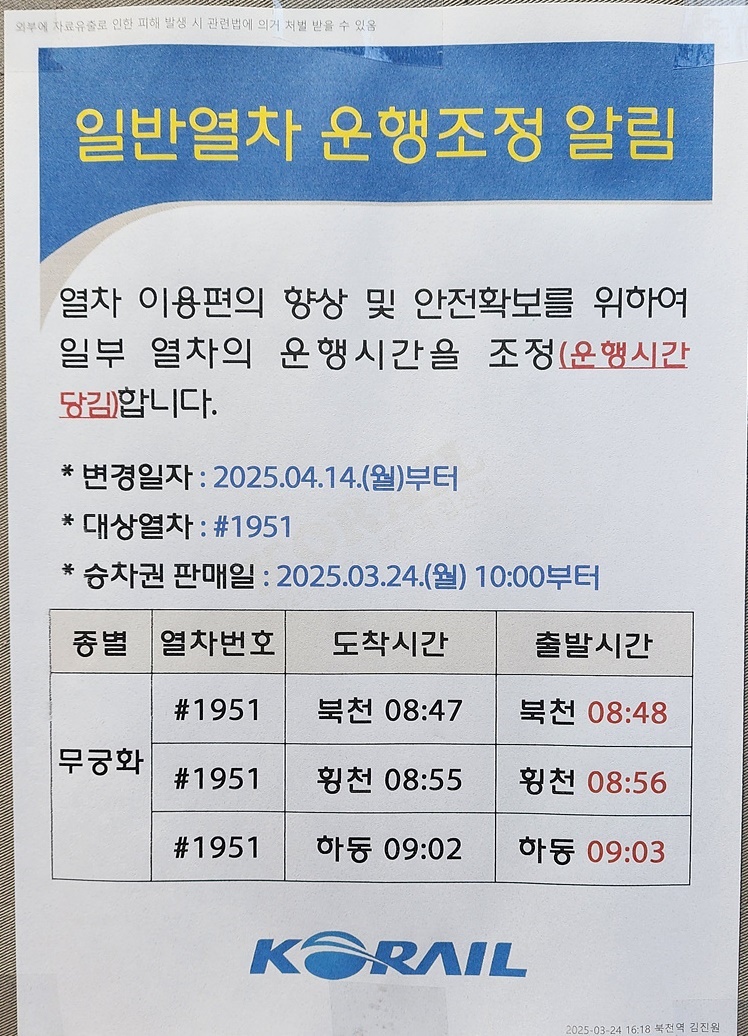 북천역 열차 운행 조정 알림