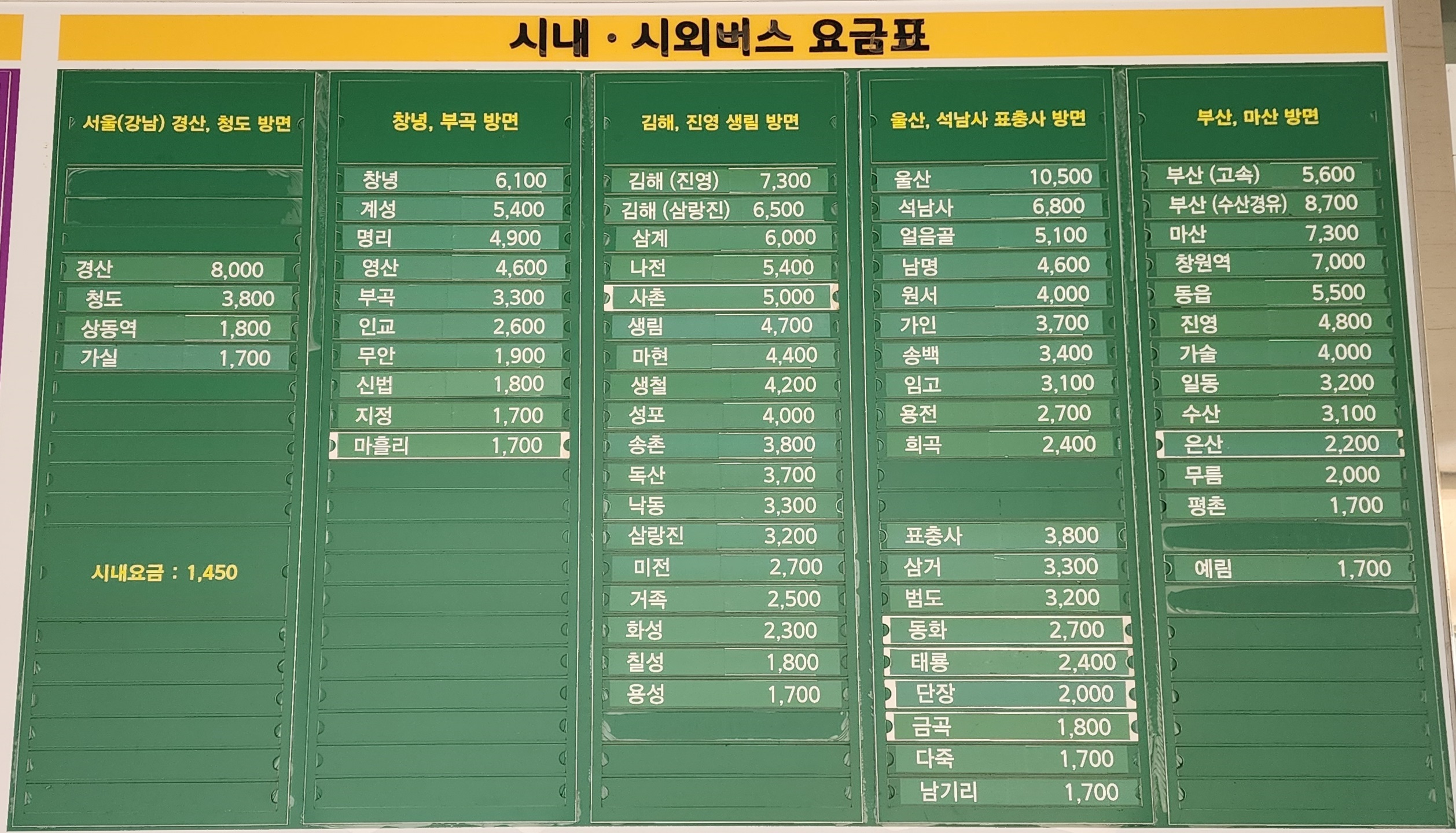 밀양시내 시외버스 요금표.