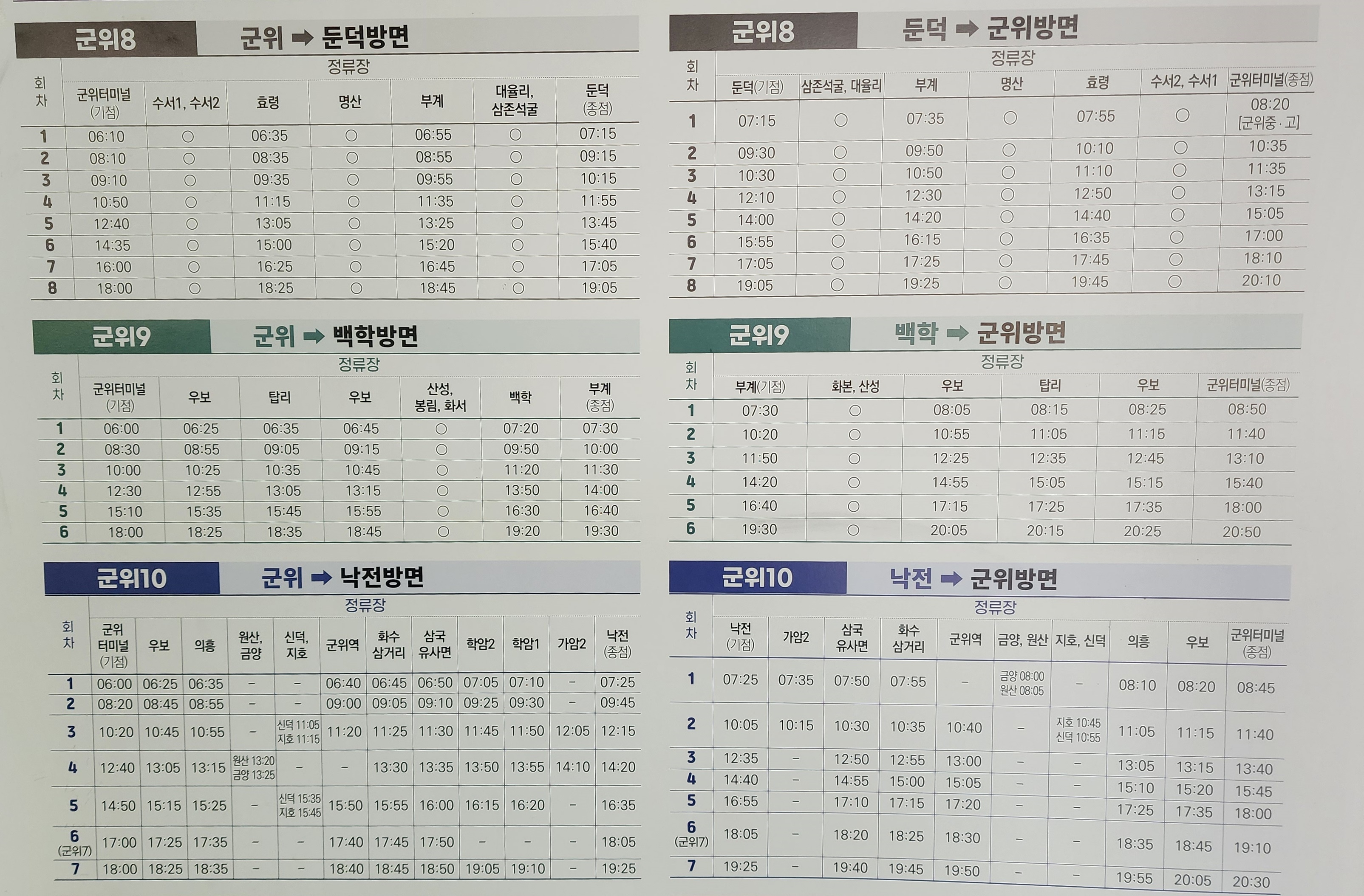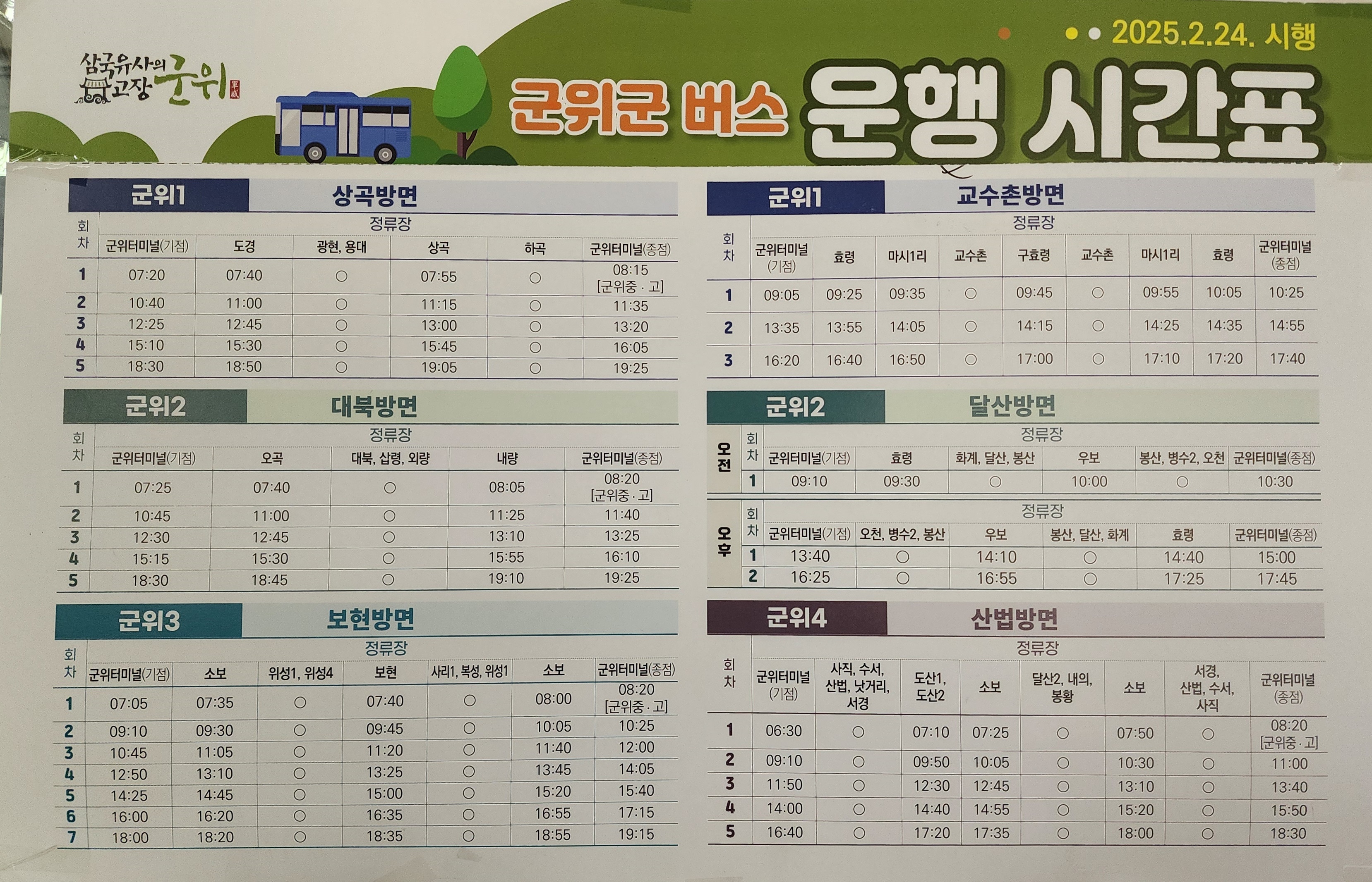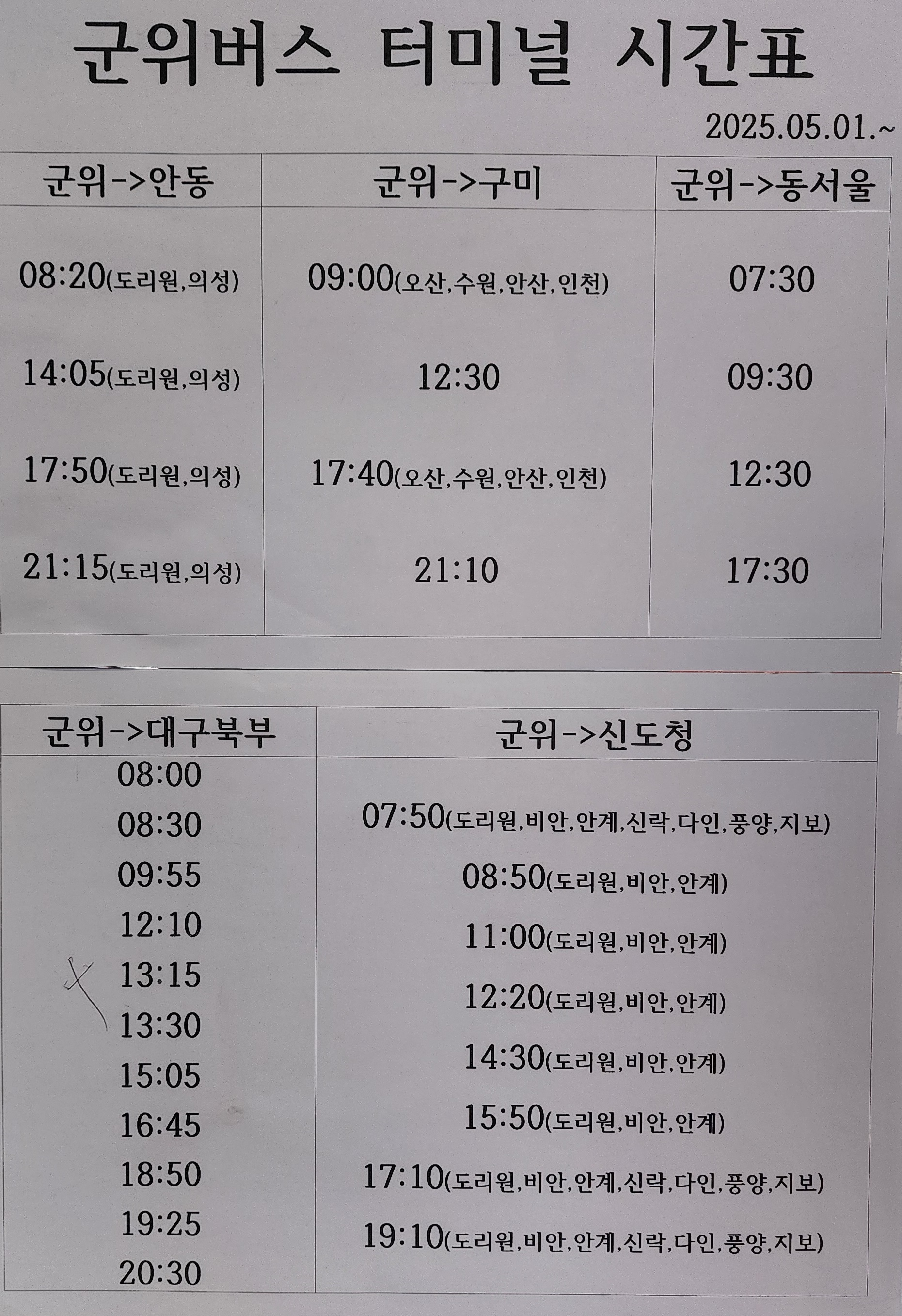 군위 출발 안동, 구미, 동서울, 대구북부, 신도청 방면.
