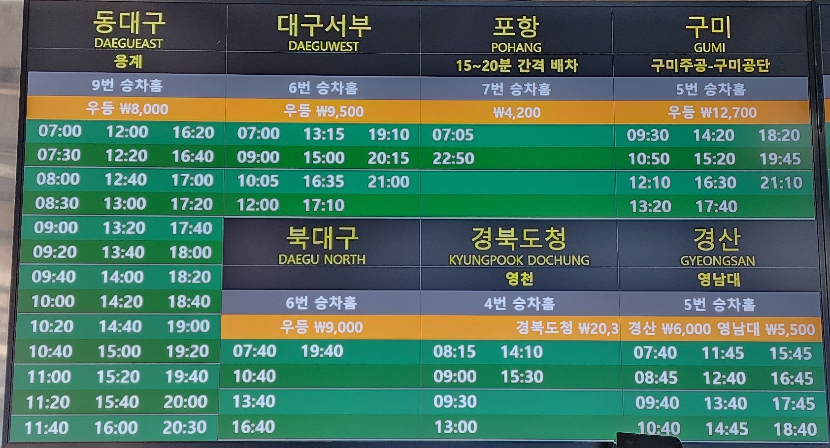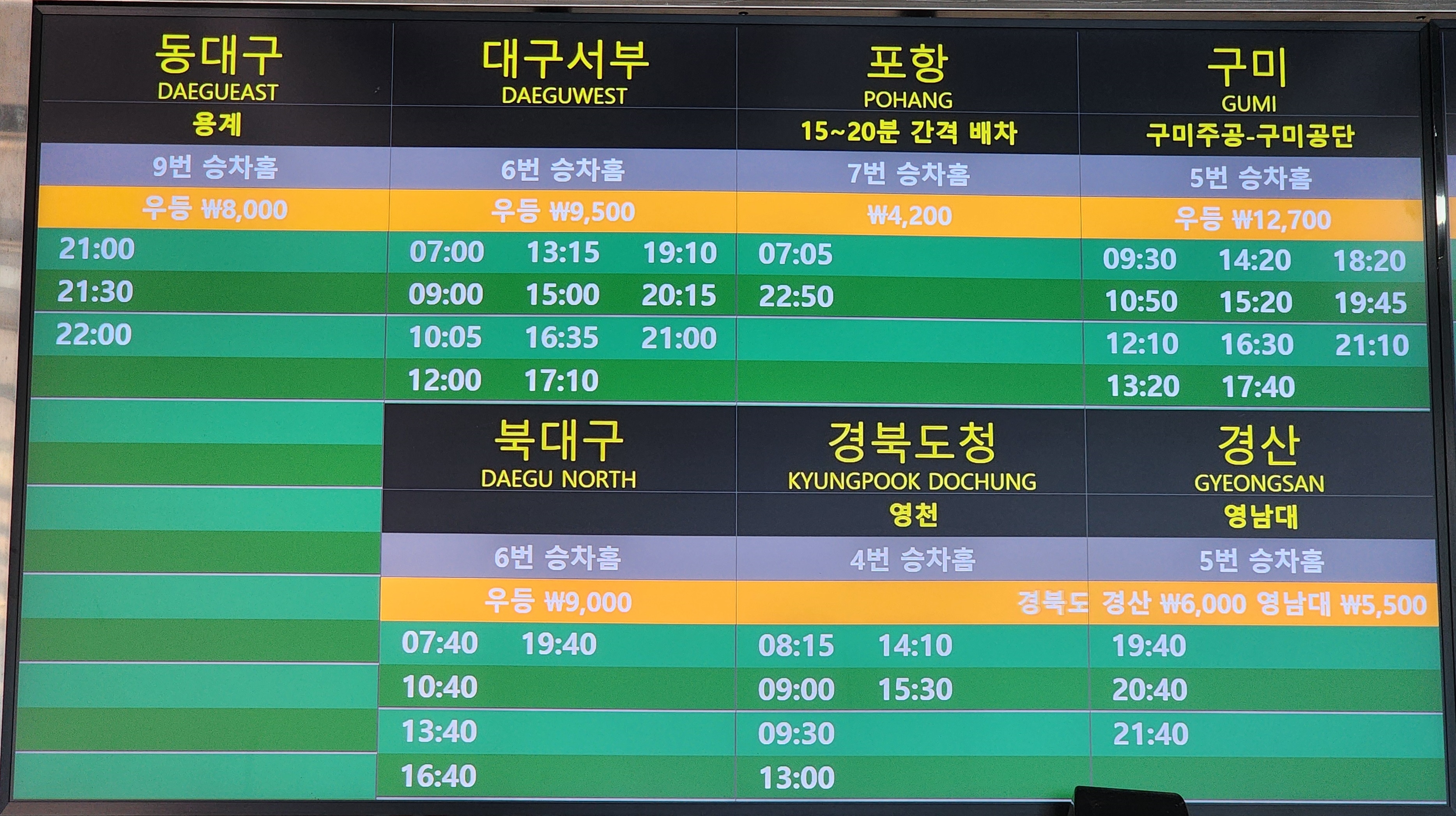 경주 출발 대구대, 하양, 안동, 제천, 영주, 부산동부, 부산서부, 해운대, 통영, 거제, 김해공항 방면.