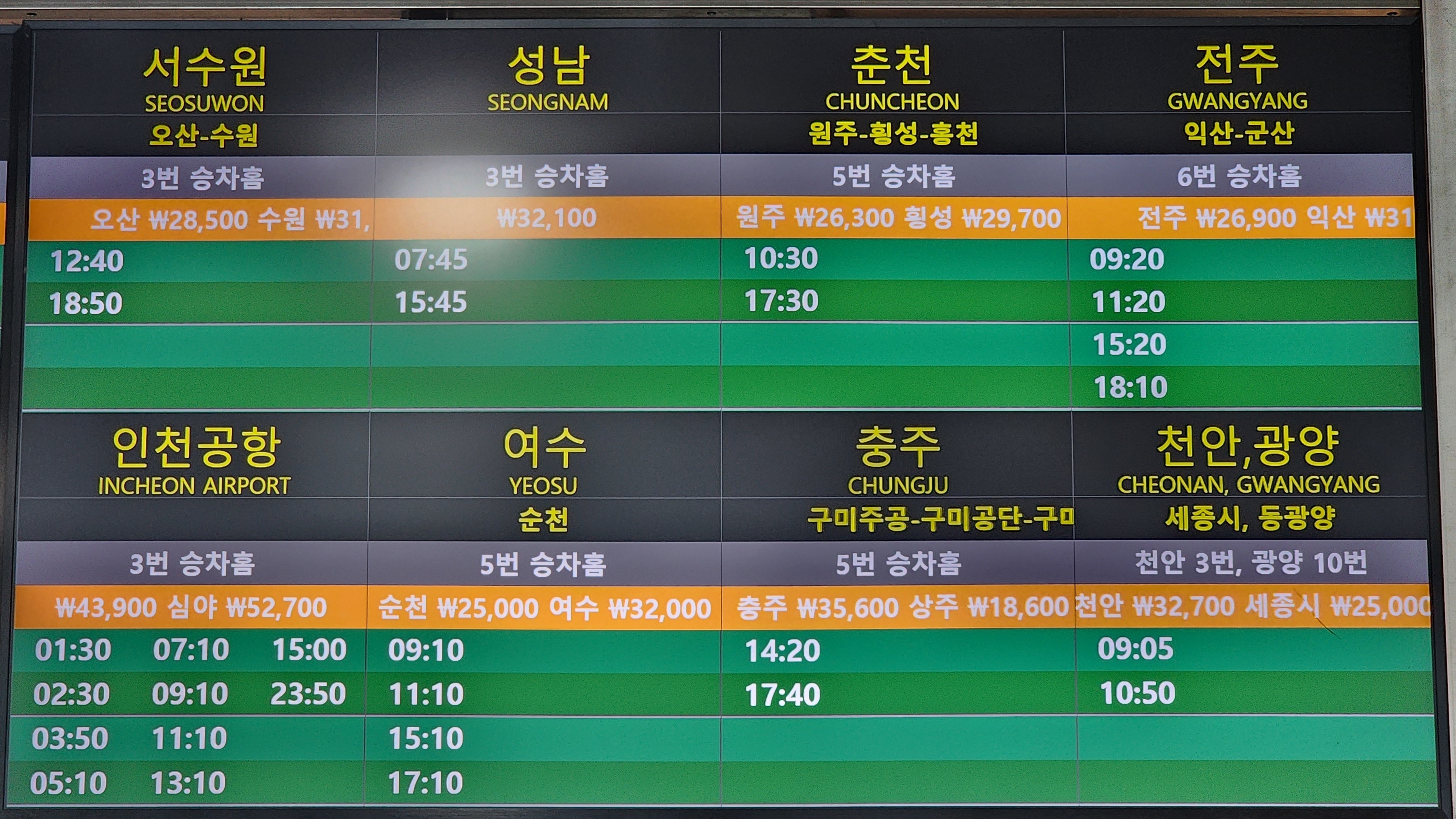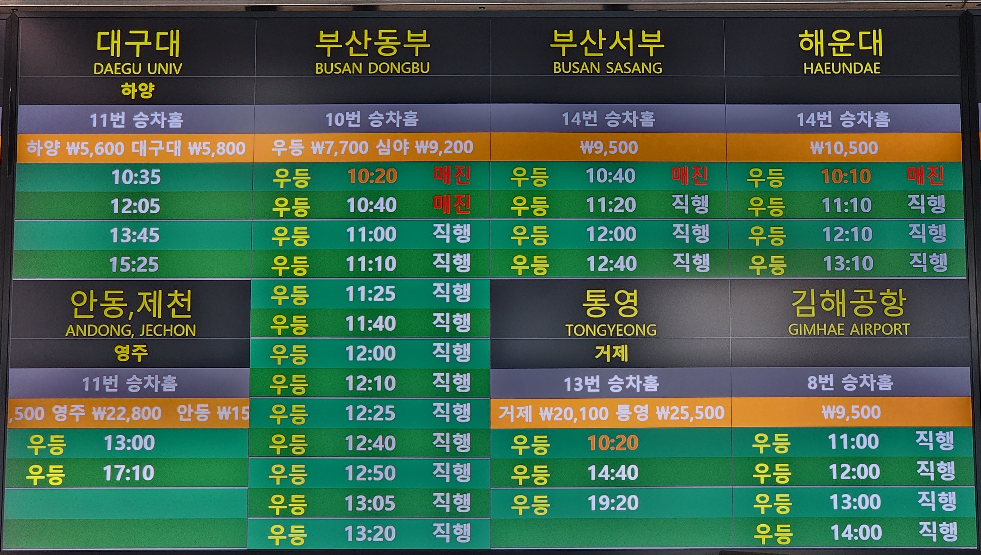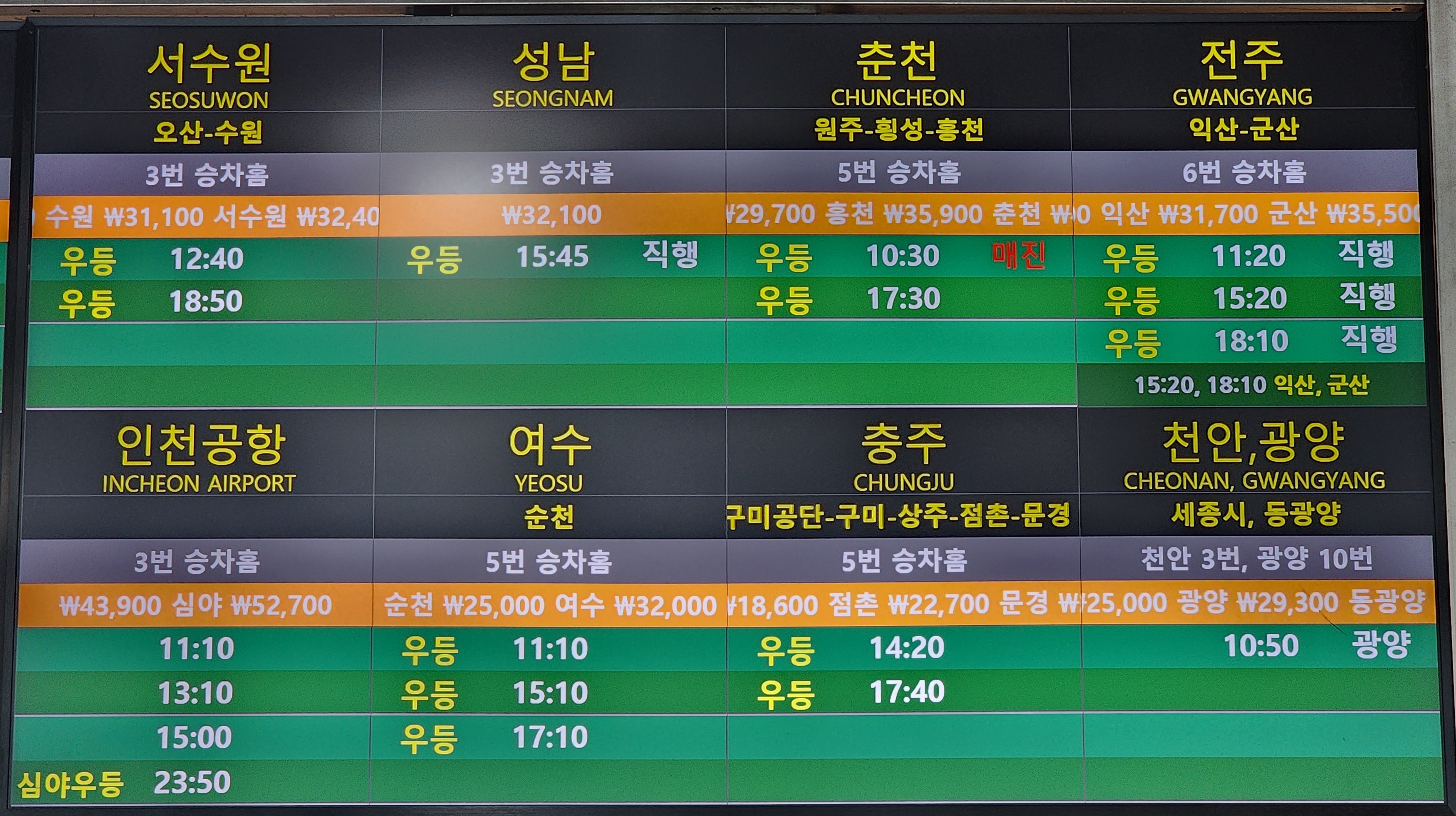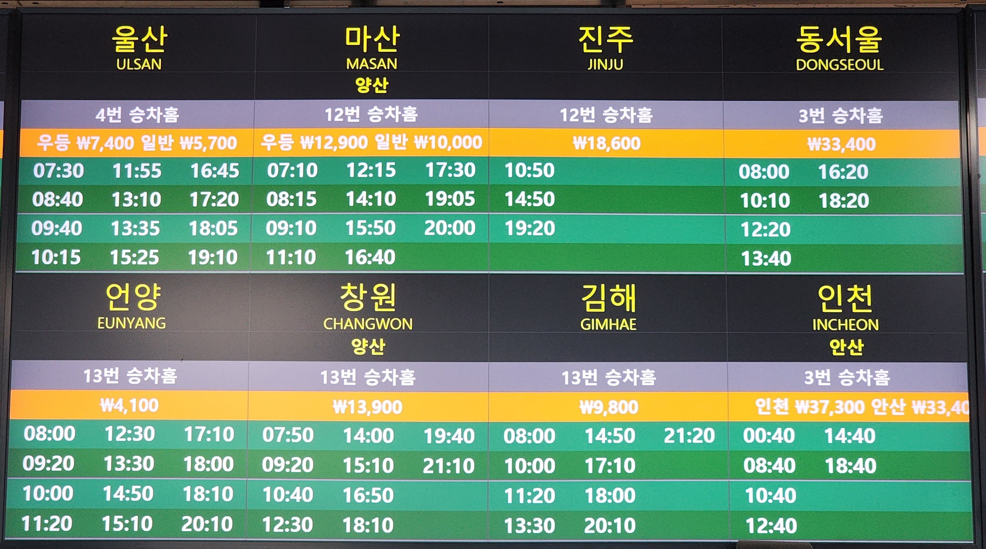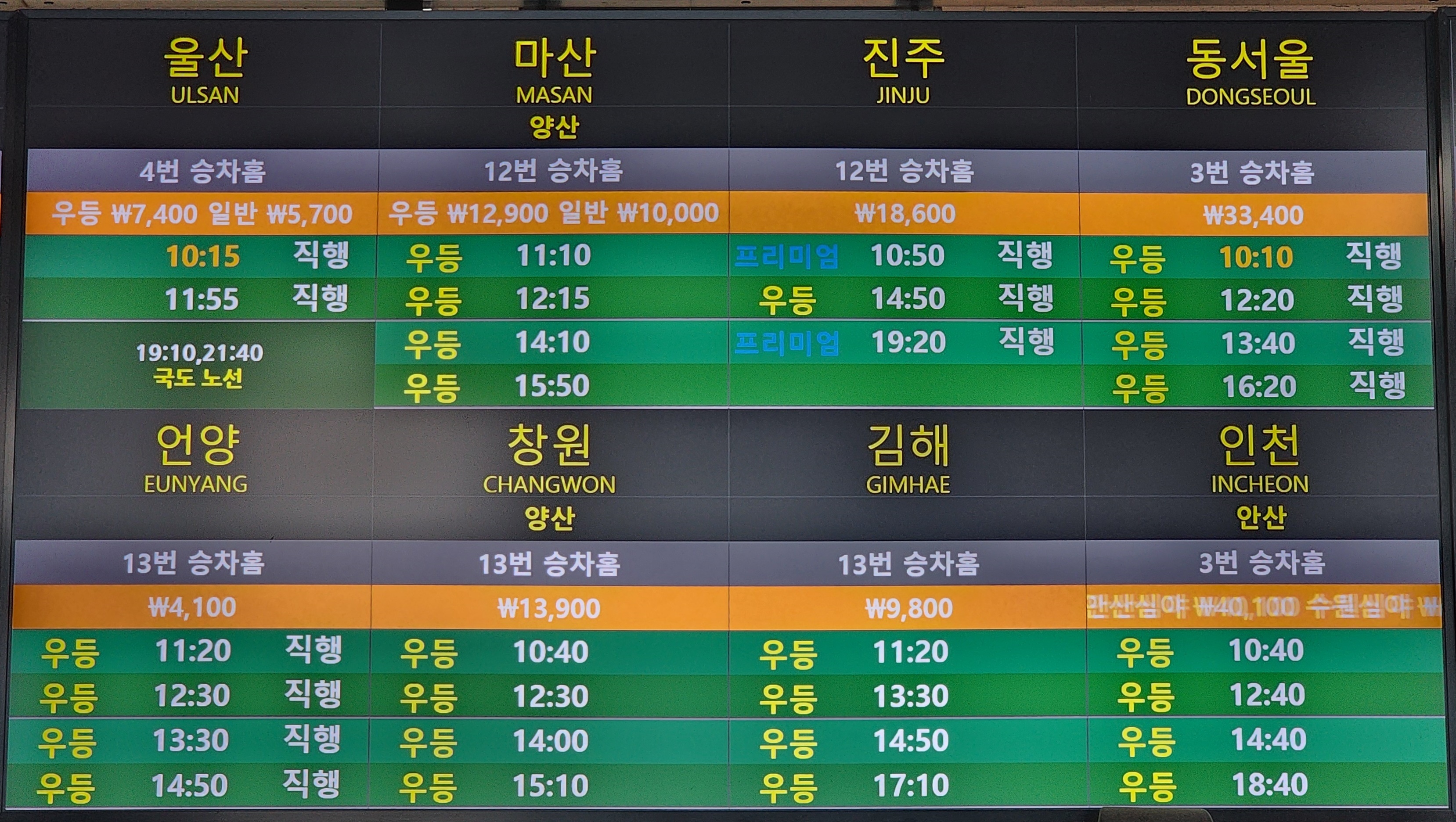 경주 출발 울산, 마산, 진주, 동서울, 언양, 창원, 김해, 인천, 안산 방면.