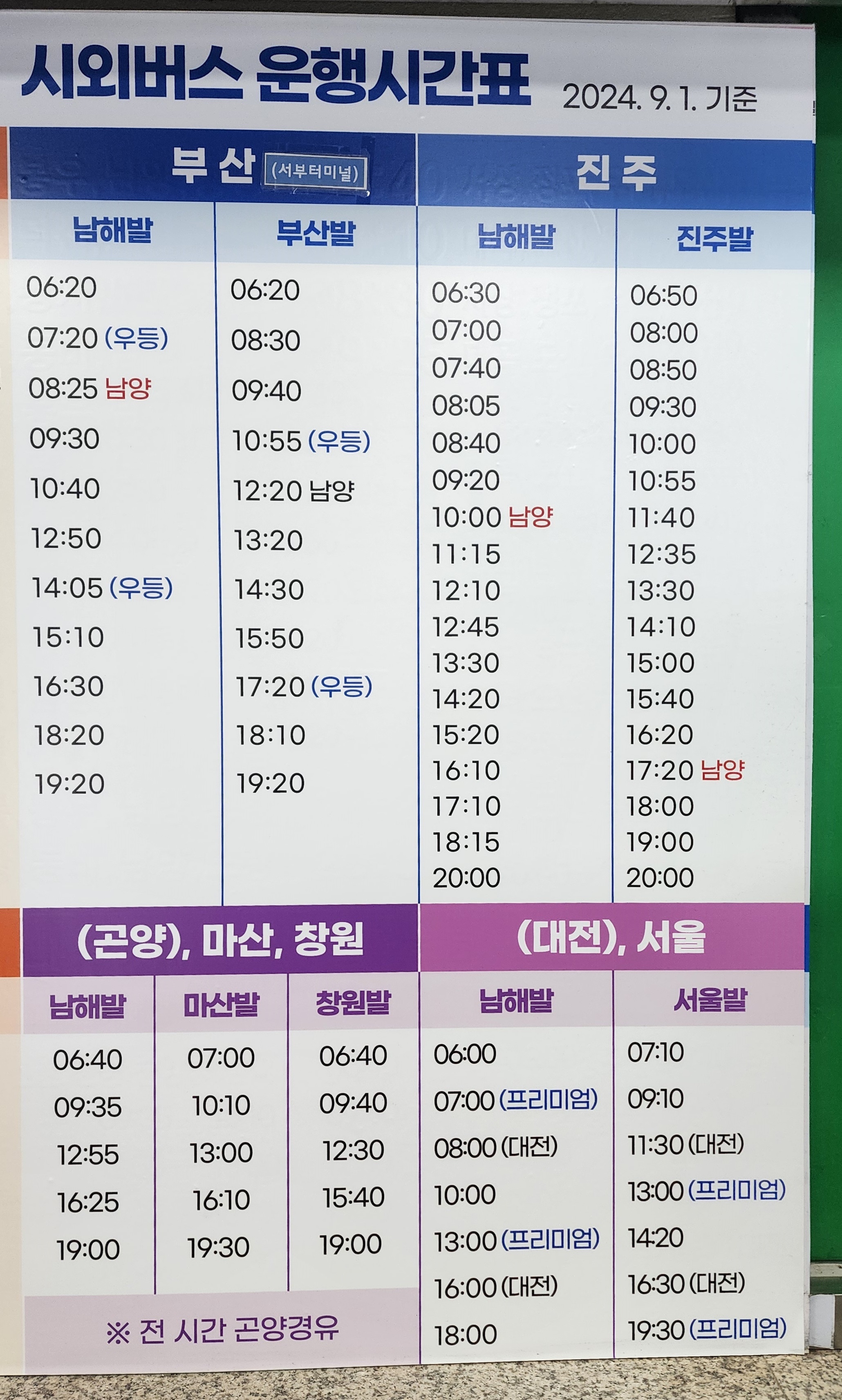 남해 출발 부산 서부, 진주, 곤양, 마산, 창원, 대전, 서울 방면.