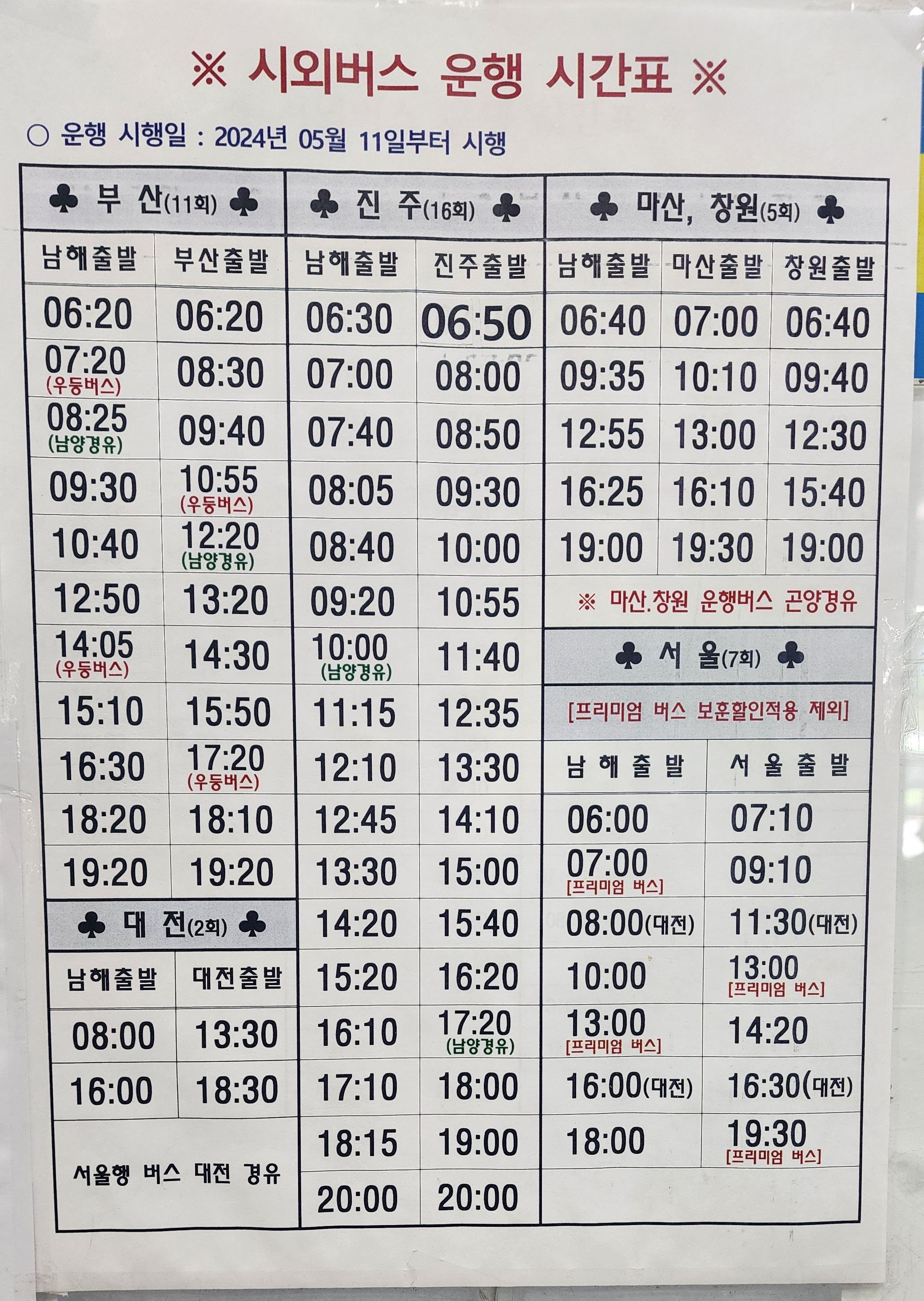 남해 출발 부산 서부, 진주, 곤양, 마산, 창원, 대전, 서울 방면.
