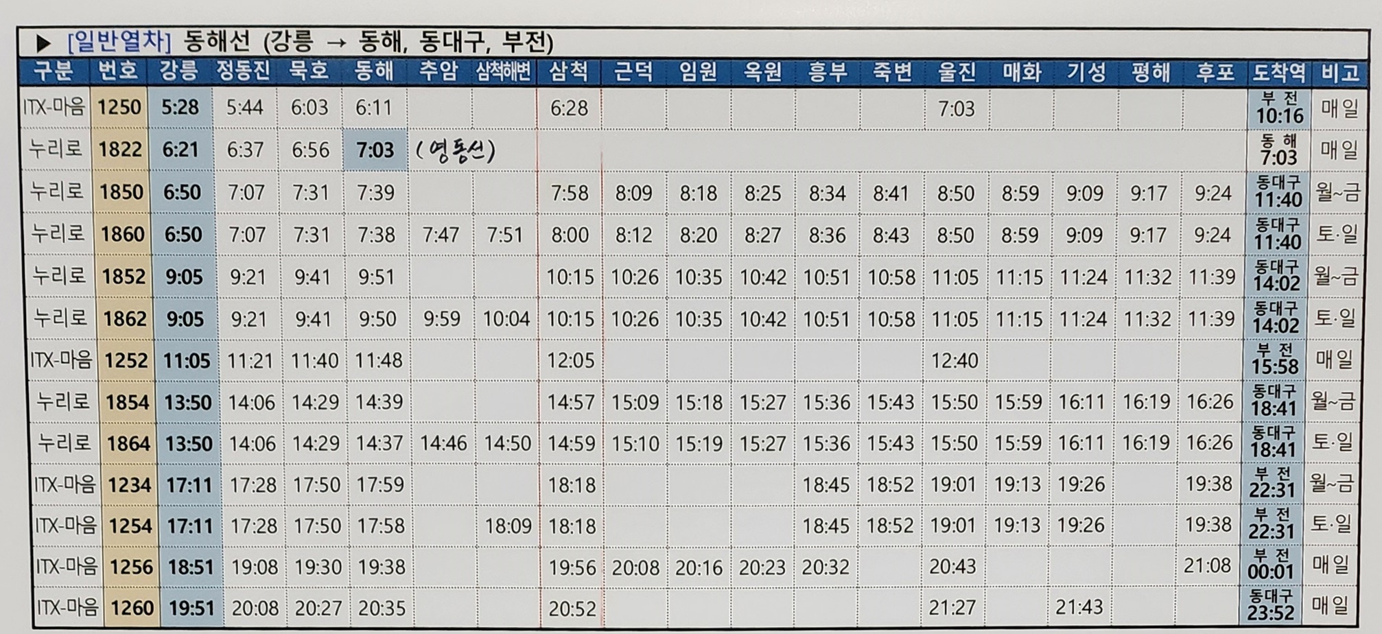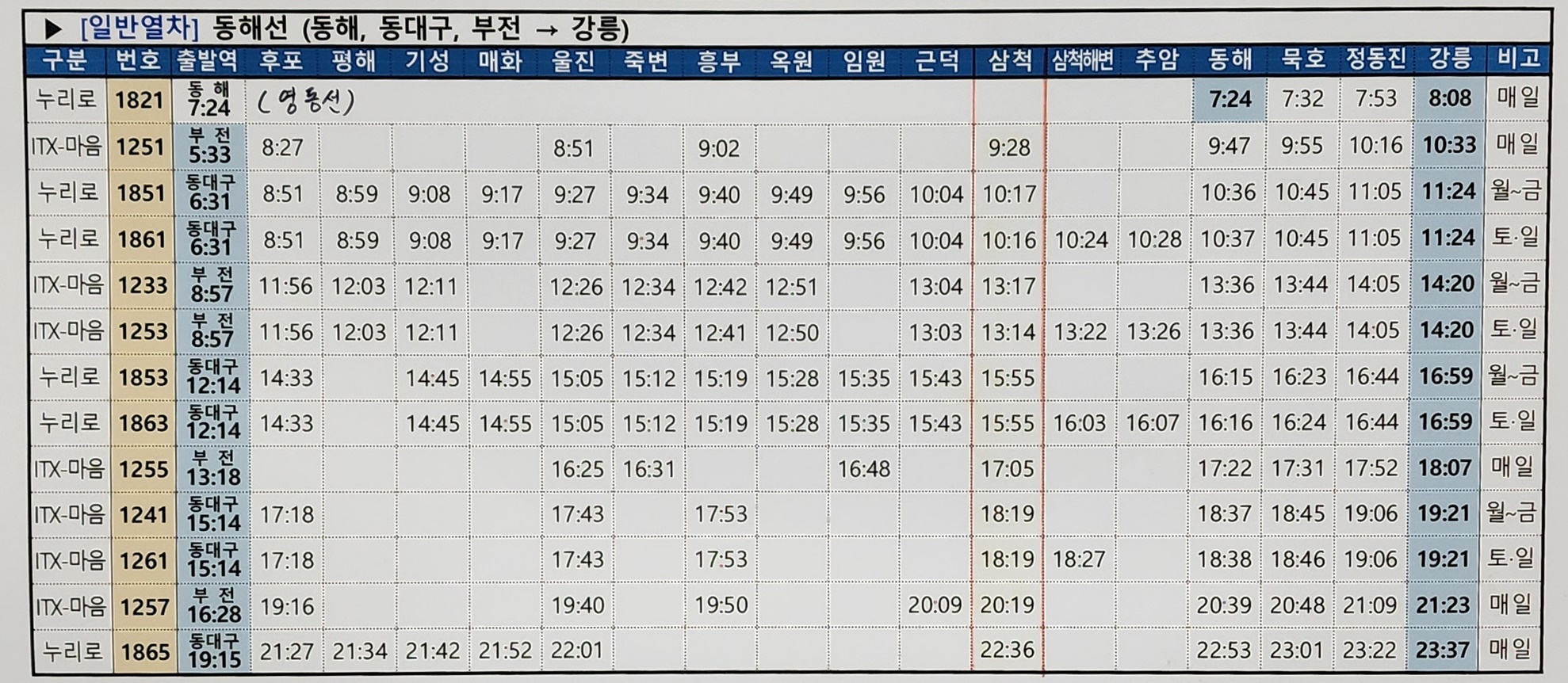 부전 출발동해, 묵호, 정동진, 강릉 방면.