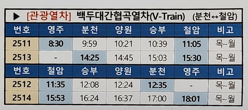 영주 출발 분천, 양원, 승부, 철암 방면.