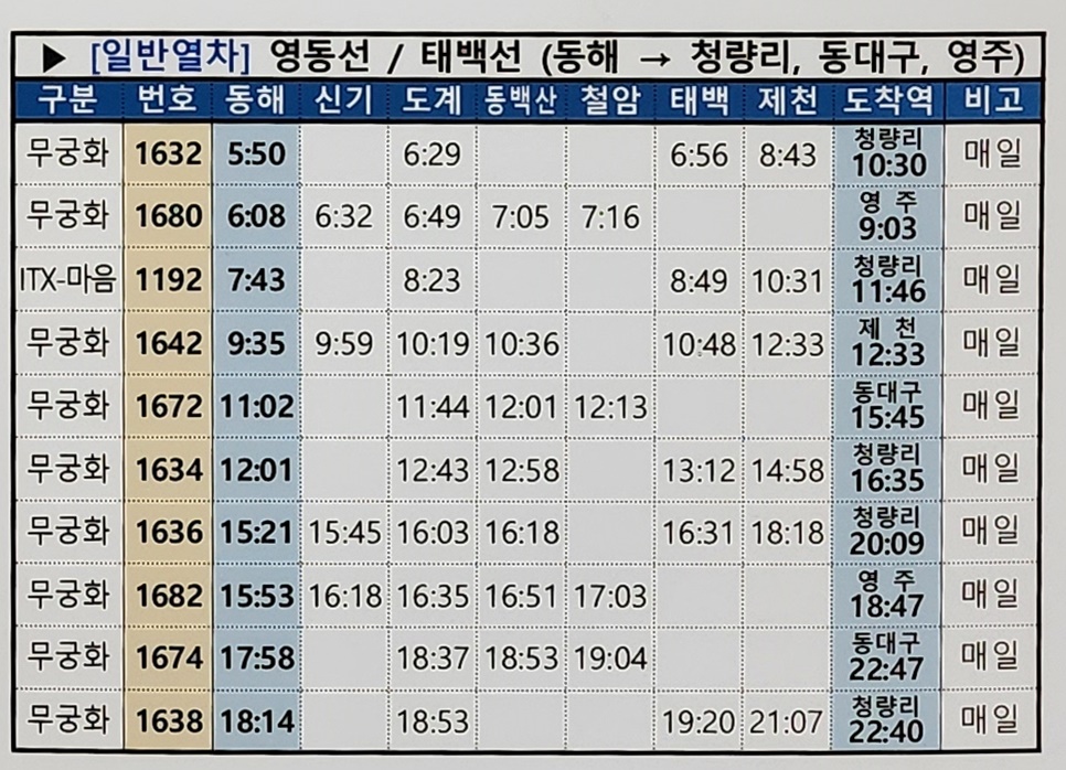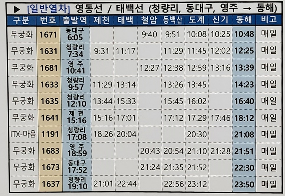동대구역 출발 제천, 태백, 철암, 동백산, 도계, 신기, 동해 방면.
