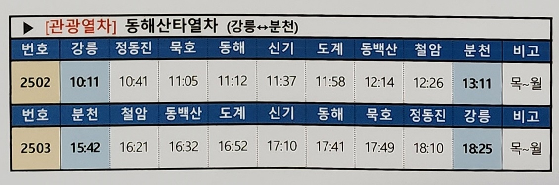 강릉 출발 정동진, 묵호, 동해, 신기, 도계, 동백산, 철암, 분천 방면(목~월)