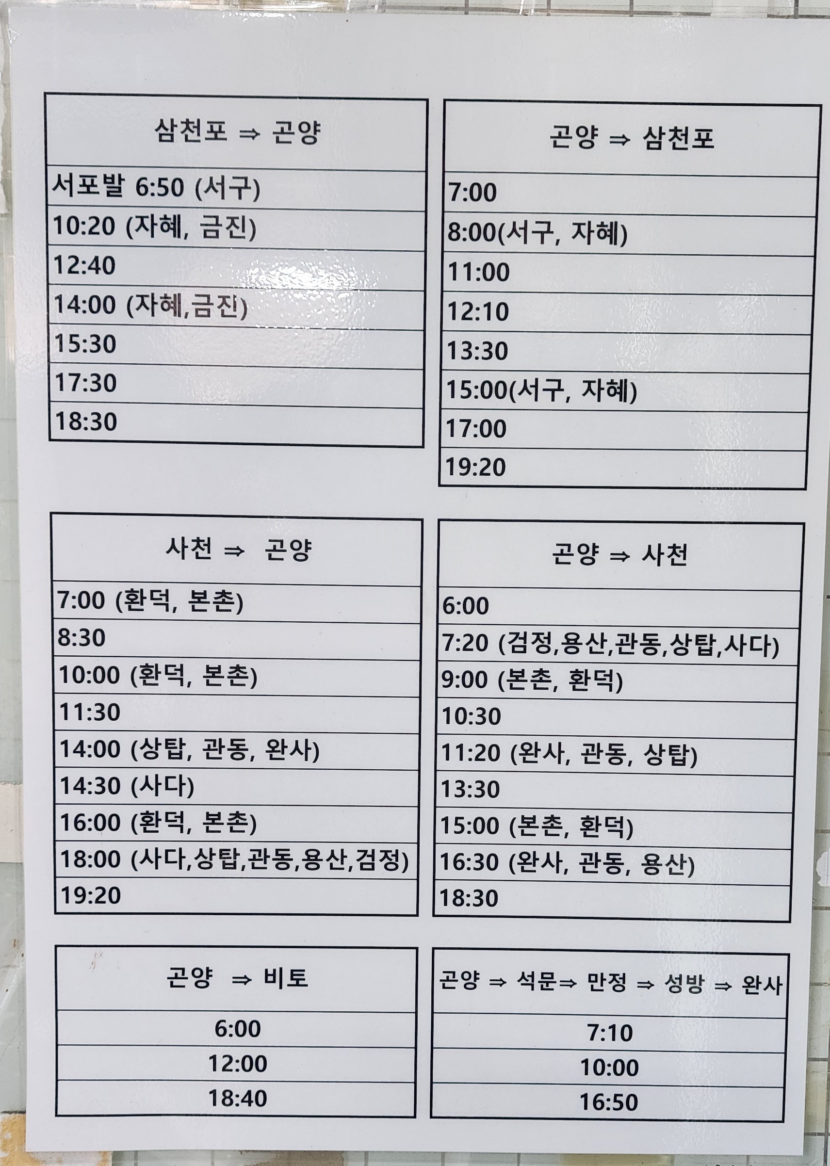 곤양 출발 삼천포, 사천, 비토, 석문, 만정, 성방, 완사 방면.