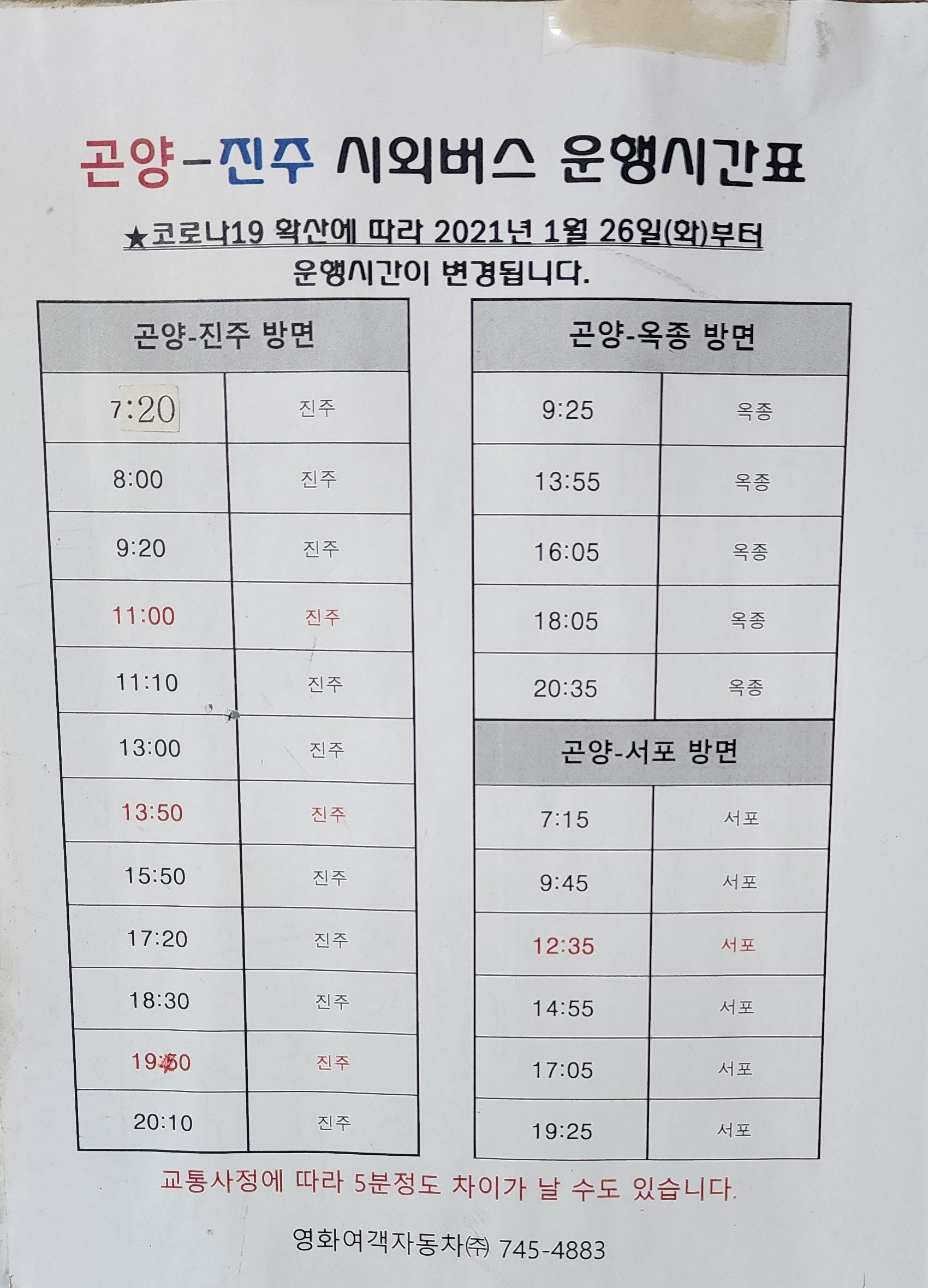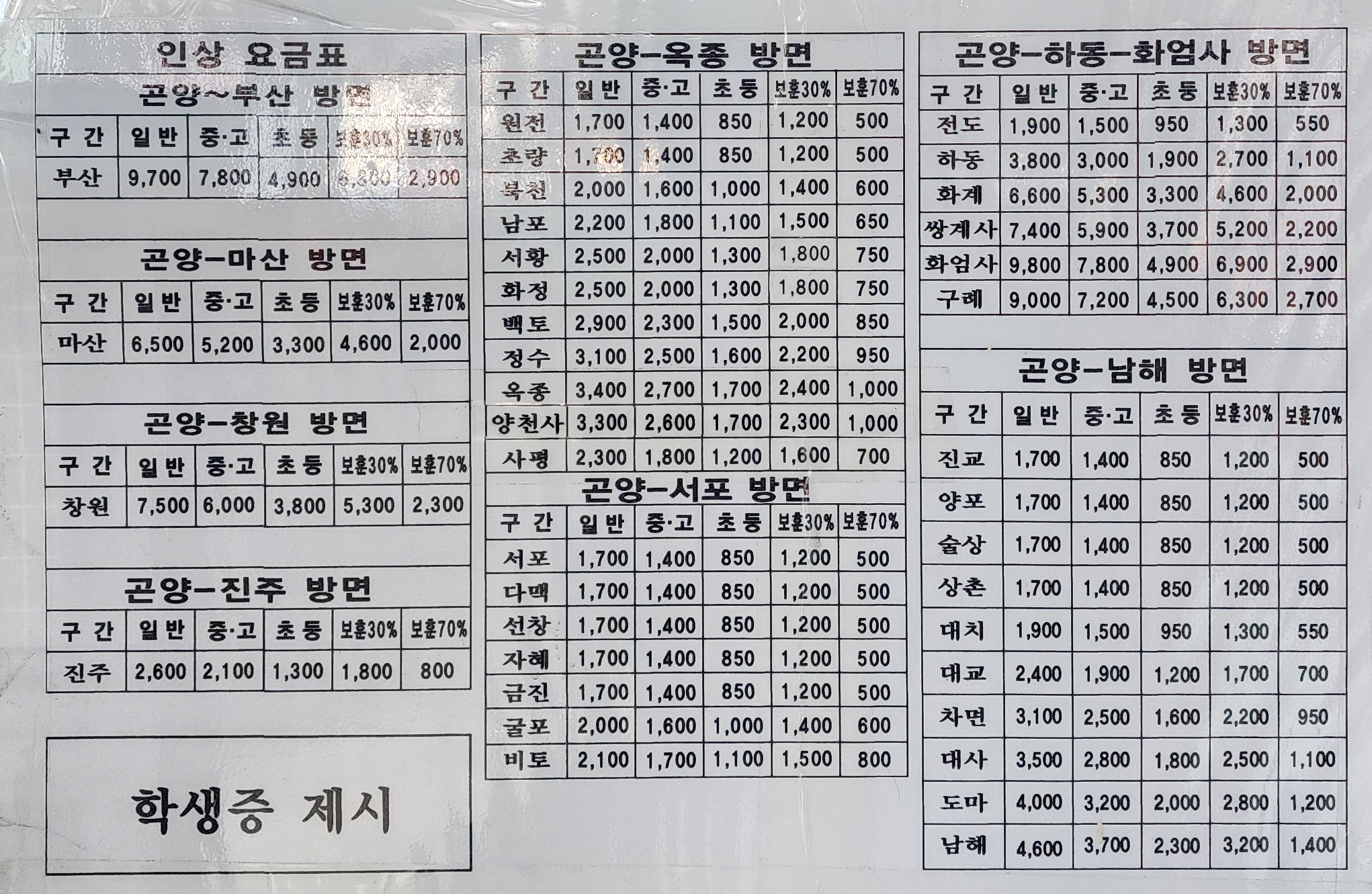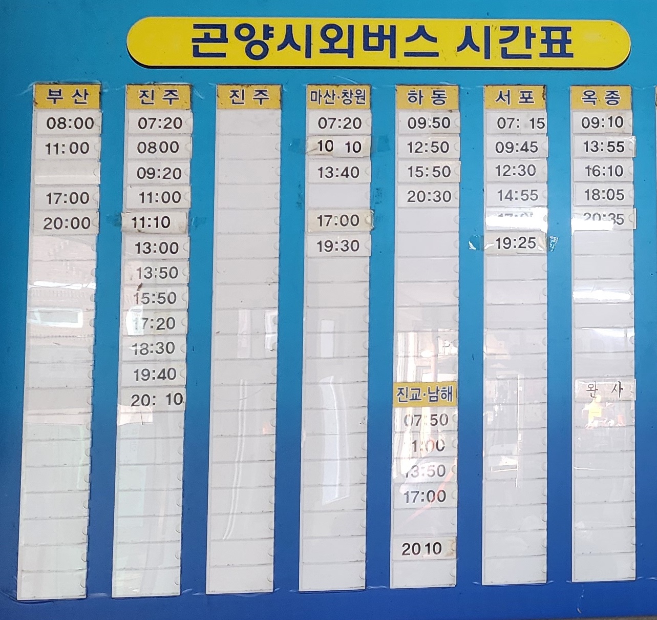 곤양 출발 부산, 진주, 마산, 창원, 하동, 진교, 남해, 서포, 옥종 방면.
