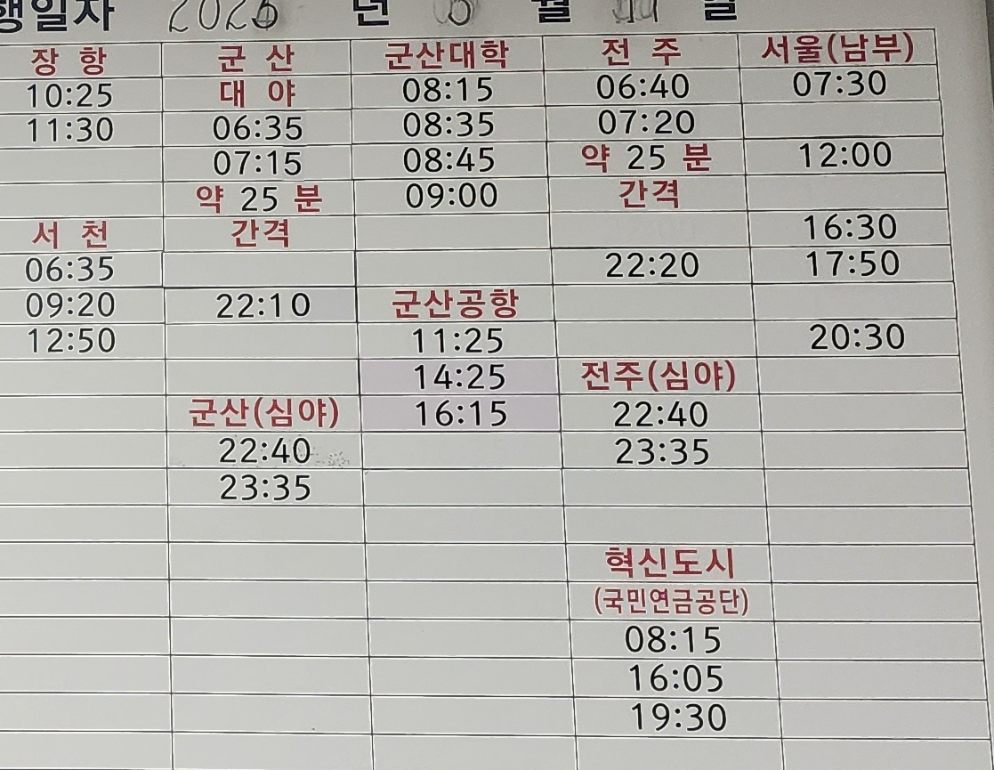 익산 출발 장항, 군산, 대야, 군산대학, 군산공항, 전주, 전주혁신도시, 서울 남부 방면.