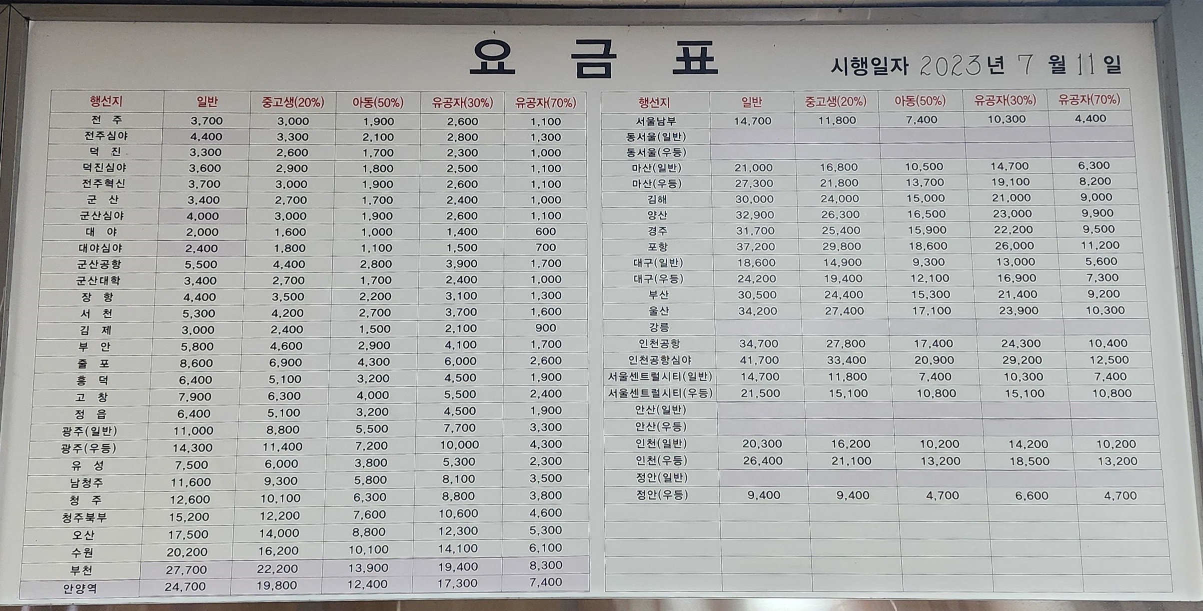 익산고속시외버스터미널 요금표