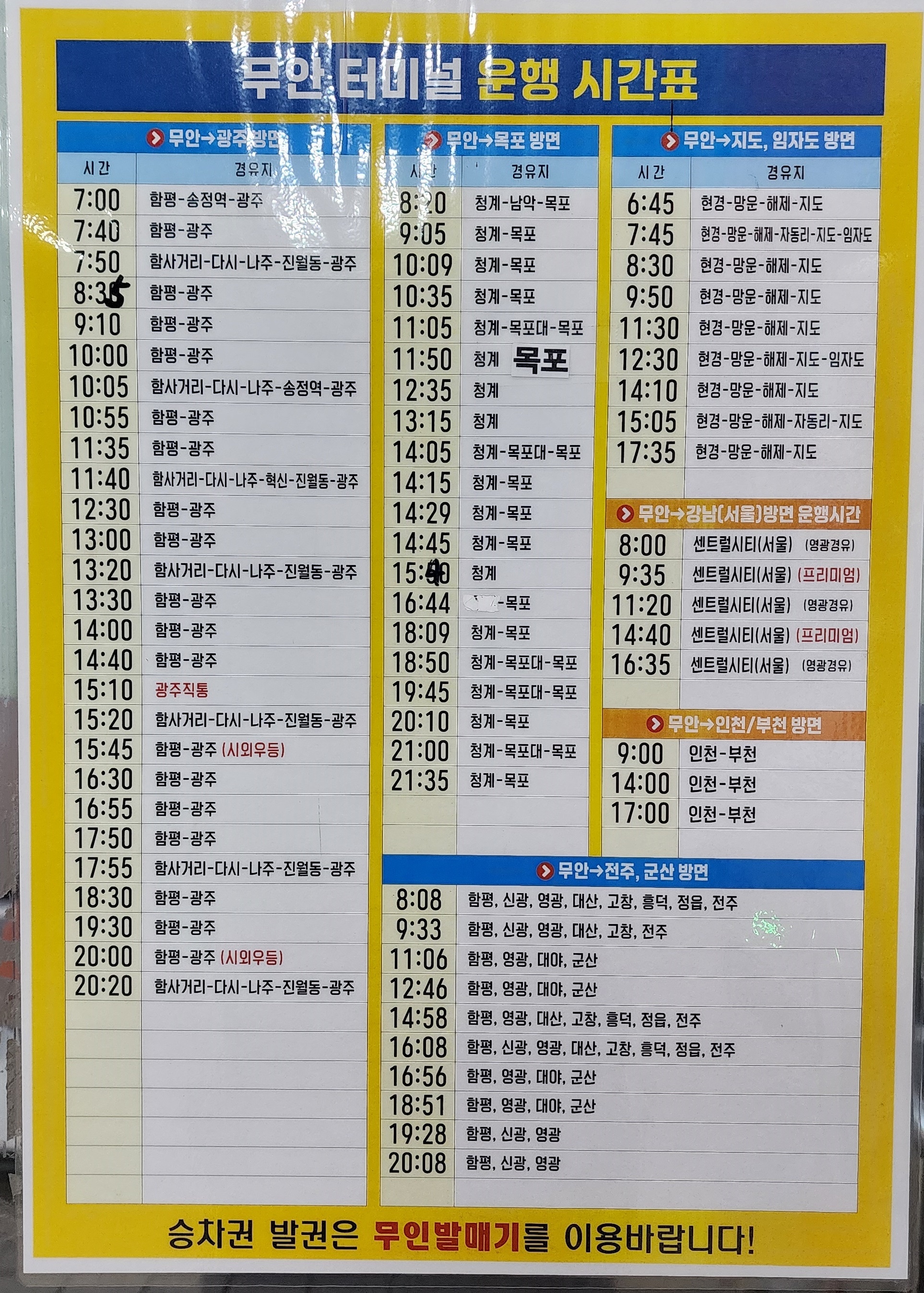 무안 출발 광주, 목포, 지도, 임자도 방면.