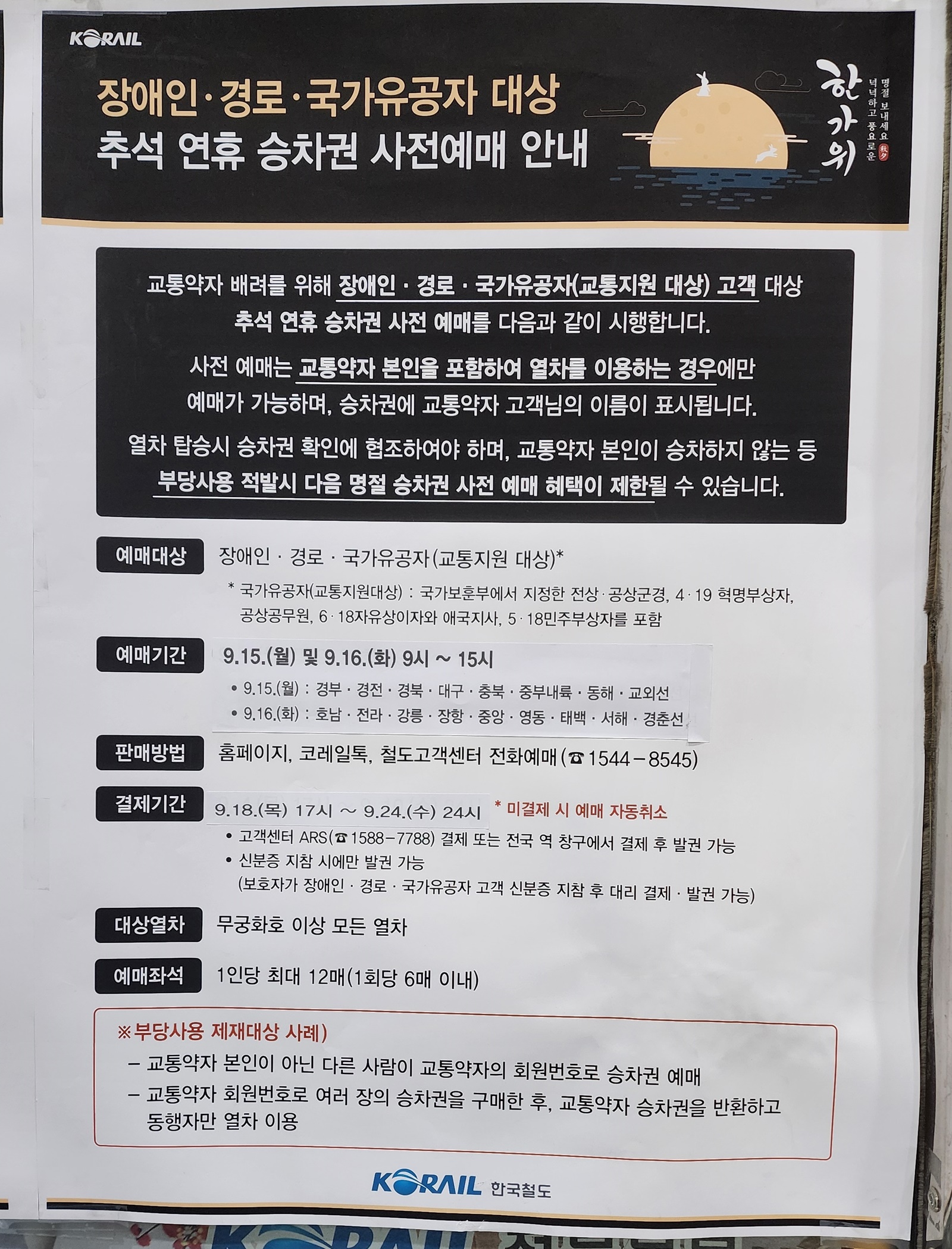 예매방법 코레일톡, 옴페이지 등(온라인 예매시 회원가입 필수) *역 창구 예매 없음