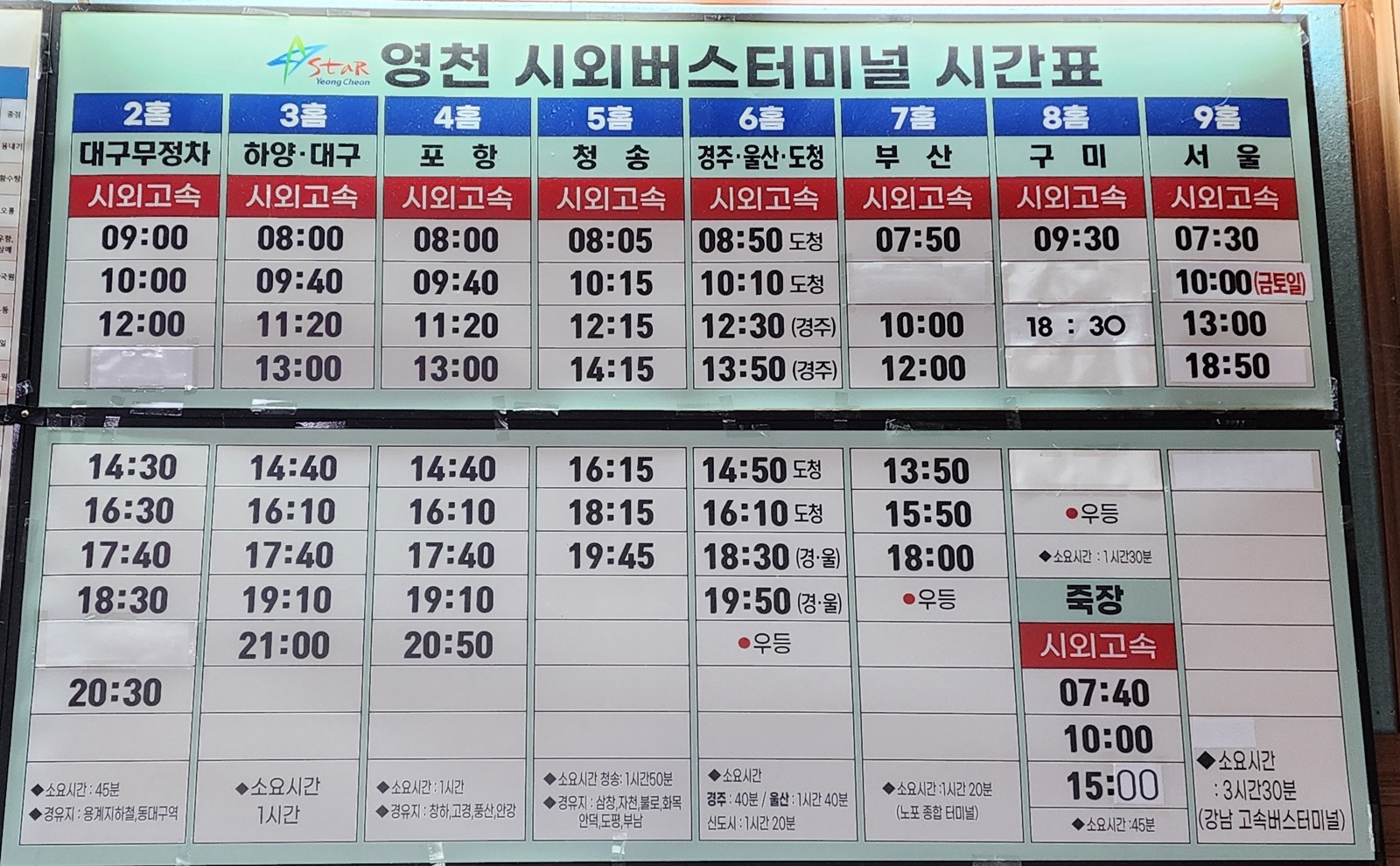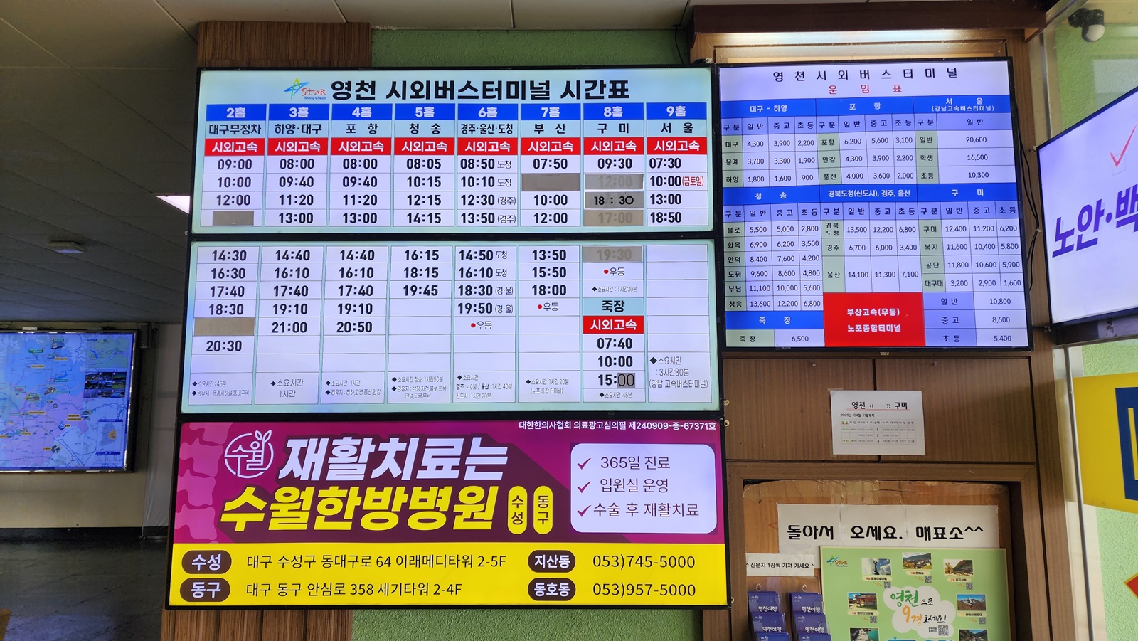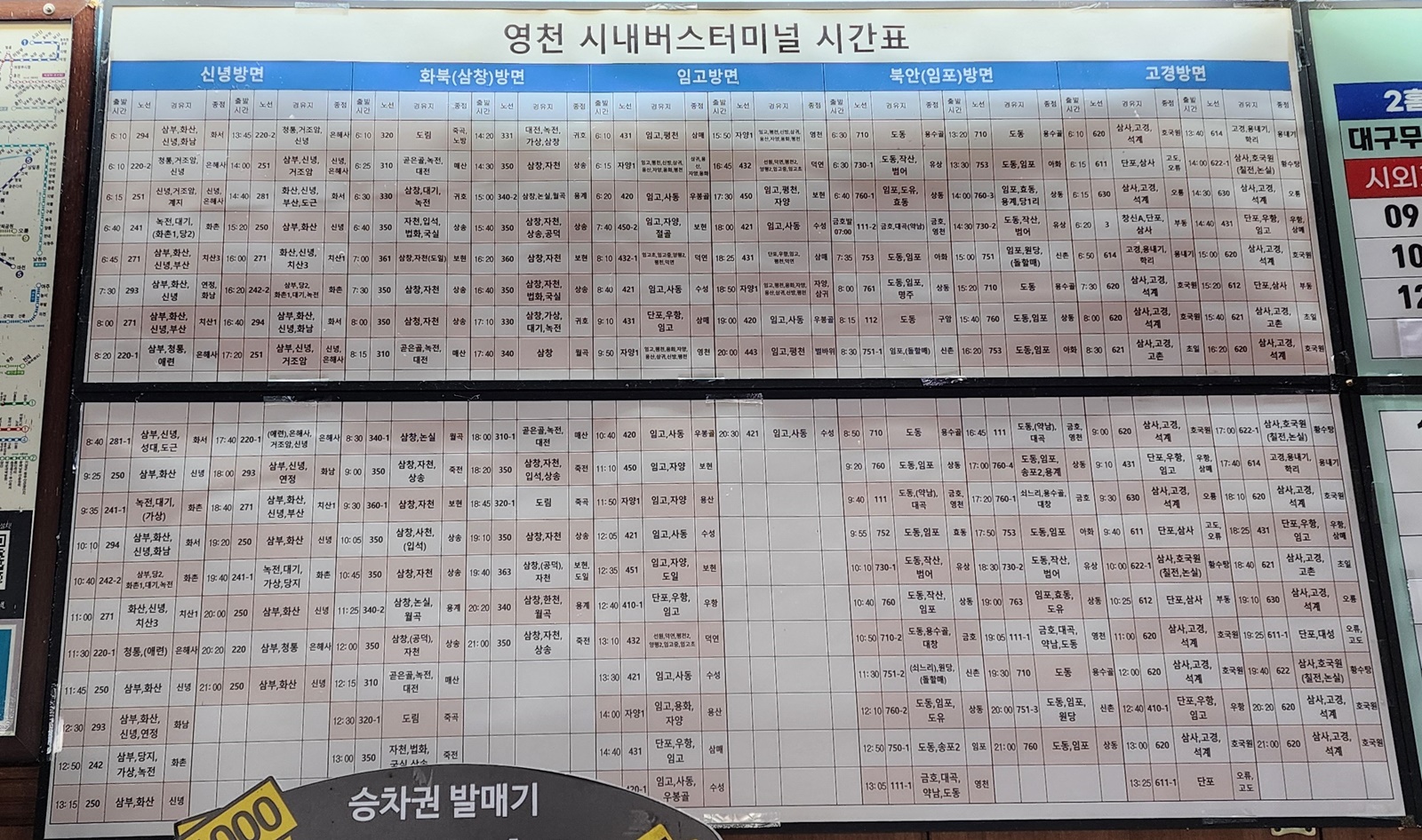 영천 출발 대구, 하양, 포항, 청송, 경주, 울산, 도청, 부산, 구미, 서울 방면.