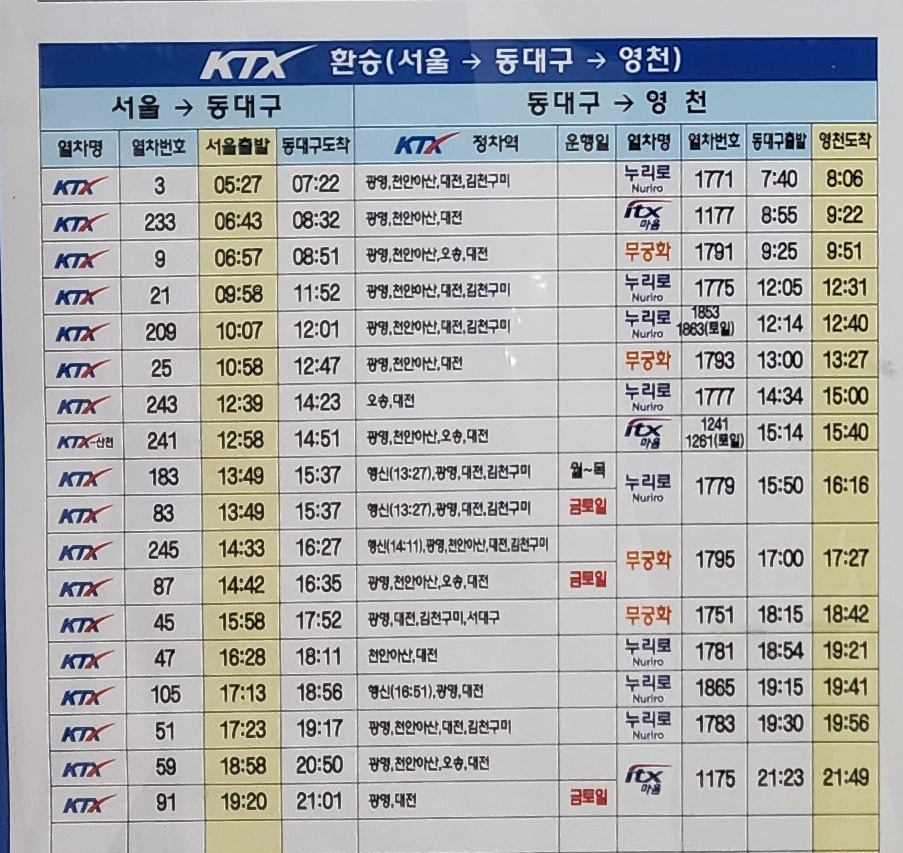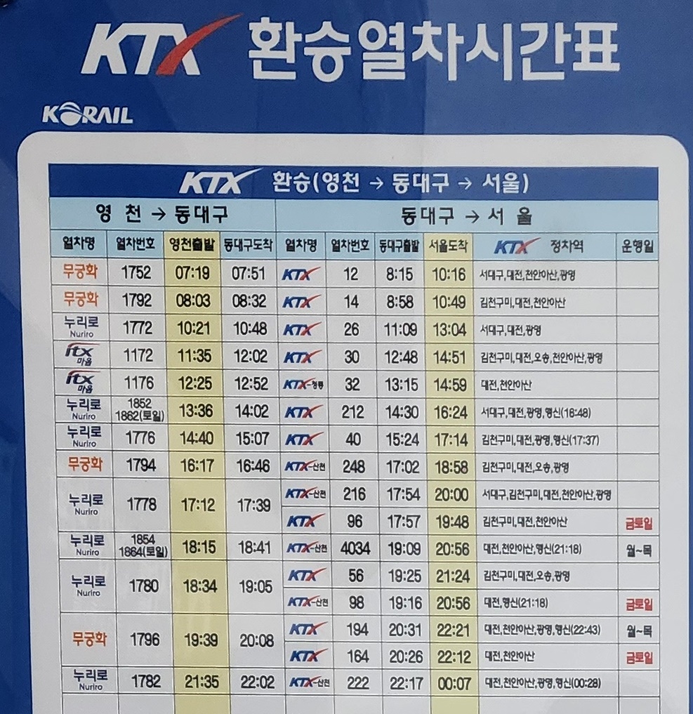 영천역 KTX, ITX , 누리로, 무궁화호 여객운임표