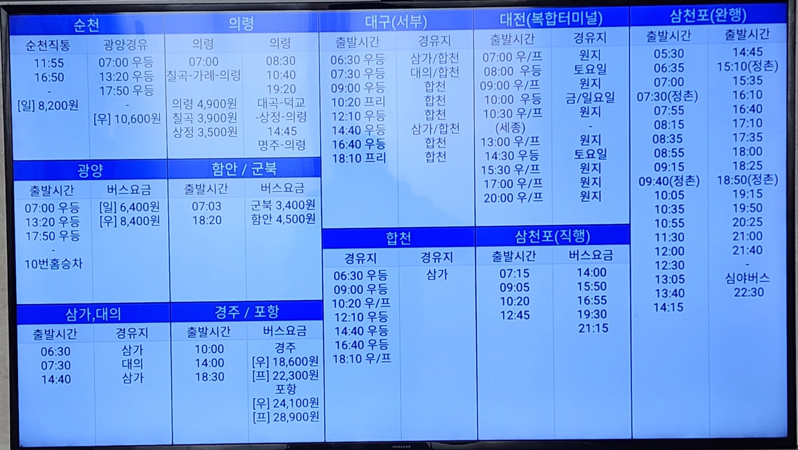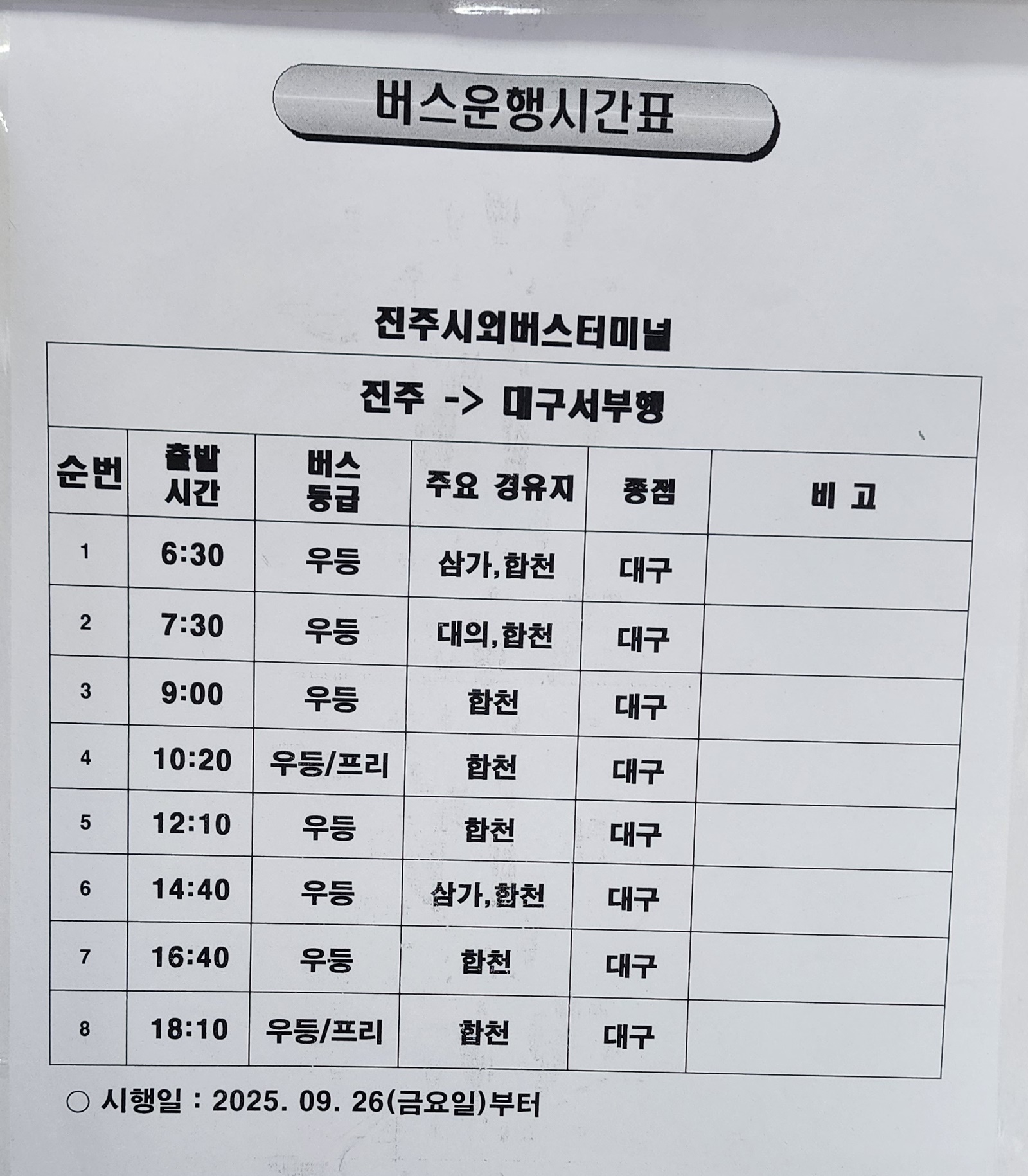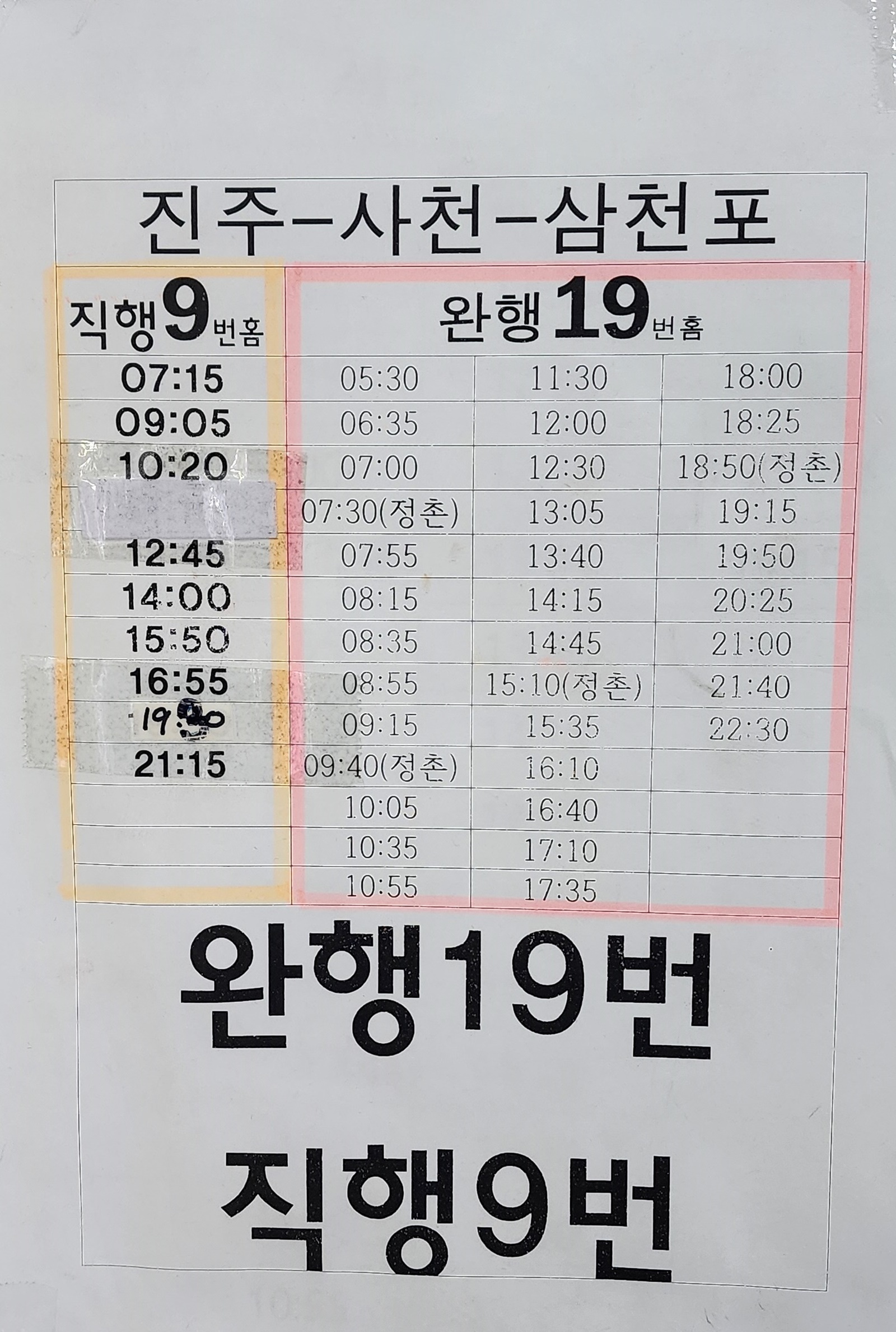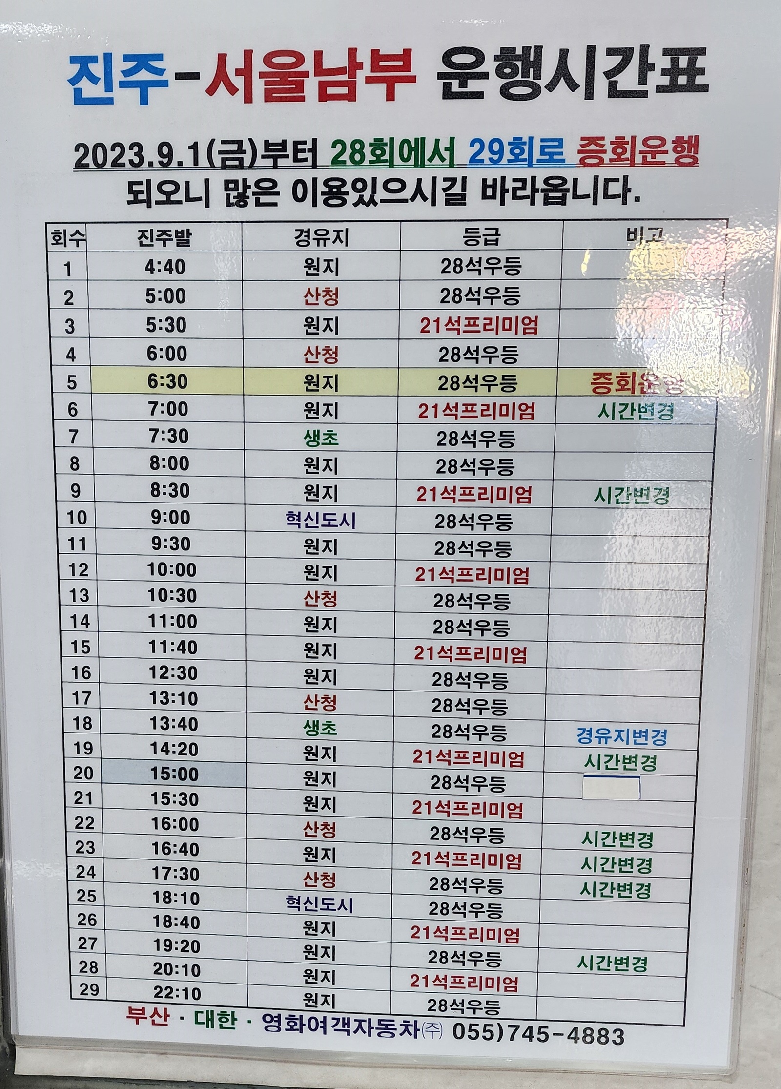 진주 출발 순천, 광양, 삼가, 대의, 의령, 함안, 군북, 경주, 포항, 대구 서부, 합천, 대전, 삼천포 방면.