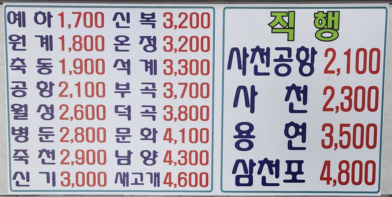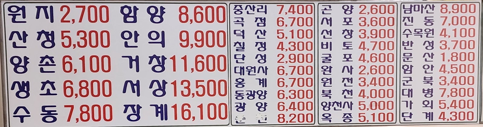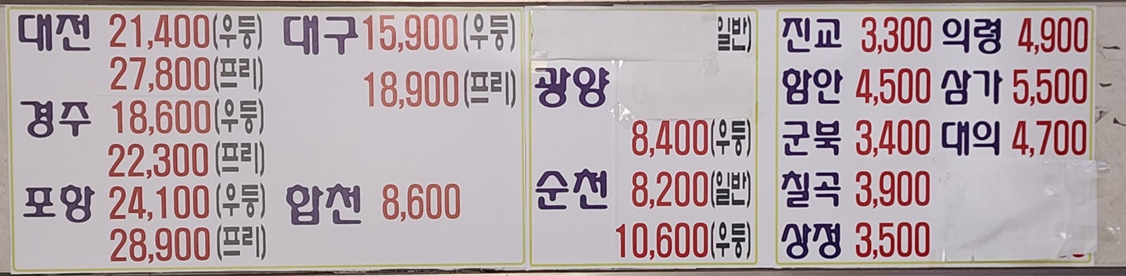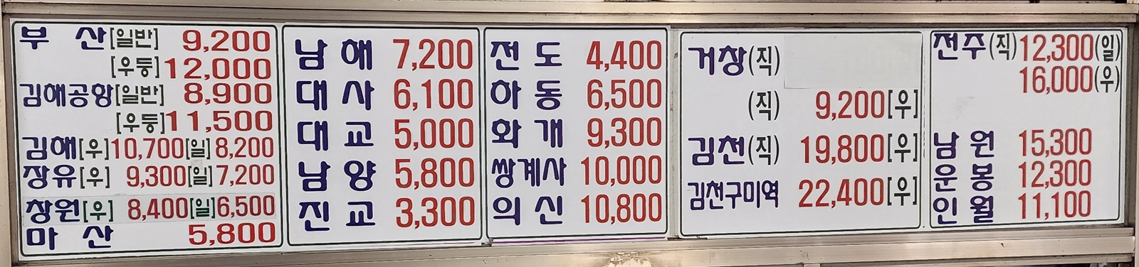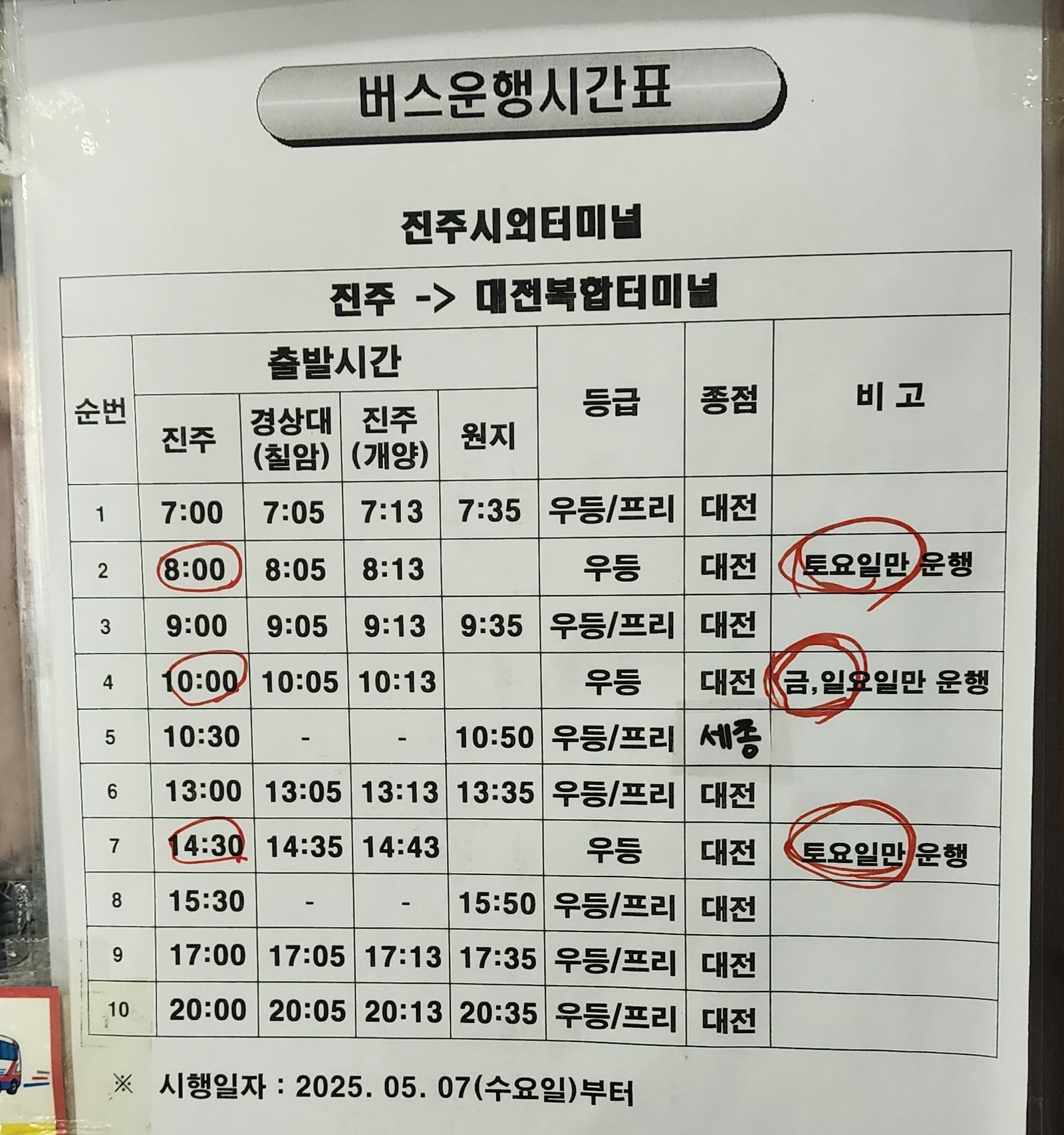 진주 출발 순천, 광양, 삼가, 대의, 의령, 함안, 군북, 경주, 포항, 대구 서부, 합천, 대전, 삼천포 방면.