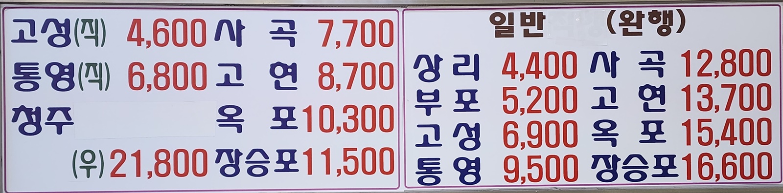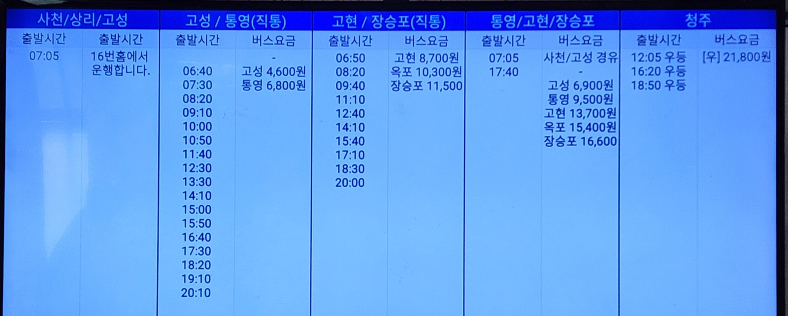 진주 출발 사천, 상리, 고성, 통영, 고현, 장승포, 청주 방면.