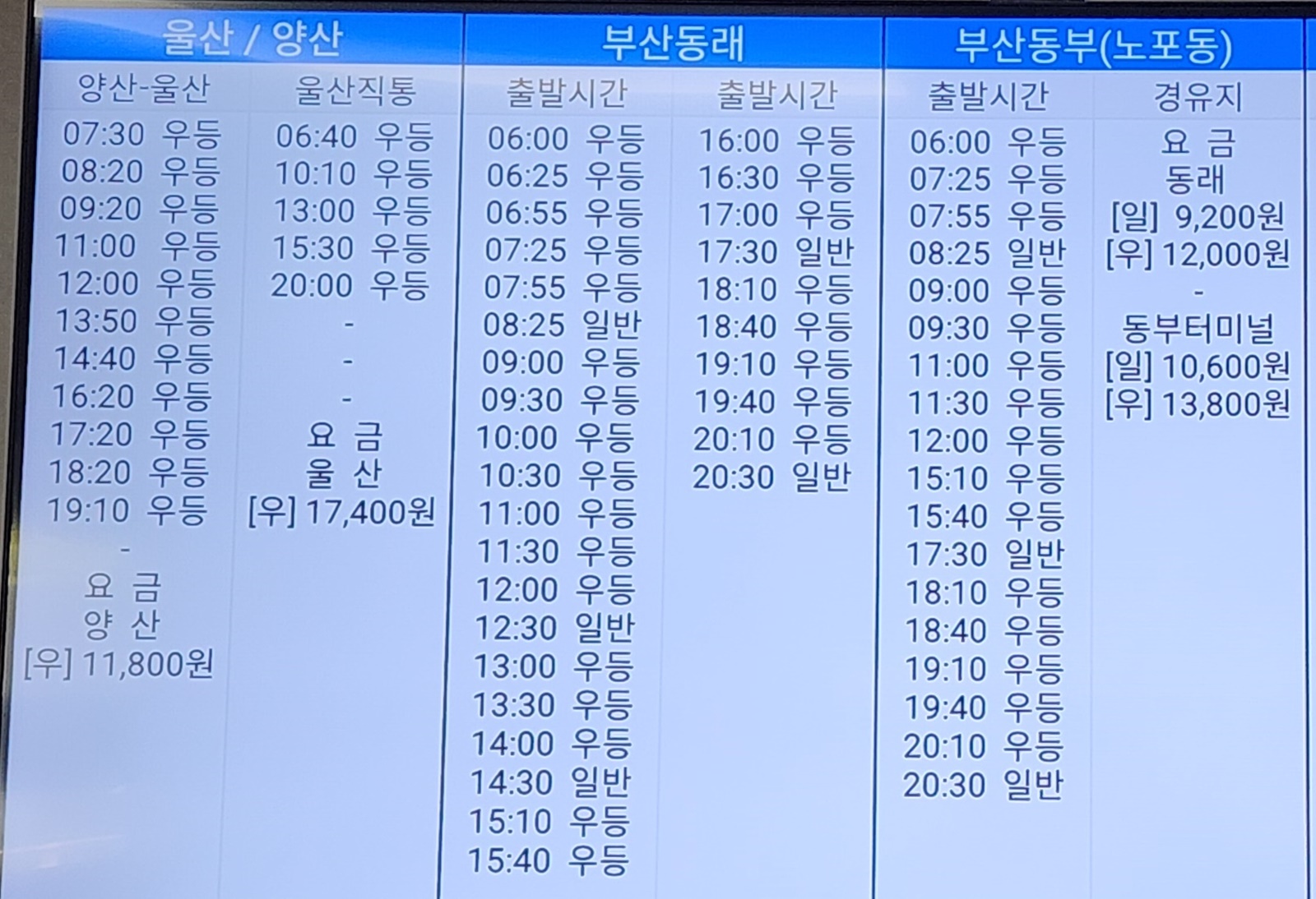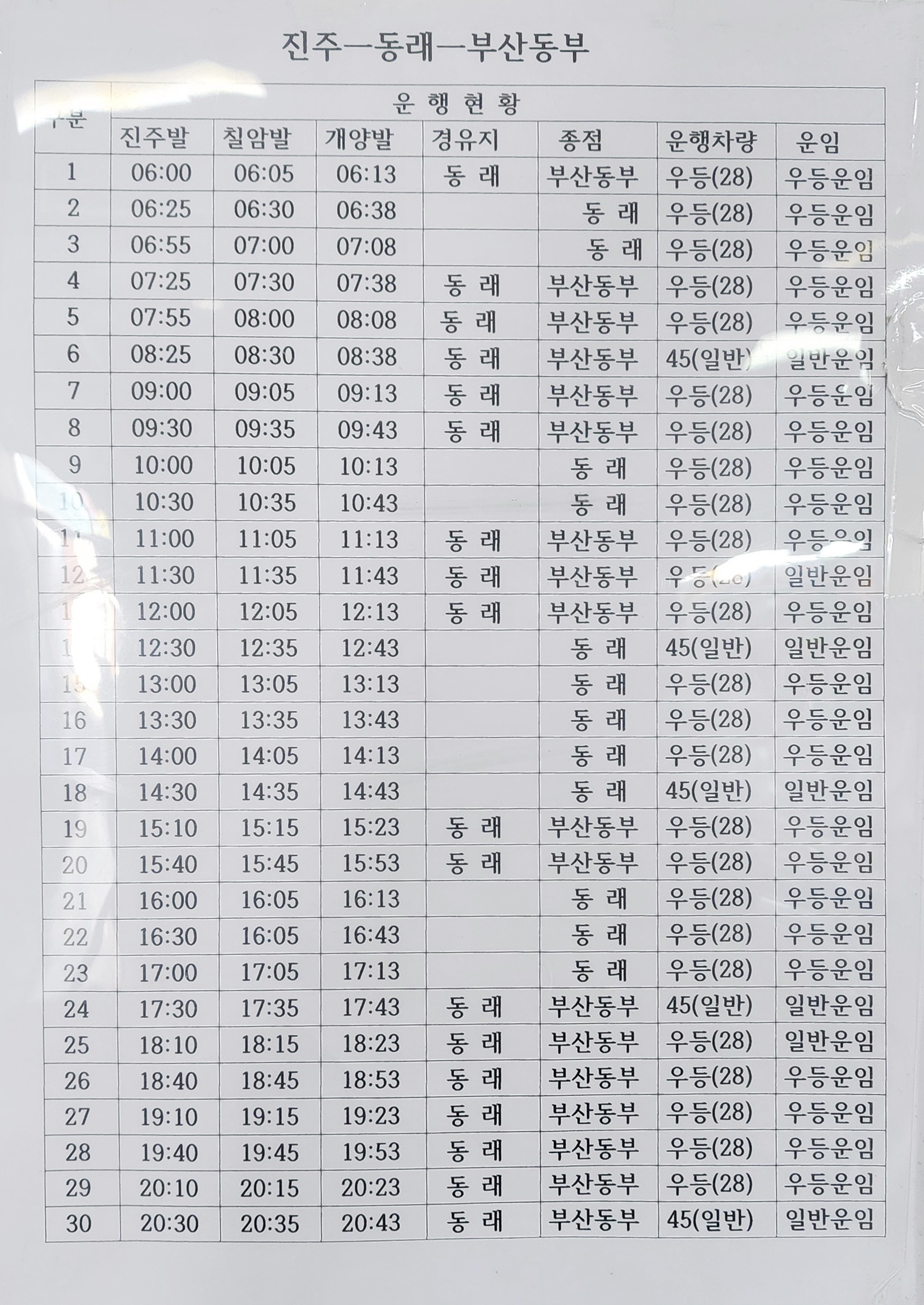 진주 출발 울산, 양산, 부산동래, 부산동부 노포동 방면.