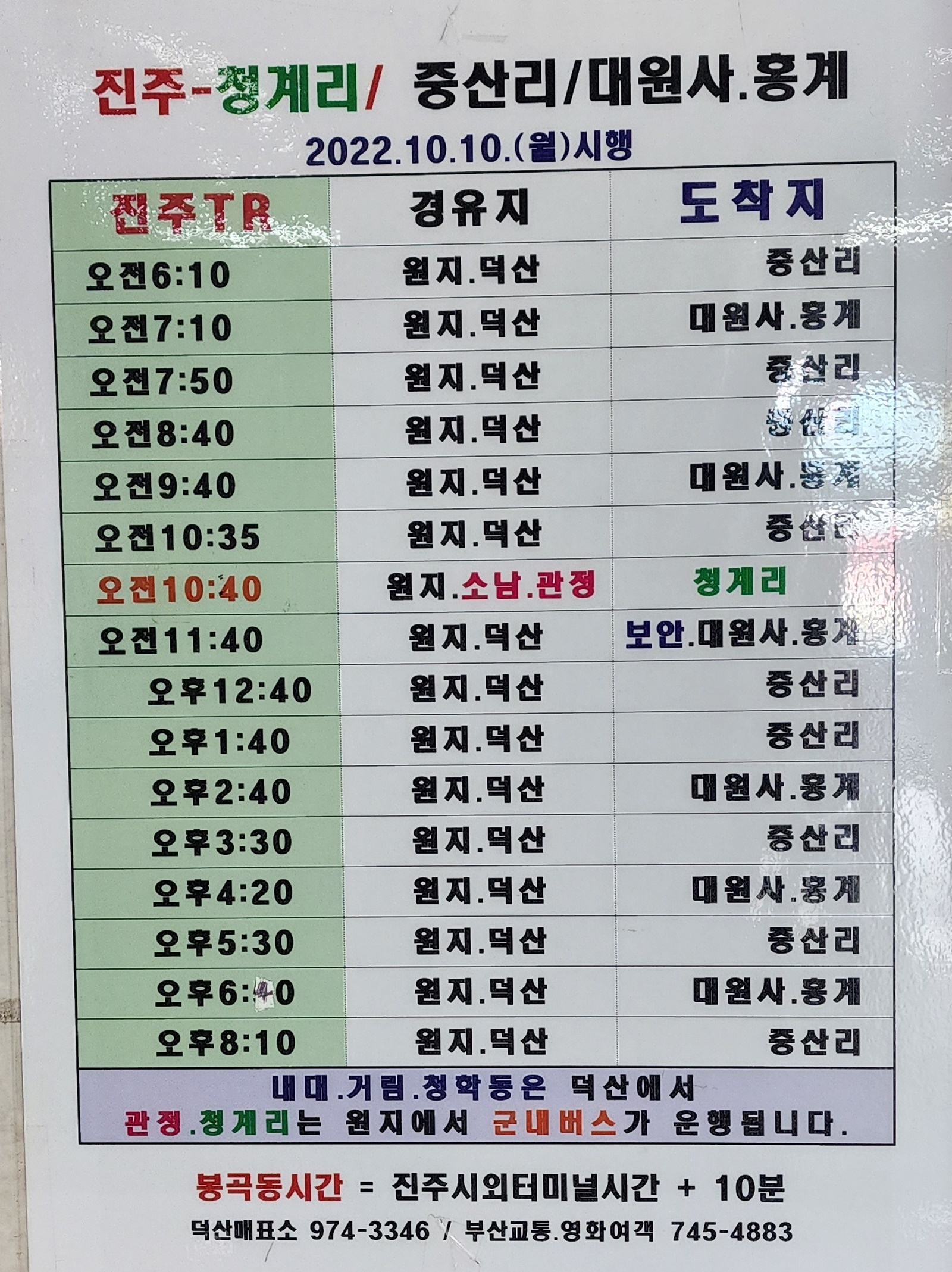 진주 출발 중산리, 청계리, 대원사, 홍계, 가회, 대병, 완사, 곤양, 옥종, 북천, 서포 곤양 경유, 서울 남부터미널 방면.