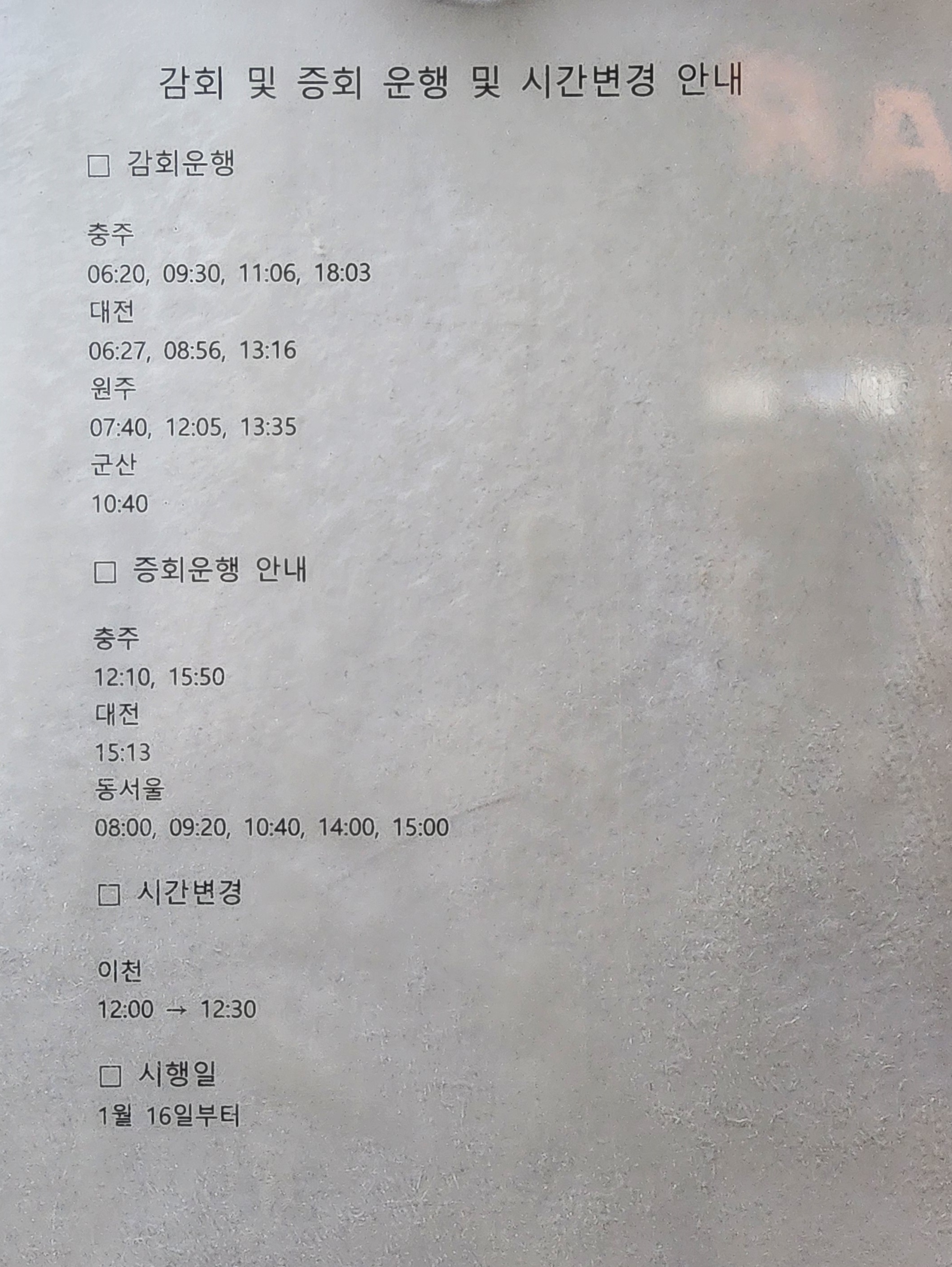 청주 출발 원주, 강릉, 태백, 천안, 대전, 공주 방면.