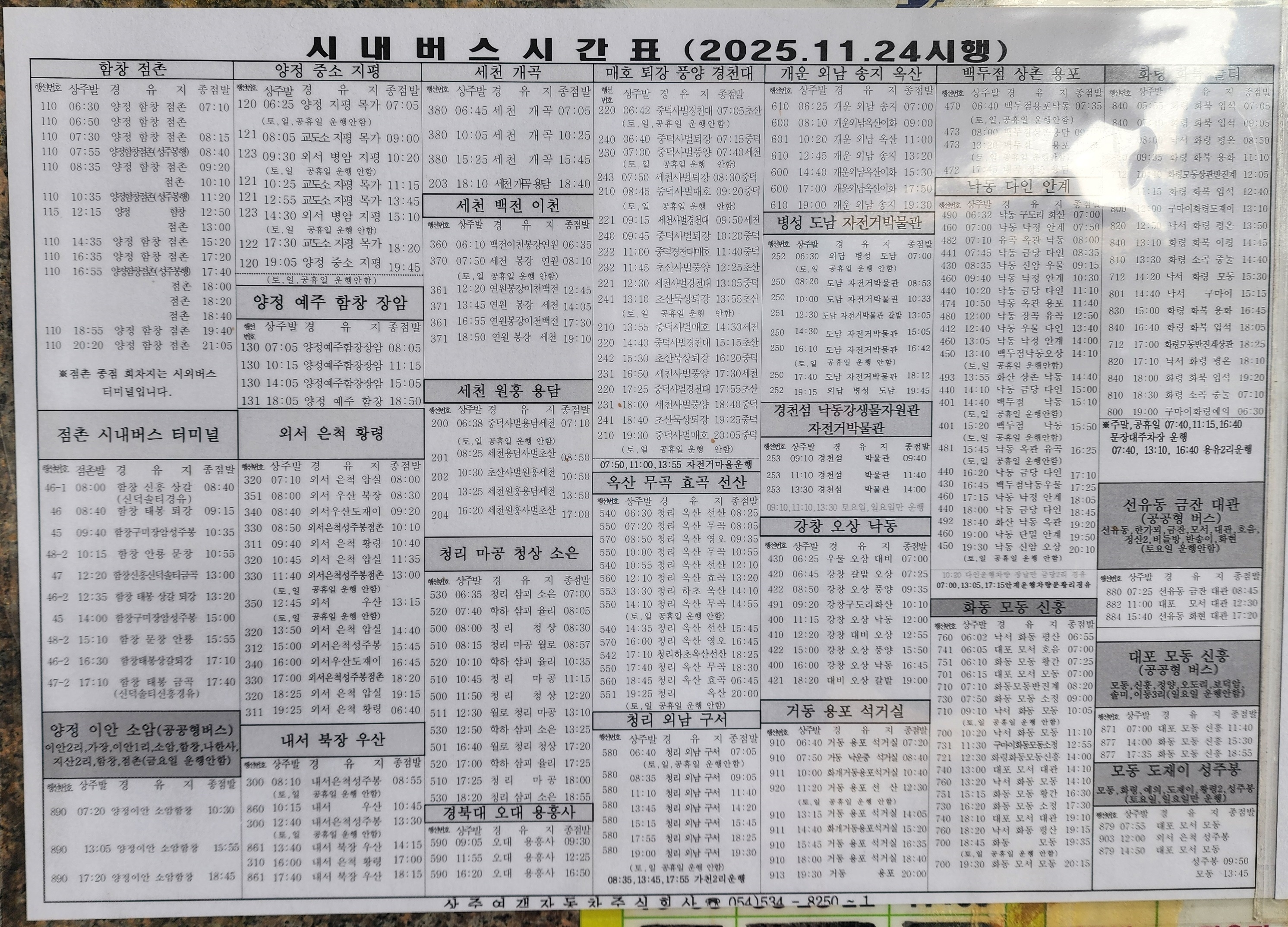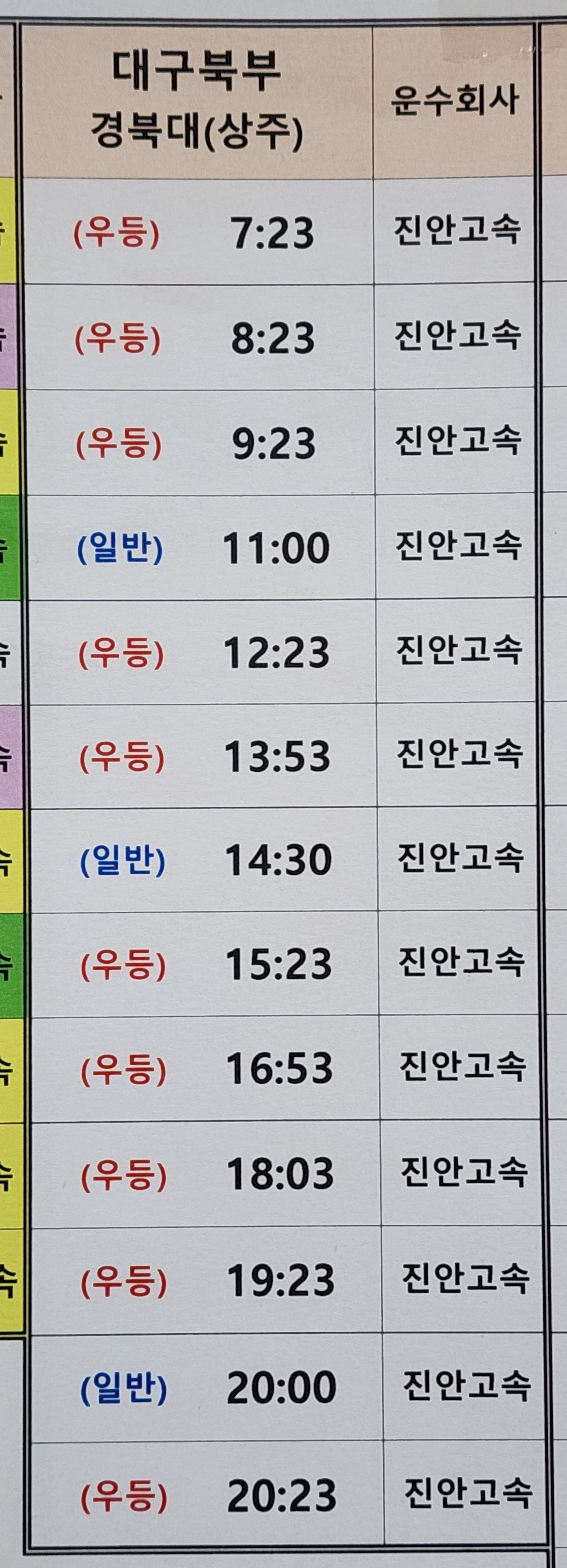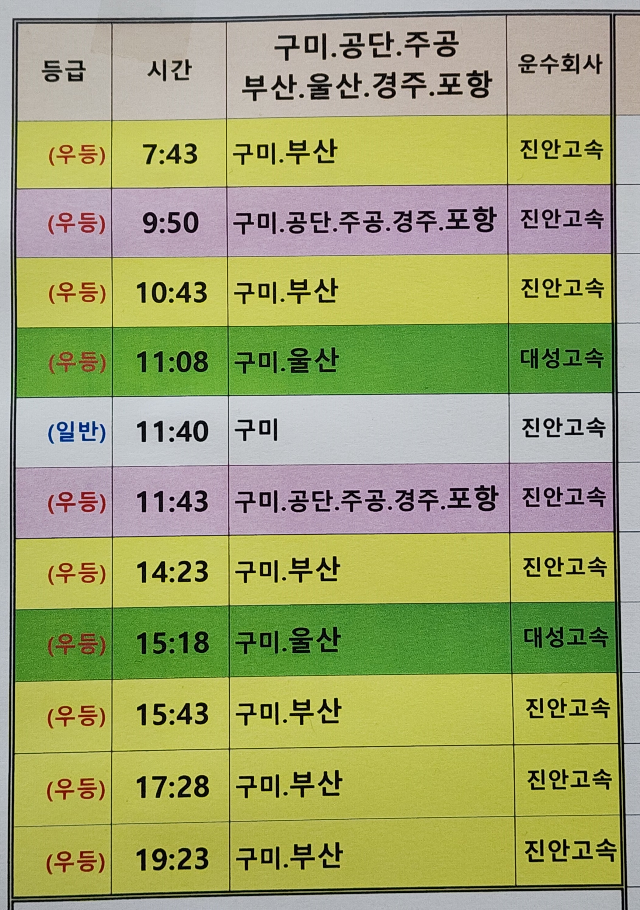 상주 출발 구미, 공단, 주공, 부산, 울산, 경주, 포항 방면.